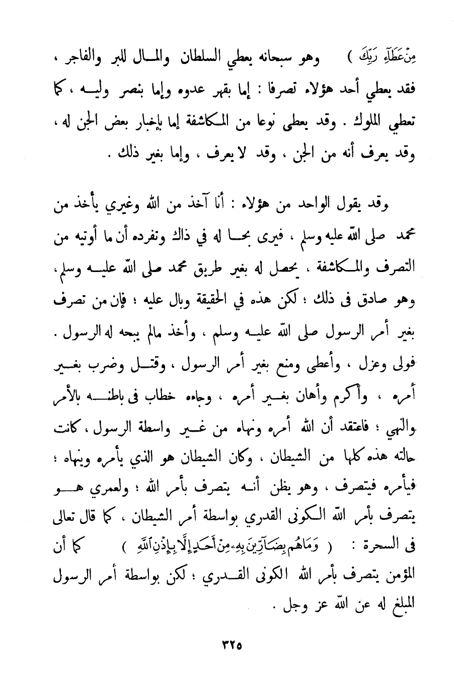 مِنْ عَطَاءِ رَبِّكَ} وَهُوَ سُبْحَانَهُ يُعْطِي السُّلْطَانَ وَالْمَالَ لِلْبَرِّ وَالْفَاجِرِ فَقَدْ يُعْطَى أَحَدُ هَؤُلَاءِ تَصَرُّفًا: إمَّا بِقَهْرِ عَدُوِّهِ وَإِمَّا بِنَصْرِ وَلِيِّهِ كَمَا تُعْطَى الْمُلُوكُ. وَقَدْ يُعْطَى نَوْعًا مِنْ الْمُكَاشَفَةِ إمَّا بِإِخْبَارِ بَعْضِ الْجِنِّ لَهُ وَقَدْ يَعْرِفُ أَنَّهُ مِنْ الْجِنِّ وَقَدْ لَا يَعْرِفُ وَإِمَّا بِغَيْرِ ذَلِكَ. وَقَدْ يَقُولُ الْوَاحِدُ مِنْ هَؤُلَاءِ: أَنَا آخُذُ مِنْ اللَّهِ وَغَيْرِي يَأْخُذُ مِنْ مُحَمَّدٍ صَلَّى اللَّهُ عَلَيْهِ وَسَلَّمَ فَيَرَى بِحَالِهِ فِي ذَاكَ وَتَفَرُّدِهِ أَنَّ مَا أُوتِيَهُ مِنْ التَّصَرُّفِ وَالْمُكَاشَفَةِ يَحْصُلُ لَهُ بِغَيْرِ طَرِيقِ مُحَمَّدٍ صَلَّى اللَّهُ عَلَيْهِ وَسَلَّمَ وَهُوَ صَادِقٌ فِي ذَلِكَ؛ لَكِنَّ هَذِهِ فِي الْحَقِيقَةِ وَبَالٌ عَلَيْهِ؛ فَإِنَّ مَنْ تَصَرَّفَ بِغَيْرِ أَمْرِ الرَّسُولِ صَلَّى اللَّهُ عَلَيْهِ وَسَلَّمَ وَأَخَذَ مَا لَمْ يُبِحْهُ لَهُ الرَّسُولُ. فَوَلَّى وَعَزَلَ وَأَعْطَى وَمَنَعَ بِغَيْرِ أَمْرِ الرَّسُولِ وَقَتَلَ وَضَرَبَ بِغَيْرِ أَمْرِهِ وَأَكْرَمَ وَأَهَانَ بِغَيْرِ أَمْرِهِ وَجَاءَهُ خِطَابٌ فِي بَاطِنِهِ بِالْأَمْرِ وَالنَّهْيِ؛ فَاعْتَقَدَ أَنَّ اللَّهَ أَمَرَهُ وَنَهَاهُ مِنْ غَيْرِ وَاسِطَةِ الرَّسُولِ كَانَتْ حَالَتُهُ هَذِهِ كُلُّهَا مِنْ الشَّيْطَانِ وَكَانَ الشَّيْطَانُ هُوَ الَّذِي يَأْمُرُهُ وَيَنْهَاهُ؛ فَيَأْمُرُهُ فَيَتَصَرَّفُ وَهُوَ يَظُنُّ أَنَّهُ يَتَصَرَّفُ بِأَمْرِ اللَّهِ؛ وَلَعَمْرِي هُوَ يَتَصَرَّفُ بِأَمْرِ اللَّهِ الْكَوْنِيِّ الْقَدَرِيِّ بِوَاسِطَةِ أَمْرِ الشَّيْطَانِ كَمَا قَالَ تَعَالَى فِي السَّحَرَةِ: {وَمَا هُمْ بِضَارِّينَ بِهِ مِنْ أَحَدٍ إلَّا بِإِذْنِ اللَّهِ} كَمَا أَنَّ الْمُؤْمِنَ يَتَصَرَّفُ بِأَمْرِ اللَّهِ الْكَوْنِيِّ الْقَدَرِيِّ؛ لَكِنْ بِوَاسِطَةِ أَمْرِ الرَّسُولِ الْمُبَلِّغِ لَهُ عَنْ اللَّهِ عَزَّ وَجَلَّ.