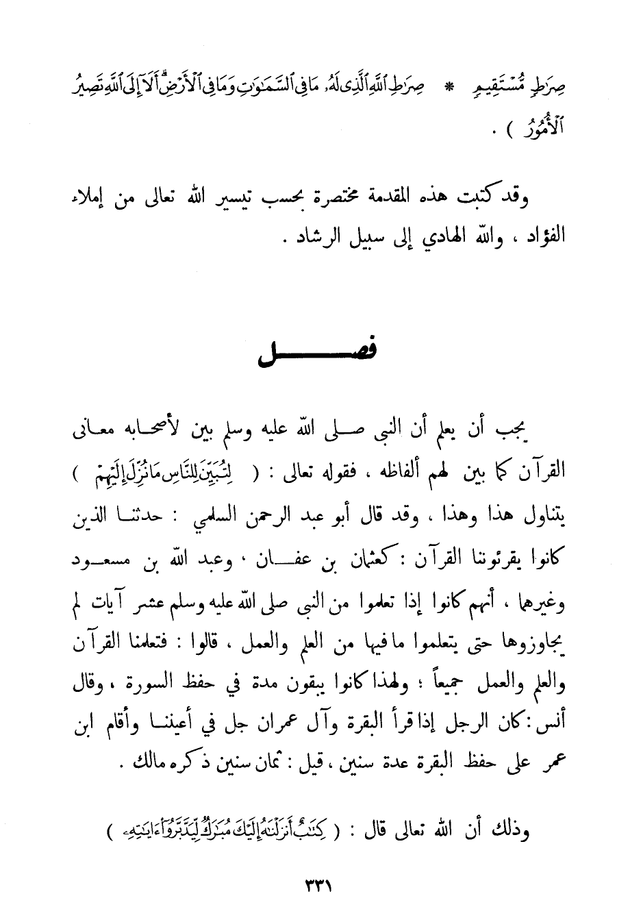 يَجِبُ أَنْ يُعْلَمَ أَنَّ النَّبِيَّ صَلَّى اللَّهُ عَلَيْهِ وَسَلَّمَ بَيَّنَ لِأَصْحَابِهِ مَعَانِيَ الْقُرْآنِ كَمَا بَيَّنَ لَهُمْ أَلْفَاظَهُ فَقَوْلُهُ تَعَالَى: {لِتُبَيِّنَ لِلنَّاسِ مَا نُزِّلَ إلَيْهِمْ} يَتَنَاوَلُ هَذَا وَهَذَا وَقَدْ قَالَ أَبُو عَبْدِ الرَّحْمَنِ السُّلَمِي: حَدَّثَنَا الَّذِينَ كَانُوا يُقْرِئُونَنَا الْقُرْآنَ: كَعُثْمَانِ بْنِ عفان وَعَبْدِ اللَّهِ بْنِ مَسْعُودٍ وَغَيْرِهِمَا أَنَّهُمْ كَانُوا إذَا تَعَلَّمُوا مِنْ النَّبِيِّ صَلَّى اللَّهُ عَلَيْهِ وَسَلَّمَ عَشْرَ آيَاتٍ لَمْ يُجَاوِزُوهَا حَتَّى يَتَعَلَّمُوا مَا فِيهَا مِنْ الْعِلْمِ وَالْعَمَلِ قَالُوا: فَتَعَلَّمْنَا الْقُرْآنَ وَالْعِلْمَ وَالْعَمَلَ جَمِيعًا؛ وَلِهَذَا كَانُوا يَبْقَوْنَ مُدَّةً فِي حِفْظِ السُّورَةِ وَقَالَ أَنَسٌ: كَانَ الرَّجُلُ إذَا قَرَأَ الْبَقَرَةَ وَآلَ عِمْرَانَ جَلَّ فِي أَعْيُنِنَا وَأَقَامَ ابْنُ عُمَرَ عَلَى حِفْظِ الْبَقَرَةِ عِدَّةَ سِنِينَ قِيلَ: ثَمَانِ سِنِينَ ذَكَرَهُ مَالِكٌ. وَذَلِكَ أَنَّ اللَّهَ تَعَالَى قَالَ: {كِتَابٌ أَنْزَلْنَاهُ إلَيْكَ مُبَارَكٌ لِيَدَّبَّرُوا