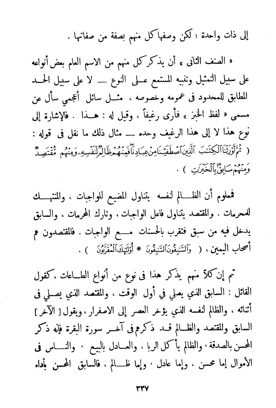 إلَى ذَاتٍ وَاحِدَةٍ؛ لَكِنْ وَصَفَهَا كُلٌّ مِنْهُمْ بِصِفَةِ مِنْ صِفَاتِهَا. " الصِّنْفُ الثَّانِي " أَنْ يَذْكُرَ كُلٌّ مِنْهُمْ مِنْ الِاسْمِ الْعَامِّ بَعْضَ أَنْوَاعِهِ عَلَى سَبِيلِ التَّمْثِيلِ وَتَنْبِيهِ الْمُسْتَمِعِ عَلَى النَّوْعِ - لَا عَلَى سَبِيلِ الْحَدِّ الْمُطَابِقِ لِلْمَحْدُودِ فِي عُمُومِهِ وَخُصُوصِهِ مِثْلَ سَائِلٍ أَعْجَمِيٍّ سَأَلَ عَنْ مُسَمَّى " لَفْظِ الْخُبْزِ " فَأُرِيَ رَغِيفًا وَقِيلَ لَهُ: هَذَا. فَالْإِشَارَةُ إلَى نَوْعِ هَذَا لَا إلَى هَذَا الرَّغِيفِ وَحْدَهُ - مِثَالُ ذَلِكَ مَا نُقِلَ فِي قَوْلِهِ: {ثُمَّ أَوْرَثْنَا الْكِتَابَ الَّذِينَ اصْطَفَيْنَا مِنْ عِبَادِنَا فَمِنْهُمْ ظَالِمٌ لِنَفْسِهِ وَمِنْهُمْ مُقْتَصِدٌ وَمِنْهُمْ سَابِقٌ بِالْخَيْرَاتِ} . فَمَعْلُومٌ أَنَّ الظَّالِمَ لِنَفْسِهِ يَتَنَاوَلُ الْمُضَيِّعَ لِلْوَاجِبَاتِ وَالْمُنْتَهِكَ لِلْمُحَرَّمَاتِ. وَالْمُقْتَصِدُ يَتَنَاوَلُ فَاعِلَ الْوَاجِبَاتِ وَتَارِكَ الْمُحَرَّمَاتِ وَالسَّابِقُ يَدْخُلُ فِيهِ مَنْ سَبَقَ فَتَقَرَّبَ بِالْحَسَنَاتِ مَعَ الْوَاجِبَاتِ. فَالْمُقْتَصِدُونَ هُمْ أَصْحَابُ الْيَمِينِ {وَالسَّابِقُونَ السَّابِقُونَ} {أُولَئِكَ الْمُقَرَّبُونَ} . ثُمَّ إنَّ كُلًّا مِنْهُمْ يَذْكُرُ هَذَا فِي نَوْعٍ مِنْ أَنْوَاعِ الطَّاعَاتِ كَقَوْلِ الْقَائِلِ: السَّابِقُ الَّذِي يُصَلِّي فِي أَوَّلِ الْوَقْتِ وَالْمُقْتَصِدُ الَّذِي يُصَلِّي فِي أَثْنَائِهِ وَالظَّالِمُ لِنَفْسِهِ الَّذِي يُؤَخِّرُ الْعَصْرَ إلَى الِاصْفِرَارِ وَيَقُولُ الْآخَرُ السَّابِقُ وَالْمُقْتَصِدُ وَالظَّالِمُ قَدْ ذَكَرَهُمْ فِي آخِرِ سُورَةِ الْبَقَرَةِ فَإِنَّهُ ذَكَرَ الْمُحْسِنَ بِالصَّدَقَةِ وَالظَّالِمَ بِأَكْلِ الرِّبَا وَالْعَادِلَ بِالْبَيْعِ وَالنَّاسُ فِي الْأَمْوَالِ إمَّا مُحْسِنٌ وَإِمَّا عَادِلٌ وَإِمَّا ظَالِمٌ فَالسَّابِقُ الْمُحْسِنُ بِأَدَاءِ
