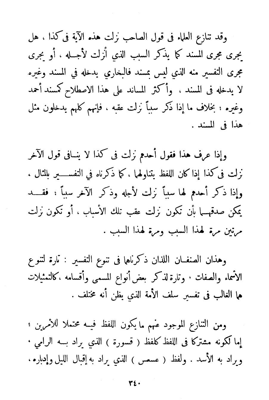 وَقَدْ تَنَازَعَ الْعُلَمَاءُ فِي قَوْلِ الصَّاحِبِ نَزَلَتْ هَذِهِ الْآيَةُ فِي كَذَا هَلْ يَجْرِي مَجْرَى الْمُسْنَدِ كَمَا يَذْكُرُ السَّبَبَ الَّذِي أُنْزِلَتْ لِأَجْلِهِ أَوْ يَجْرِي مَجْرَى التَّفْسِيرِ مِنْهُ الَّذِي لَيْسَ بِمُسْنَدِ فَالْبُخَارِيُّ يُدْخِلُهُ فِي الْمُسْنَدِ وَغَيْرُهُ لَا يُدْخِلُهُ فِي الْمُسْنَدِ وَأَكْثَرُ الْمَسَانِدِ عَلَى هَذَا الِاصْطِلَاحِ كَمُسْنَدِ أَحْمَد وَغَيْرِهِ؛ بِخِلَافِ مَا إذَا ذَكَرَ سَبَبًا نَزَلَتْ عَقِبَهُ فَإِنَّهُمْ كُلَّهُمْ يُدْخِلُونَ مِثْلَ هَذَا فِي الْمُسْنَدِ. وَإِذَا عُرِفَ هَذَا فَقَوْلُ أَحَدِهِمْ نَزَلَتْ فِي كَذَا لَا يُنَافِي قَوْلَ الْآخَرِ نَزَلَتْ فِي كَذَا إذَا كَانَ اللَّفْظُ يَتَنَاوَلُهُمَا كَمَا ذَكَرْنَاهُ فِي التَّفْسِيرِ بِالْمِثَالِ وَإِذَا ذَكَرَ أَحَدُهُمْ لَهَا سَبَبًا نَزَلَتْ لِأَجْلِهِ وَذَكَرَ الْآخَرُ سَبَبًا؛ فَقَدْ يُمْكِنُ صِدْقُهُمَا بِأَنْ تَكُونَ نَزَلَتْ عَقِبَ تِلْكَ الْأَسْبَابِ أَوْ تَكُونَ نَزَلَتْ مَرَّتَيْنِ مَرَّةً لِهَذَا السَّبَبِ وَمَرَّةً لِهَذَا السَّبَبِ. وَهَذَانِ الصِّنْفَانِ اللَّذَانِ ذَكَرْنَاهُمَا فِي تَنَوُّعِ التَّفْسِيرِ: تَارَةً لِتَنَوُّعِ الْأَسْمَاءِ وَالصِّفَاتِ وَتَارَةً لِذِكْرِ بَعْضِ أَنْوَاعِ الْمُسَمَّى وَأَقْسَامِهِ كَالتَّمْثِيلَاتِ هُمَا الْغَالِبُ فِي تَفْسِيرِ سَلَفِ الْأُمَّةِ الَّذِي يُظَنُّ أَنَّهُ مُخْتَلِفٌ. وَمِنْ التَّنَازُعِ الْمَوْجُودِ عَنْهُمْ مَا يَكُونُ اللَّفْظُ فِيهِ مُحْتَمِلًا لِلْأَمْرَيْنِ؛ إمَّا لِكَوْنِهِ مُشْتَرَكًا فِي اللَّفْظِ كَلَفْظِ (قَسْوَرَةٍ) الَّذِي يُرَادُ بِهِ الرَّامِي وَيُرَادُ بِهِ الْأَسَدُ. وَلَفْظِ (عَسْعَسَ) الَّذِي يُرَادُ بِهِ إقْبَالُ اللَّيْلِ وَإِدْبَارُهُ