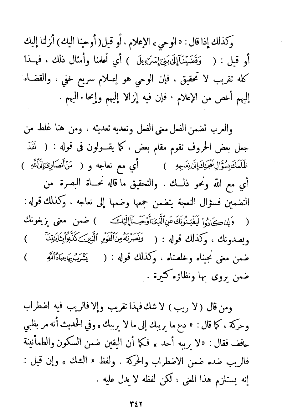 وَكَذَلِكَ إذَا قَالَ: " الْوَحْيُ " الْإِعْلَامُ أَوْ قِيلَ {أَوْحَيْنَا إلَيْكَ} أَنْزَلْنَا إلَيْك أَوْ قِيلَ: {وَقَضَيْنَا إلَى بَنِي إسْرائِيلَ} أَيْ أَعْلَمْنَا وَأَمْثَالُ ذَلِكَ فَهَذَا كُلُّهُ تَقْرِيبٌ لَا تَحْقِيقٌ فَإِنَّ الْوَحْيَ هُوَ إعْلَامٌ سَرِيعٌ خَفِيٌّ وَالْقَضَاءُ إلَيْهِمْ أَخَصُّ مِنْ الْإِعْلَامِ فَإِنَّ فِيهِ إنْزَالًا إلَيْهِمْ وَإِيحَاءً إلَيْهِمْ. وَالْعَرَبُ تُضَمِّنُ الْفِعْلَ مَعْنَى الْفِعْلِ وَتُعَدِّيهِ تَعْدِيَتَهُ وَمِنْ هُنَا غَلِطَ مَنْ جَعَلَ بَعْضَ الْحُرُوفِ تَقُومُ مَقَامَ بَعْضٍ كَمَا يَقُولُونَ فِي قَوْلِهِ: {لَقَدْ ظَلَمَكَ بِسُؤَالِ نَعْجَتِكَ إلَى نِعَاجِهِ} أَيْ مَعَ نِعَاجِهِ و {مَنْ أَنْصَارِي إلَى اللَّهِ} أَيْ مَعَ اللَّهِ وَنَحْوَ ذَلِكَ وَالتَّحْقِيقُ مَا قَالَهُ نُحَاةُ الْبَصْرَةِ مِنْ التَّضْمِينِ فَسُؤَالُ النَّعْجَةِ يَتَضَمَّنُ جَمْعَهَا وَضَمَّهَا إلَى نِعَاجِهِ وَكَذَلِكَ قَوْلُهُ: {وَإِنْ كَادُوا لَيَفْتِنُونَكَ عَنِ الَّذِي أَوْحَيْنَا إلَيْكَ} ضُمِّنَ مَعْنَى يُزِيغُونَك وَيَصُدُّونَك وَكَذَلِكَ قَوْلُهُ: {وَنَصَرْنَاهُ مِنَ الْقَوْمِ الَّذِينَ كَذَّبُوا بِآيَاتِنَا} ضُمِّنَ مَعْنَى نَجَّيْنَاهُ وَخَلَّصْنَاهُ وَكَذَلِكَ قَوْلُهُ: {يَشْرَبُ بِهَا عِبَادُ اللَّهِ} ضُمِّنَ يُرْوَى بِهَا وَنَظَائِرُهُ كَثِيرَةٌ. وَمَنْ قَالَ " لَا رَيْبَ لَا شَكَّ " فَهَذَا تَقْرِيبٌ وَإِلَّا فَالرَّيْبُ فِيهِ اضْطِرَابٌ وَحَرَكَةٌ كَمَا قَالَ: {دَعْ مَا يَرِيبُك إلَى مَا لَا يَرِيبُك} وَفِي الْحَدِيثِ أَنَّهُ {مَرَّ بِظَبْيٍ حَاقِفٍ فَقَالَ: لَا يَرِيبُهُ أَحَدٌ} فَكَمَا أَنَّ الْيَقِينَ ضُمِّنَ السُّكُونَ وَالطُّمَأْنِينَةَ فَالرَّيْبُ ضِدُّهُ ضُمِّنَ الِاضْطِرَابَ وَالْحَرَكَةَ. وَلَفْظُ " الشَّكِّ " وَإِنْ قِيلَ: إنَّهُ يَسْتَلْزِمُ هَذَا الْمَعْنَى؛ لَكِنَّ لَفْظَهُ لَا يَدُلُّ عَلَيْهِ.