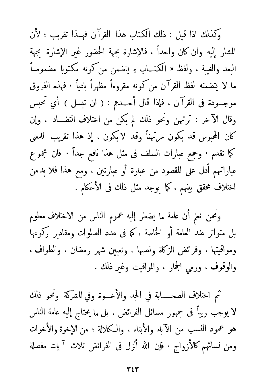 وَكَذَلِكَ إذَا قِيلَ: ذَلِكَ الْكِتَابُ هَذَا الْقُرْآنُ فَهَذَا تَقْرِيبٌ؛ لِأَنَّ الْمُشَارَ إلَيْهِ وَإِنْ كَانَ وَاحِدًا فَالْإِشَارَةُ بِجِهَةِ الْحُضُورِ غَيْرُ الْإِشَارَةِ بِجِهَةِ الْبُعْدِ وَالْغَيْبَةِ وَلَفْظُ " الْكِتَابِ " يَتَضَمَّنُ مِنْ كَوْنِهِ مَكْتُوبًا مَضْمُومًا مَا لَا يَتَضَمَّنُهُ لَفْظُ الْقُرْآنِ مِنْ كَوْنِهِ مَقْرُوءًا مُظْهَرًا بَادِيًا فَهَذِهِ الْفُرُوقُ مَوْجُودَةٌ فِي الْقُرْآنِ فَإِذَا قَالَ أَحَدُهُمْ: (أَنْ تُبْسَلَ أَيْ تَحْبِسَ وَقَالَ الْآخَرُ: تُرْتَهَنَ وَنَحْوَ ذَلِكَ لَمْ يَكُنْ مِنْ اخْتِلَافِ التَّضَادِّ وَإِنْ كَانَ الْمَحْبُوسُ قَدْ يَكُونُ مُرْتَهَنًا وَقَدْ لَا يَكُونُ إذْ هَذَا تَقْرِيبٌ لِلْمَعْنَى كَمَا تَقَدَّمَ وَجَمْعُ عِبَارَاتِ السَّلَفِ فِي مِثْلِ هَذَا نَافِعٌ جِدًّا؛ فَإِنَّ مَجْمُوعَ عِبَارَاتِهِمْ أَدَلُّ عَلَى الْمَقْصُودِ مِنْ عِبَارَةٍ أَوْ عِبَارَتَيْنِ وَمَعَ هَذَا فَلَا بُدَّ مِنْ اخْتِلَافٍ مُحَقَّقٍ بَيْنَهُمْ كَمَا يُوجَدُ مِثْلُ ذَلِكَ فِي الْأَحْكَامِ. وَنَحْنُ نَعْلَمُ أَنَّ عَامَّةَ مَا يُضْطَرُّ إلَيْهِ عُمُومُ النَّاسِ مِنْ الِاخْتِلَافِ مَعْلُومٌ بَلْ مُتَوَاتِرٌ عِنْدَ الْعَامَّةِ أَوْ الْخَاصَّةِ كَمَا فِي عَدَدِ الصَّلَوَاتِ وَمَقَادِيرِ رُكُوعِهَا وَمَوَاقِيتِهَا وَفَرَائِضِ الزَّكَاةِ وَنُصُبِهَا وَتَعْيِينِ شَهْرِ رَمَضَانَ وَالطَّوَافِ وَالْوُقُوفِ وَرَمْيِ الْجِمَارِ وَالْمَوَاقِيتِ وَغَيْرِ ذَلِكَ. ثُمَّ اخْتِلَافُ الصَّحَابَةِ فِي الْجَدِّ وَالْإِخْوَةِ وَفِي الْمُشَرَّكَةِ وَنَحْوِ ذَلِكَ لَا يُوجِبُ رَيْبًا فِي جُمْهُورِ مَسَائِلِ الْفَرَائِضِ بَلْ مَا يَحْتَاجُ إلَيْهِ عَامَّةُ النَّاسِ هُوَ عَمُودُ النَّسَبِ مِنْ الْآبَاءِ وَالْأَبْنَاءِ وَالْكَلَالَةِ؛ مِنْ الْإِخْوَةِ وَالْأَخَوَاتِ وَمِنْ نِسَائِهِمْ كَالْأَزْوَاجِ فَإِنَّ اللَّهَ أَنْزَلَ فِي الْفَرَائِضِ ثَلَاثَ آيَاتٍ مُفَصَّلَةٍ