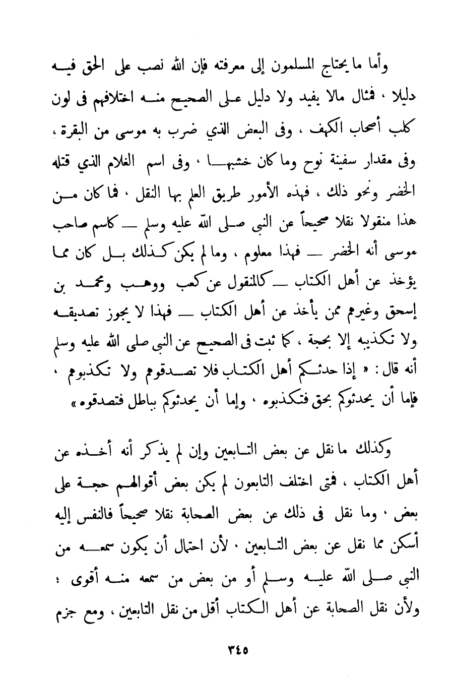 وَأَمَّا مَا يَحْتَاجُ الْمُسْلِمُونَ إلَى مَعْرِفَتِهِ فَإِنَّ اللَّهَ نَصَبَ عَلَى الْحَقِّ فِيهِ دَلِيلًا فَمِثَالُ مَا لَا يُفِيدُ وَلَا دَلِيلَ عَلَى الصَّحِيحِ مِنْهُ اخْتِلَافُهُمْ فِي لَوْنِ كَلْبِ أَصْحَابِ الْكَهْفِ وَفِي الْبَعْضِ الَّذِي ضَرَبَ بِهِ مُوسَى مِنْ الْبَقَرَةِ وَفِي مِقْدَارِ سَفِينَةِ نُوحٍ وَمَا كَانَ خَشَبُهَا وَفِي اسْمِ الْغُلَامِ الَّذِي قَتَلَهُ الْخَضِرُ وَنَحْوُ ذَلِكَ فَهَذِهِ الْأُمُورُ طَرِيقُ الْعِلْمِ بِهَا النَّقْلُ فَمَا كَانَ مِنْ هَذَا مَنْقُولًا نَقْلًا صَحِيحًا عَنْ النَّبِيِّ صَلَّى اللَّهُ عَلَيْهِ وَسَلَّمَ - كَاسْمِ صَاحِبِ مُوسَى أَنَّهُ الْخَضِرُ - فَهَذَا مَعْلُومٌ وَمَا لَمْ يَكُنْ كَذَلِكَ بَلْ كَانَ مِمَّا يُؤْخَذُ عَنْ أَهْلِ الْكِتَابِ - كَالْمَنْقُولِ عَنْ كَعْبٍ وَوَهْبٍ وَمُحَمَّدِ بْنِ إسْحَاقَ وَغَيْرِهِمْ مِمَّنْ يَأْخُذُ عَنْ أَهْلِ الْكِتَابِ - فَهَذَا لَا يَجُوزُ تَصْدِيقُهُ وَلَا تَكْذِيبُهُ إلَّا بِحُجَّةِ كَمَا ثَبَتَ فِي الصَّحِيحِ عَنْ النَّبِيِّ صَلَّى اللَّهُ عَلَيْهِ وَسَلَّمَ أَنَّهُ قَالَ: {إذَا حَدَّثَكُمْ أَهْلُ الْكِتَابِ فَلَا تُصَدِّقُوهُمْ وَلَا تُكَذِّبُوهُمْ فَإِمَّا أَنْ يُحَدِّثُوكُمْ بِحَقِّ فَتُكَذِّبُوهُ وَإِمَّا أَنْ يُحَدِّثُوكُمْ بِبَاطِلِ فَتُصَدِّقُوهُ} وَكَذَلِكَ مَا نُقِلَ عَنْ بَعْضِ التَّابِعِينَ وَإِنْ لَمْ يَذْكُرْ أَنَّهُ أَخَذَهُ عَنْ أَهْلِ الْكِتَابِ فَمَتَى اخْتَلَفَ التَّابِعُونَ لَمْ يَكُنْ بَعْضُ أَقْوَالِهِمْ حُجَّةً عَلَى بَعْضٍ وَمَا نُقِلَ فِي ذَلِكَ عَنْ بَعْضِ الصَّحَابَةِ نَقْلًا صَحِيحًا فَالنَّفْسُ إلَيْهِ أَسْكَنُ مِمَّا نُقِلَ عَنْ بَعْضِ التَّابِعِينَ لِأَنَّ احْتِمَالَ أَنْ يَكُونَ سَمِعَهُ مِنْ النَّبِيِّ صَلَّى اللَّهُ عَلَيْهِ وَسَلَّمَ أَوْ مِنْ بَعْضِ مَنْ سَمِعَهُ مِنْهُ أَقْوَى؛ وَلِأَنَّ نَقْلَ الصَّحَابَةِ عَنْ أَهْلِ الْكِتَابِ أَقَلُّ مِنْ نَقْلِ التَّابِعِينَ وَمَعَ جَزْمِ
