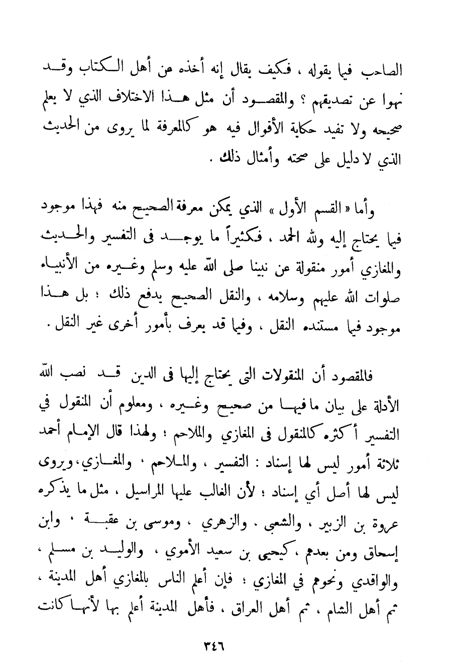 الصَّاحِبِ فِيمَا يَقُولُهُ فَكَيْفَ يُقَالُ إنَّهُ أَخَذَهُ عَنْ أَهْلِ الْكِتَابِ وَقَدْ نُهُوا عَنْ تَصْدِيقِهِمْ؟ وَالْمَقْصُودُ أَنَّ مِثْلَ هَذَا الِاخْتِلَافِ الَّذِي لَا يُعْلَمُ صَحِيحُهُ وَلَا تُفِيدُ حِكَايَةُ الْأَقْوَالِ فِيهِ هُوَ كَالْمَعْرِفَةِ لِمَا يُرْوَى مِنْ الْحَدِيثِ الَّذِي لَا دَلِيلَ عَلَى صِحَّتِهِ وَأَمْثَالِ ذَلِكَ. وَأَمَّا " الْقِسْمُ الْأَوَّلُ " الَّذِي يُمْكِنُ مَعْرِفَةُ الصَّحِيحِ مِنْهُ فَهَذَا مَوْجُودٌ فِيمَا يُحْتَاجُ إلَيْهِ وَلِلَّهِ الْحَمْدُ فَكَثِيرًا مَا يُوجَدُ فِي التَّفْسِيرِ وَالْحَدِيثِ وَالْمَغَازِي أُمُورٌ مَنْقُولَةٌ عَنْ نَبِيِّنَا صَلَّى اللَّهُ عَلَيْهِ وَسَلَّمَ وَغَيْرِهِ مِنْ الْأَنْبِيَاءِ صَلَوَاتُ اللَّهِ عَلَيْهِمْ وَسَلَامُهُ وَالنَّقْلُ الصَّحِيحُ يَدْفَعُ ذَلِكَ؛ بَلْ هَذَا مَوْجُودٌ فِيمَا مُسْتَنَدُهُ النَّقْلُ وَفِيمَا قَدْ يُعْرَفُ بِأُمُورِ أُخْرَى غَيْرِ النَّقْلِ. فَالْمَقْصُودُ أَنَّ الْمَنْقُولَاتِ الَّتِي يُحْتَاجُ إلَيْهَا فِي الدِّينِ قَدْ نَصَبَ اللَّهُ الْأَدِلَّةَ عَلَى بَيَانِ مَا فِيهَا مِنْ صَحِيحٍ وَغَيْرِهِ وَمَعْلُومٌ أَنَّ الْمَنْقُولَ فِي التَّفْسِيرِ أَكْثَرُهُ كَالْمَنْقُولِ فِي الْمَغَازِي وَالْمَلَاحِمِ؛ وَلِهَذَا قَالَ الْإِمَامُ أَحْمَد ثَلَاثَةُ أُمُورٍ لَيْسَ لَهَا إسْنَادٌ: التَّفْسِيرُ وَالْمَلَاحِمُ وَالْمَغَازِي وَيُرْوَى لَيْسَ لَهَا أَصْلٌ أَيْ إسْنَادٌ؛ لِأَنَّ الْغَالِبَ عَلَيْهَا الْمَرَاسِيلُ مِثْلُ مَا يَذْكُرُهُ عُرْوَةُ بْنُ الزُّبَيْرِ وَالشَّعْبِيُّ وَالزُّهْرِيُّ وَمُوسَى بْنُ عُقْبَةَ وَابْنُ إسْحَاقَ وَمَنْ بَعْدَهُمْ كَيَحْيَى بْنِ سَعِيدٍ الْأُمَوِيِّ وَالْوَلِيدِ بْنِ مُسْلِمٍ والواقدي وَنَحْوِهِمْ فِي الْمَغَازِي؛ فَإِنَّ أَعْلَمَ النَّاسِ بِالْمَغَازِي أَهْلُ الْمَدِينَةِ ثُمَّ أَهْلُ الشَّامِ ثُمَّ أَهْلُ الْعِرَاقِ فَأَهْلُ الْمَدِينَةِ أَعْلَمُ بِهَا لِأَنَّهَا كَانَتْ