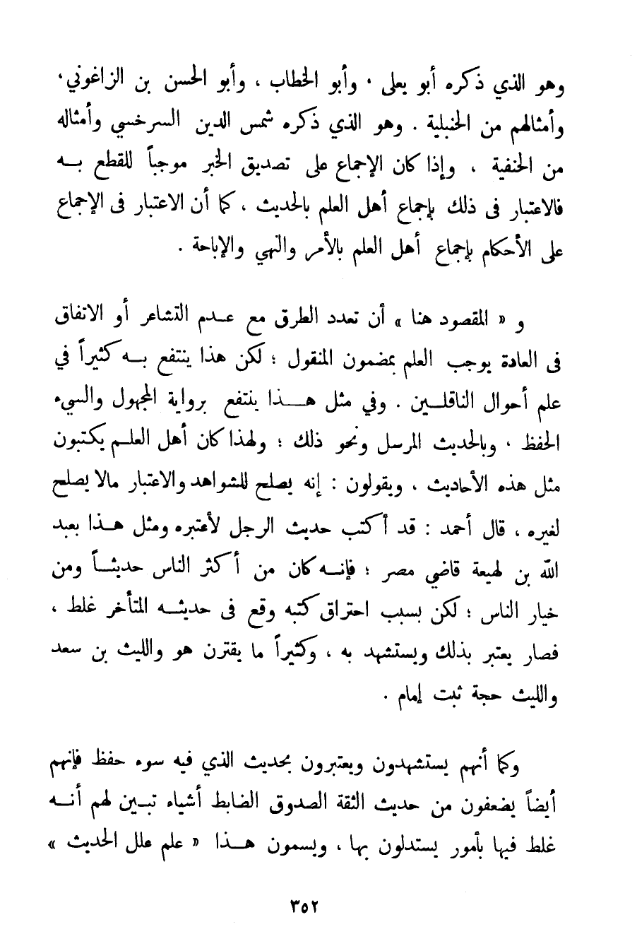 وَهُوَ الَّذِي ذَكَرَهُ أَبُو يَعْلَى وَأَبُو الْخَطَّابِ وَأَبُو الْحَسَنِ بْنُ الزَّاغُونِي وَأَمْثَالُهُمْ مِنْ الْحَنْبَلِيَّةِ. وَهُوَ الَّذِي ذَكَرَهُ شَمْسُ الدِّينِ السَّرَخْسِيُّ وَأَمْثَالُهُ مِنْ الْحَنَفِيَّةِ وَإِذَا كَانَ الْإِجْمَاعُ عَلَى تَصْدِيقِ الْخَبَرِ مُوجِبًا لِلْقَطْعِ بِهِ فَالِاعْتِبَارُ فِي ذَلِكَ بِإِجْمَاعِ أَهْلِ الْعِلْمِ بِالْحَدِيثِ كَمَا أَنَّ الِاعْتِبَارَ فِي الْإِجْمَاعِ عَلَى الْأَحْكَامِ بِإِجْمَاعِ أَهْلِ الْعِلْمِ بِالْأَمْرِ وَالنَّهْيِ وَالْإِبَاحَةِ. و " الْمَقْصُودُ هُنَا " أَنَّ تَعَدُّدَ الطُّرُقِ مَعَ عَدَمِ التَّشَاعُرِ أَوْ الِاتِّفَاقِ فِي الْعَادَةِ يُوجِبُ الْعِلْمَ بِمَضْمُونِ الْمَنْقُولِ؛ لَكِنَّ هَذَا يُنْتَفَعُ بِهِ كَثِيرًا فِي عِلْمِ أَحْوَالِ النَّاقِلِينَ. وَفِي مِثْلِ هَذَا يُنْتَفَعُ بِرِوَايَةِ الْمَجْهُولِ وَالسَّيِّئِ الْحِفْظِ وَبِالْحَدِيثِ الْمُرْسَلِ وَنَحْوِ ذَلِكَ؛ وَلِهَذَا كَانَ أَهْلُ الْعِلْمِ يَكْتُبُونَ مِثْلَ هَذِهِ الْأَحَادِيثِ وَيَقُولُونَ: إنَّهُ يَصْلُحُ لِلشَّوَاهِدِ وَالِاعْتِبَارِ مَا لَا يَصْلُحُ لِغَيْرِهِ قَالَ أَحْمَد: قَدْ أَكْتُبُ حَدِيثَ الرَّجُلِ لِأَعْتَبِرَهُ وَمَثَّلَ هَذَا بِعَبْدِ اللَّهِ بْنِ لَهِيعَةَ قَاضِي مِصْرَ؛ فَإِنَّهُ كَانَ مِنْ أَكْثَرِ النَّاسِ حَدِيثًا وَمِنْ خِيَارِ النَّاسِ؛ لَكِنْ بِسَبَبِ احْتِرَاقِ كُتُبِهِ وَقَعَ فِي حَدِيثِهِ الْمُتَأَخِّرِ غَلَطٌ فَصَارَ يَعْتَبِرُ بِذَلِكَ وَيَسْتَشْهِدُ بِهِ وَكَثِيرًا مَا يَقْتَرِنُ هُوَ وَاللَّيْثُ بْنُ سَعْدٍ وَاللَّيْثُ حُجَّةٌ ثَبَتٌ إمَامٌ. وَكَمَا أَنَّهُمْ يَسْتَشْهِدُونَ وَيَعْتَبِرُونَ بِحَدِيثِ الَّذِي فِيهِ سُوءُ حِفْظٍ فَإِنَّهُمْ أَيْضًا يُضَعِّفُونَ مِنْ حَدِيثِ الثِّقَةِ الصَّدُوقِ الضَّابِطِ أَشْيَاءَ تَبَيَّنَ لَهُمْ أَنَّهُ غَلِطَ فِيهَا بِأُمُورِ يَسْتَدِلُّونَ بِهَا وَيُسَمُّونَ هَذَا " عِلْمَ عِلَلِ الْحَدِيثِ "