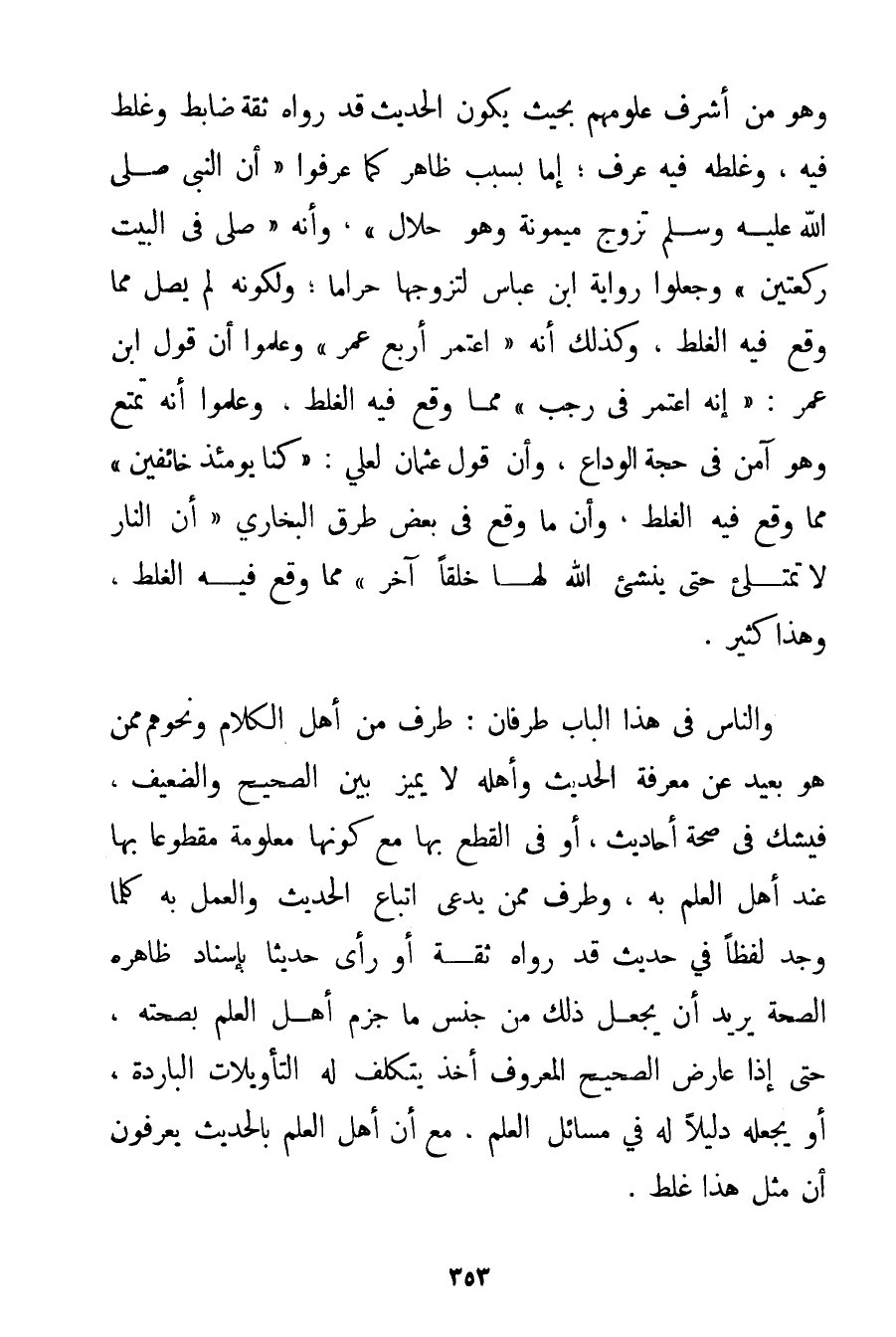 وَهُوَ مِنْ أَشْرَفِ عُلُومِهِمْ بِحَيْثُ يَكُونُ الْحَدِيثُ قَدْ رَوَاهُ ثِقَةٌ ضَابِطٌ وَغَلِطَ فِيهِ وَغَلَطُهُ فِيهِ عُرِفَ؛ إمَّا بِسَبَبِ ظَاهِرٍ كَمَا عَرَفُوا {أَنَّ النَّبِيَّ صَلَّى اللَّهُ عَلَيْهِ وَسَلَّمَ تَزَوَّجَ مَيْمُونَةَ وَهُوَ حَلَالٌ وَأَنَّهُ صَلَّى فِي الْبَيْتِ رَكْعَتَيْنِ} وَجَعَلُوا رِوَايَةَ ابْنِ عَبَّاسٍ لِتَزَوُّجِهَا حَرَامًا؛ وَلِكَوْنِهِ لَمْ يُصَلِّ مِمَّا وَقَعَ فِيهِ الْغَلَطُ وَكَذَلِكَ أَنَّهُ " اعْتَمَرَ أَرْبَعَ عُمَرٍ " وَعَلِمُوا أَنَّ قَوْلَ ابْنِ عُمَرَ: " إنَّهُ اعْتَمَرَ فِي رَجَبٍ " مِمَّا وَقَعَ فِيهِ الْغَلَطُ وَعَلِمُوا أَنَّهُ تَمَتَّعَ وَهُوَ آمِنٌ فِي حَجَّةِ الْوَدَاعِ وَأَنَّ قَوْلَ عُثْمَانَ لِعَلِيِّ: " كُنَّا يَوْمَئِذٍ خَائِفِينَ " مِمَّا وَقَعَ فِيهِ الْغَلَطُ وَأَنَّ مَا وَقَعَ فِي بَعْضِ طُرُقِ الْبُخَارِيِّ {أَنَّ النَّارَ لَا تَمْتَلِئُ حَتَّى يُنْشِئَ اللَّهُ لَهَا خَلْقًا آخَرَ} مِمَّا وَقَعَ فِيهِ الْغَلَطُ وَهَذَا كَثِيرٌ. وَالنَّاسُ فِي هَذَا الْبَابِ طَرَفَانِ: طَرَفٌ مِنْ أَهْلِ الْكَلَامِ وَنَحْوِهِمْ مِمَّنْ هُوَ بَعِيدٌ عَنْ مَعْرِفَةِ الْحَدِيثِ وَأَهْلِهِ لَا يُمَيِّزُ بَيْنَ الصَّحِيحِ وَالضَّعِيفِ فَيَشُكُّ فِي صِحَّةِ أَحَادِيثَ أَوْ فِي الْقَطْعِ بِهَا مَعَ كَوْنِهَا مَعْلُومَةً مَقْطُوعًا بِهَا عِنْدَ أَهْلِ الْعِلْمِ بِهِ وَطَرَفٌ مِمَّنْ يَدَّعِي اتِّبَاعَ الْحَدِيثِ وَالْعَمَلِ بِهِ كُلَّمَا وَجَدَ لَفْظًا فِي حَدِيثٍ قَدْ رَوَاهُ ثِقَةٌ أَوْ رَأَى حَدِيثًا بِإِسْنَادِ ظَاهِرُهُ الصِّحَّةُ يُرِيدُ أَنْ يَجْعَلَ ذَلِكَ مِنْ جِنْسِ مَا جَزَمَ أَهْلُ الْعِلْمِ بِصِحَّتِهِ حَتَّى إذَا عَارَضَ الصَّحِيحَ الْمَعْرُوفَ أَخَذَ يَتَكَلَّفُ لَهُ التَّأْوِيلَاتِ الْبَارِدَةَ أَوْ يَجْعَلُهُ دَلِيلًا لَهُ فِي مَسَائِلِ الْعِلْمِ مَعَ أَنَّ أَهْلَ الْعِلْمِ بِالْحَدِيثِ يَعْرِفُونَ أَنَّ مِثْلَ هَذَا غَلَطٌ.