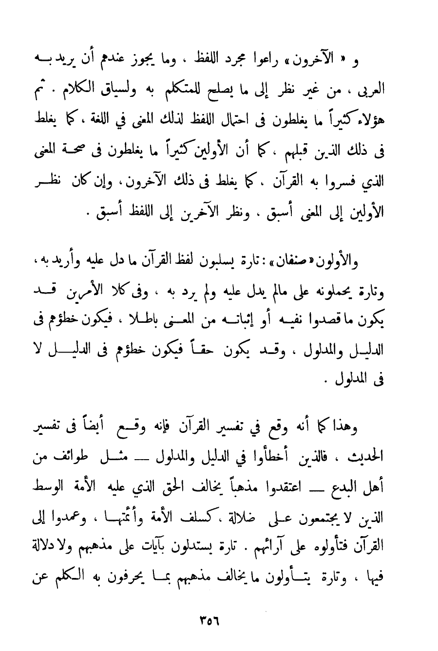 و " الْآخَرُونَ " رَاعَوْا مُجَرَّدَ اللَّفْظِ وَمَا يَجُوزُ عِنْدَهُمْ أَنْ يُرِيدَ بِهِ الْعَرَبِيُّ مِنْ غَيْرِ نَظَرٍ إلَى مَا يَصْلُحُ لِلْمُتَكَلِّمِ بِهِ وَلِسِيَاقِ الْكَلَامِ. ثُمَّ هَؤُلَاءِ كَثِيرًا مَا يَغْلَطُونَ فِي احْتِمَالِ اللَّفْظِ لِذَلِكَ الْمَعْنَى فِي اللُّغَةِ كَمَا يَغْلَطُ فِي ذَلِكَ الَّذِينَ قَبْلَهُمْ كَمَا أَنَّ الْأَوَّلِينَ كَثِيرًا مَا يَغْلَطُونَ فِي صِحَّةِ الْمَعْنَى الَّذِي فَسَّرُوا بِهِ الْقُرْآنَ كَمَا يَغْلَطُ فِي ذَلِكَ الآخرون وَإِنْ كَانَ نَظَرُ الْأَوَّلِينَ إلَى الْمَعْنَى أَسْبَقَ وَنَظَرُ الآخرين إلَى اللَّفْظِ أَسْبَقُ. وَالْأَوَّلُونَ " صِنْفَانِ ": تَارَةً يَسْلُبُونَ لَفْظَ الْقُرْآنِ مَا دَلَّ عَلَيْهِ وَأُرِيدَ بِهِ وَتَارَةً يَحْمِلُونَهُ عَلَى مَا لَمْ يَدُلَّ عَلَيْهِ وَلَمْ يُرَدْ بِهِ وَفِي كَلَا الْأَمْرَيْنِ قَدْ يَكُونُ مَا قَصَدُوا نَفْيَهُ أَوْ إثْبَاتَهُ مِنْ الْمَعْنَى بَاطِلًا فَيَكُونُ خَطَؤُهُمْ فِي الدَّلِيلِ وَالْمَدْلُولِ وَقَدْ يَكُونُ حَقًّا فَيَكُونُ خَطَؤُهُمْ فِي الدَّلِيلِ لَا فِي الْمَدْلُولِ. وَهَذَا كَمَا أَنَّهُ وَقَعَ فِي تَفْسِيرِ الْقُرْآنِ فَإِنَّهُ وَقَعَ أَيْضًا فِي تَفْسِيرِ الْحَدِيثِ فَاَلَّذِينَ أَخْطَئُوا فِي الدَّلِيلِ وَالْمَدْلُولِ - مِثْلُ طَوَائِفَ مِنْ أَهْلِ الْبِدَعِ - اعْتَقَدُوا مَذْهَبًا يُخَالِفُ الْحَقَّ الَّذِي عَلَيْهِ الْأُمَّةُ الْوَسَطُ الَّذِينَ لَا يَجْتَمِعُونَ عَلَى ضَلَالَةٍ كَسَلَفِ الْأُمَّةِ وَأَئِمَّتِهَا وَعَمَدُوا إلَى الْقُرْآنِ فَتَأَوَّلُوهُ عَلَى آرَائِهِمْ. تَارَةً يَسْتَدِلُّونَ بِآيَاتِ عَلَى مَذْهَبِهِمْ وَلَا دَلَالَةَ فِيهَا وَتَارَةً يَتَأَوَّلُونَ مَا يُخَالِفُ مَذْهَبَهُمْ بِمَا يُحَرِّفُونَ بِهِ الْكَلِمَ عَنْ