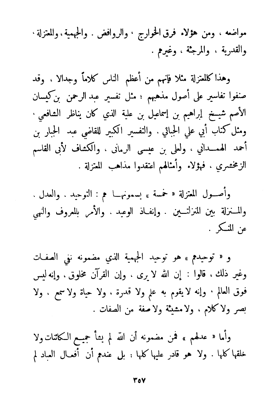 مَوَاضِعِهِ وَمِنْ هَؤُلَاءِ فِرَقُ الْخَوَارِجِ وَالرَّوَافِضِ وَالْجَهْمِيَّة وَالْمُعْتَزِلَةِ وَالْقَدَرِيَّةِ وَالْمُرْجِئَةِ وَغَيْرِهِمْ. وَهَذَا كَالْمُعْتَزِلَةِ مَثَلًا فَإِنَّهُمْ مِنْ أَعْظَمِ النَّاسِ كَلَامًا وَجِدَالًا وَقَدْ صَنَّفُوا تَفَاسِيرَ عَلَى أُصُولِ مَذْهَبِهِمْ؛ مِثْلِ تَفْسِيرِ عَبْدِ الرَّحْمَنِ بْنِ كيسان الْأَصَمِّ شَيْخِ إبْرَاهِيمَ بْنِ إسْمَاعِيلَ بْنِ عُلَيَّةَ الَّذِي كَانَ يُنَاظِرُ الشَّافِعِيَّ وَمِثْلِ كِتَابِ أَبِي عَلِيٍّ الجبائي وَالتَّفْسِيرِ الْكَبِيرِ لِلْقَاضِي عَبْدِ الْجَبَّارِ بْنِ أَحْمَد الهمداني وَلِعَلِيِّ بْنِ عِيسَى الرُّمَّانِيِّ وَالْكَشَّافِ لِأَبِي الْقَاسِمِ الزمخشري فَهَؤُلَاءِ وَأَمْثَالُهُمْ اعْتَقَدُوا مَذَاهِبَ الْمُعْتَزِلَةِ. وَأُصُولُ الْمُعْتَزِلَةِ " خَمْسَةٌ " يُسَمُّونَهَا هُمْ: التَّوْحِيدُ وَالْعَدْلُ وَالْمَنْزِلَةُ بَيْنَ الْمَنْزِلَتَيْنِ وَإِنْفَاذُ الْوَعِيدِ وَالْأَمْرُ بِالْمَعْرُوفِ وَالنَّهْيُ عَنْ الْمُنْكَرِ. و " تَوْحِيدُهُمْ " هُوَ تَوْحِيدُ الْجَهْمِيَّة الَّذِي مَضْمُونُهُ نَفْيُ الصِّفَاتِ وَغَيْرُ ذَلِكَ قَالُوا: إنَّ اللَّهَ لَا يُرَى وَإِنَّ الْقُرْآنَ مَخْلُوقٌ وَإِنَّهُ لَيْسَ فَوْقَ الْعَالَمِ وَإِنَّهُ لَا يَقُومُ بِهِ عِلْمٌ وَلَا قُدْرَةٌ وَلَا حَيَاةٌ وَلَا سَمْعٌ وَلَا بَصَرٌ وَلَا كَلَامٌ وَلَا مَشِيئَةٌ وَلَا صِفَةٌ مِنْ الصِّفَاتِ. وَأَمَّا " عَدْلُهُمْ " فَمِنْ مَضْمُونِهِ أَنَّ اللَّهَ لَمْ يَشَأْ جَمِيعَ الْكَائِنَاتِ وَلَا خَلَقَهَا كُلَّهَا وَلَا هُوَ قَادِرٌ عَلَيْهَا كُلِّهَا؛ بَلْ عِنْدَهُمْ أَنَّ أَفْعَالَ الْعِبَادِ لَمْ