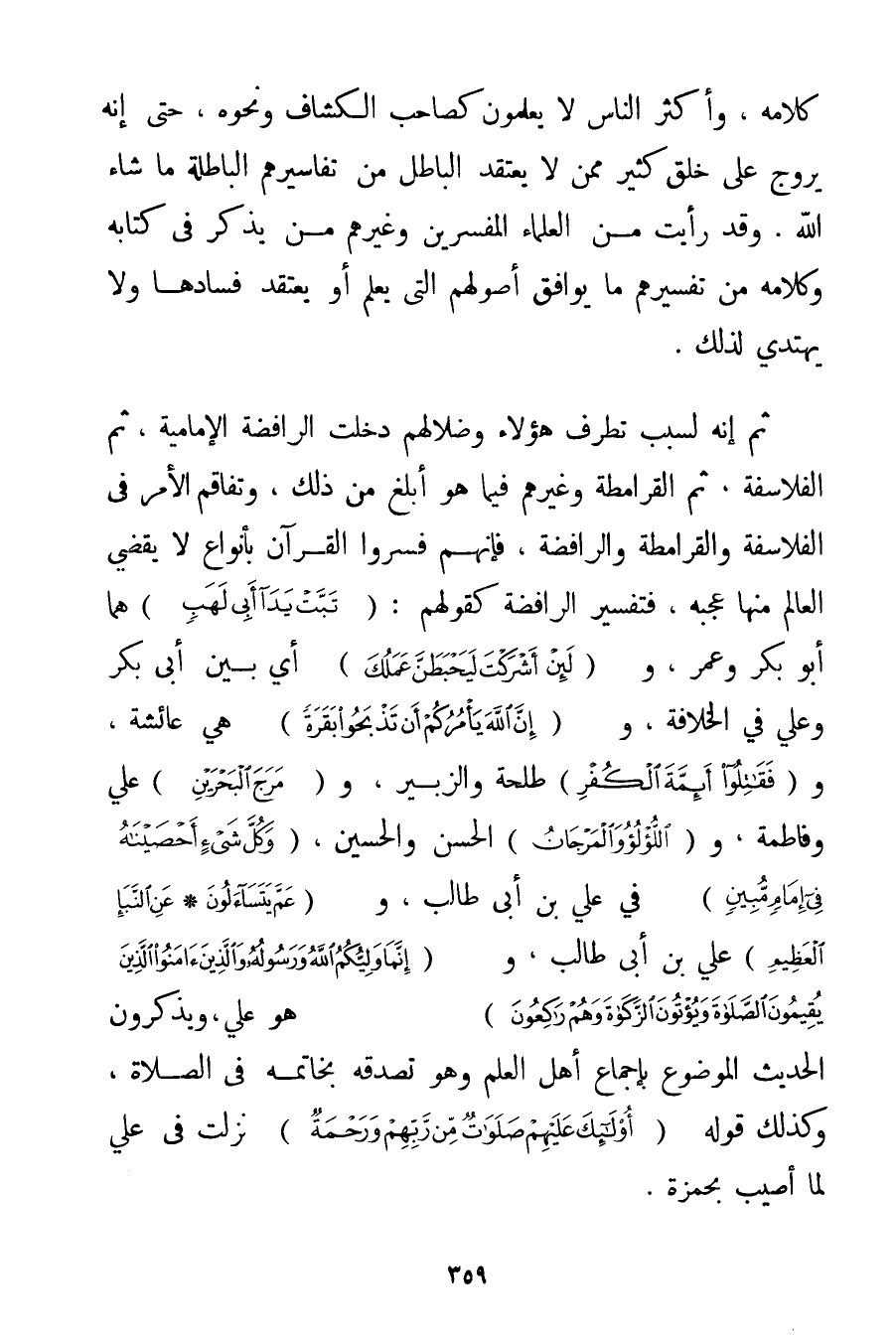 كَلَامِهِ وَأَكْثَرُ النَّاسِ لَا يَعْلَمُونَ كَصَاحِبِ الْكَشَّافِ وَنَحْوِهِ حَتَّى إنَّهُ يُرَوِّجُ عَلَى خَلْقٍ كَثِيرٍ مِمَّنْ لَا يَعْتَقِدُ الْبَاطِلَ مِنْ تَفَاسِيرِهِمْ الْبَاطِلَةِ مَا شَاءَ اللَّهُ. وَقَدْ رَأَيْت مِنْ الْعُلَمَاءِ الْمُفَسِّرِينَ وَغَيْرِهِمْ مَنْ يَذْكُرُ فِي كِتَابِهِ وَكَلَامِهِ مِنْ تَفْسِيرِهِمْ مَا يُوَافِقُ أُصُولَهُمْ الَّتِي يَعْلَمُ أَوْ يَعْتَقِدُ فَسَادَهَا وَلَا يَهْتَدِي لِذَلِكَ. ثُمَّ إنَّهُ لِسَبَبِ تَطَرُّفِ هَؤُلَاءِ وَضَلَالِهِمْ دَخَلَتْ الرَّافِضَةُ الْإِمَامِيَّةُ ثُمَّ الْفَلَاسِفَةُ ثُمَّ الْقَرَامِطَةُ وَغَيْرُهُمْ فِيمَا هُوَ أَبْلَغُ مِنْ ذَلِكَ وَتَفَاقَمَ الْأَمْرِ فِي الْفَلَاسِفَةِ وَالْقَرَامِطَةِ وَالرَّافِضَةِ فَإِنَّهُمْ فَسَّرُوا الْقُرْآنَ بِأَنْوَاعِ لَا يَقْضِي الْعَالِمُ مِنْهَا عَجَبَهُ فَتَفْسِيرُ الرَّافِضَةِ كَقَوْلِهِمْ: {تَبَّتْ يَدَا أَبِي لَهَبٍ} هُمَا أَبُو بَكْرٍ وَعُمَرُ و {لَئِنْ أَشْرَكْتَ لَيَحْبَطَنَّ عَمَلُكَ} أَيْ بَيْنَ أَبِي بَكْرٍ وَعَلِيٍّ فِي الْخِلَافَةِ و {إنَّ اللَّهَ يَأْمُرُكُمْ أَنْ تَذْبَحُوا بَقَرَةً} هِيَ عَائِشَةُ، وَ {فَقَاتِلُوا أَئِمَّةَ الْكُفْرِ} طَلْحَةَ وَالزُّبَيْرَ و {مَرَجَ الْبَحْرَيْنِ} عَلِيٌّ وَفَاطِمَةُ و {اللُّؤْلُؤُ وَالْمَرْجَانُ} الْحَسَنُ وَالْحُسَيْنُ {وَكُلَّ شَيْءٍ أحْصَيْنَاهُ فِي إمَامٍ مُبِينٍ} فِي عَلِيِّ بْنِ أَبِي طَالِبٍ و {عَمَّ يَتَسَاءَلُونَ} {عَنِ النَّبَإِ الْعَظِيمِ} عَلِيِّ بْنِ أَبِي طَالِبٍ و {إنَّمَا وَلِيُّكُمُ اللَّهُ وَرَسُولُهُ وَالَّذِينَ آمَنُوا الَّذِينَ يُقِيمُونَ الصَّلَاةَ وَيُؤْتُونَ الزَّكَاةَ وَهُمْ رَاكِعُونَ} هُوَ عَلِيٌّ وَيَذْكُرُونَ الْحَدِيثَ الْمَوْضُوعَ بِإِجْمَاعِ أَهْلِ الْعِلْمِ وَهُوَ تَصَدُّقُهُ بِخَاتَمِهِ فِي الصَّلَاةِ وَكَذَلِكَ قَوْلُهُ {أُولَئِكَ عَلَيْهِمْ صَلَوَاتٌ مِنْ رَبِّهِمْ وَرَحْمَةٌ} نَزَلَتْ فِي عَلِيٍّ لَمَّا أُصِيبَ بِحَمْزَةِ.