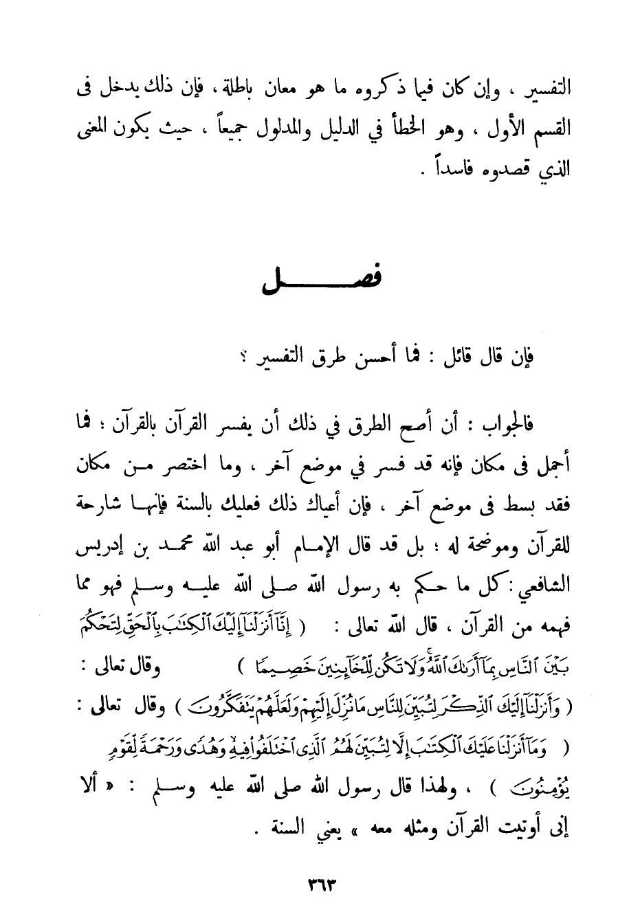 فَإِنْ قَالَ قَائِلٌ: فَمَا أَحْسَنُ طُرُقِ التَّفْسِيرِ؟ فَالْجَوَابُ: أَنَّ أَصَحَّ الطُّرُقِ فِي ذَلِكَ أَنْ يُفَسَّرَ الْقُرْآنُ بِالْقُرْآنِ؛ فَمَا أُجْمِلَ فِي مَكَانٍ فَإِنَّهُ قَدْ فُسِّرَ فِي مَوْضِعٍ آخَرَ وَمَا اُخْتُصِرَ مِنْ مَكَانٍ فَقَدْ بُسِطَ فِي مَوْضِعٍ آخَرَ فَإِنْ أَعْيَاك ذَلِكَ فَعَلَيْك بِالسُّنَّةِ فَإِنَّهَا شَارِحَةٌ لِلْقُرْآنِ وَمُوَضِّحَةٌ لَهُ؛ بَلْ قَدْ قَالَ الْإِمَامُ أَبُو عَبْدِ اللَّهِ مُحَمَّدُ بْنُ إدْرِيسَ الشَّافِعِيُّ: كُلُّ مَا حَكَمَ بِهِ رَسُولُ اللَّهِ صَلَّى اللَّهُ عَلَيْهِ وَسَلَّمَ فَهُوَ مِمَّا فَهِمَهُ مِنْ الْقُرْآنِ قَالَ اللَّهُ تَعَالَى: {إنَّا أَنْزَلْنَا إلَيْكَ الْكِتَابَ بِالْحَقِّ لِتَحْكُمَ بَيْنَ النَّاسِ بِمَا أَرَاكَ اللَّهُ وَلَا تَكُنْ لِلْخَائِنِينَ خَصِيمًا} وَقَالَ تَعَالَى: {وَأَنْزَلْنَا إلَيْكَ الذِّكْرَ لِتُبَيِّنَ لِلنَّاسِ مَا نُزِّلَ إلَيْهِمْ وَلَعَلَّهُمْ يَتَفَكَّرُونَ} وَقَالَ تَعَالَى: {وَمَا أَنْزَلْنَا عَلَيْكَ الْكِتَابَ إلَّا لِتُبَيِّنَ لَهُمُ الَّذِي اخْتَلَفُوا فِيهِ وَهُدًى وَرَحْمَةً لِقَوْمٍ يُؤْمِنُونَ} وَلِهَذَا قَالَ رَسُولُ اللَّهِ صَلَّى اللَّهُ عَلَيْهِ وَسَلَّمَ {أَلَا إنِّي أُوتِيت الْقُرْآنَ وَمِثْلَهُ مَعَهُ} " يَعْنِي السُّنَّةَ.