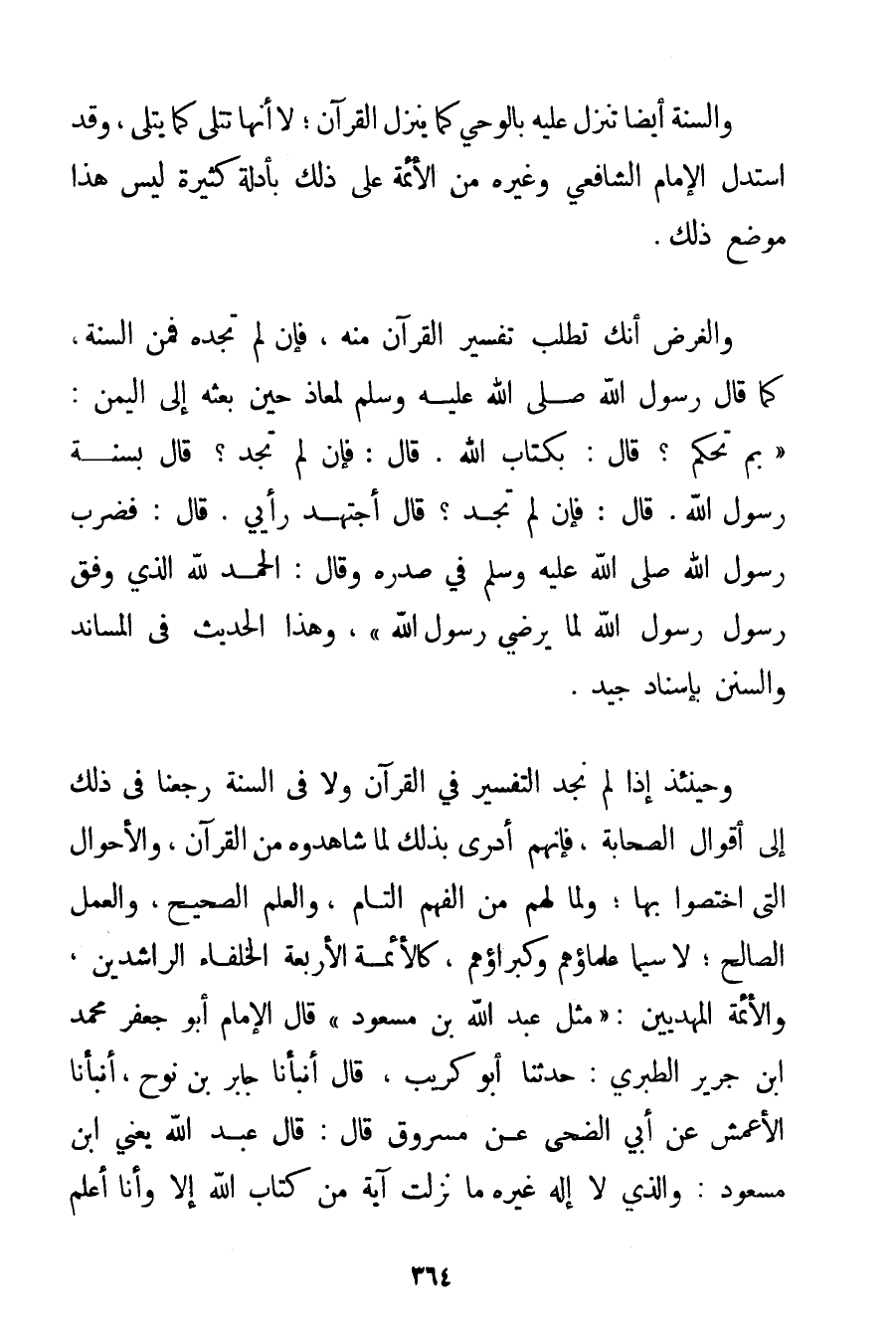وَالسُّنَّةُ أَيْضًا تَنْزِلُ عَلَيْهِ بِالْوَحْيِ كَمَا يَنْزِلُ الْقُرْآنُ؛ لَا أَنَّهَا تُتْلَى كَمَا يُتْلَى وَقَدْ اسْتَدَلَّ الْإِمَامُ الشَّافِعِيُّ وَغَيْرُهُ مِنْ الْأَئِمَّةِ عَلَى ذَلِكَ بِأَدِلَّةِ كَثِيرَةٍ لَيْسَ هَذَا مَوْضِعَ ذَلِكَ. وَالْغَرَضُ أَنَّك تَطْلُبُ تَفْسِيرَ الْقُرْآنِ مِنْهُ فَإِنْ لَمْ تَجِدْهُ فَمِنْ السُّنَّةِ كَمَا {قَالَ رَسُولُ اللَّهِ صَلَّى اللَّهُ عَلَيْهِ وَسَلَّمَ لِمُعَاذِ حِينَ بَعَثَهُ إلَى الْيَمَنِ: بِمَ تَحْكُمُ؟ قَالَ: بِكِتَابِ اللَّهِ. قَالَ: فَإِنْ لَمْ تَجِدْ؟ قَالَ بِسُنَّةِ رَسُولِ اللَّهِ. قَالَ: فَإِنْ لَمْ تَجِدْ؟ قَالَ أَجْتَهِدُ رَأْيِي. قَالَ: فَضَرَبَ رَسُولُ اللَّهِ صَلَّى اللَّهُ عَلَيْهِ وَسَلَّمَ فِي صَدْرِهِ وَقَالَ: الْحَمْدُ لِلَّهِ الَّذِي وَفَّقَ رَسُولَ رَسُولِ اللَّهِ لِمَا يُرْضِي رَسُولَ اللَّهِ} " وَهَذَا الْحَدِيثُ فِي الْمَسَانِدِ وَالسُّنَنِ بِإِسْنَادِ جَيِّدٍ. وَحِينَئِذٍ إذَا لَمْ نَجِدْ التَّفْسِيرَ فِي الْقُرْآنِ وَلَا فِي السُّنَّةِ رَجَعْنَا فِي ذَلِكَ إلَى أَقْوَالِ الصَّحَابَةِ فَإِنَّهُمْ أَدْرَى بِذَلِكَ لِمَا شَاهَدُوهُ مِنْ الْقُرْآنِ وَالْأَحْوَالِ الَّتِي اخْتَصُّوا بِهَا؛ وَلِمَا لَهُمْ مِنْ الْفَهْمِ التَّامِّ وَالْعِلْمِ الصَّحِيحِ وَالْعَمَلِ الصَّالِحِ؛ لَا سِيَّمَا عُلَمَاؤُهُمْ وَكُبَرَاؤُهُمْ كَالْأَئِمَّةِ الْأَرْبَعَةِ الْخُلَفَاءِ الرَّاشِدِينَ وَالْأَئِمَّةِ الْمَهْدِيِّينَ: " مِثْلِ عَبْدِ اللَّهِ بْنِ مَسْعُودٍ " قَالَ الْإِمَامُ أَبُو جَعْفَرٍ مُحَمَّدُ بْنُ جَرِيرٍ الطبري: حَدَّثَنَا أَبُو كريب قَالَ أَنْبَأَنَا جَابِرُ بْنُ نُوحٍ أَنْبَأَنَا الْأَعْمَشُ عَنْ أَبِي الضُّحَى عَنْ مَسْرُوقٍ قَالَ: قَالَ عَبْدُ اللَّهِ يَعْنِي ابْنَ مَسْعُودٍ: وَاَلَّذِي لَا إلَهَ غَيْرُهُ مَا نَزَلَتْ آيَةٌ مِنْ كِتَابِ اللَّهِ إلَّا وَأَنَا أَعْلَمُ
