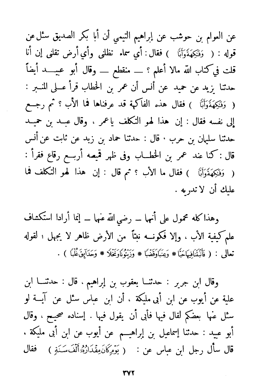 عَنْ الْعَوَّامِ بْنِ حوشب عَنْ إبْرَاهِيمَ التيمي أَنَّ أَبَا بَكْرٍ الصِّدِّيقَ سُئِلَ عَنْ قَوْلِهِ: {وَفَاكِهَةً وَأَبًّا} فَقَالَ: أَيُّ سَمَاءٍ تُظِلُّنِي وَأَيُّ أَرْضٍ تُقِلُّنِي إنْ أَنَا قُلْت فِي كِتَابِ اللَّهِ مَا لَا أَعْلَمُ؟ - مُنْقَطِعٌ - وَقَالَ أَبُو عُبَيْدٍ أَيْضًا حَدَّثَنَا يَزِيدُ عَنْ حميد عَنْ أَنَسٍ أَنَّ عُمَرَ بْنَ الْخَطَّابِ قَرَأَ عَلَى الْمِنْبَرِ: {وَفَاكِهَةً وَأَبًّا} فَقَالَ هَذِهِ الْفَاكِهَةُ قَدْ عَرَفْنَاهَا فَمَا الْأَبُّ؟ ثُمَّ رَجَعَ إلَى نَفْسِهِ فَقَالَ: إنَّ هَذَا لَهُوَ التَّكَلُّفُ يَا عُمَرُ وَقَالَ عَبْدُ بْنُ حميد حَدَّثَنَا سُلَيْمَانُ بْنُ حَرْبٍ قَالَ: حَدَّثَنَا حَمَّادُ بْنُ زَيْدٍ عَنْ ثَابِتٍ عَنْ أَنَسٍ قَالَ: كُنَّا عِنْدَ عُمَرَ بْنِ الْخَطَّابِ وَفِي ظَهْرِ قَمِيصِهِ أَرْبَعُ رِقَاعٍ فَقَرَأَ: {وَفَاكِهَةً وَأَبًّا} فَقَالَ مَا الْأَبُّ؟ ثُمَّ قَالَ: إنَّ هَذَا لَهُوَ التَّكَلُّفُ فَمَا عَلَيْك أَنْ لَا تَدْرِيهِ. وَهَذَا كُلُّهُ مَحْمُولٌ عَلَى أَنَّهُمَا - رَضِيَ اللَّهُ عَنْهُمَا - إنَّمَا أَرَادَا اسْتِكْشَافَ عِلْمِ كَيْفِيَّةِ الْأَبِّ وَإِلَّا فَكَوْنُهُ نَبْتًا مِنْ الْأَرْضِ ظَاهِرٌ لَا يُجْهَلُ؛ لِقَوْلِهِ تَعَالَى تَعَالَى: {فَأَنْبَتْنَا فِيهَا حَبًّا} {وَعِنَبًا وَقَضْبًا} {وَزَيْتُونًا وَنَخْلًا} {وَحَدَائِقَ غُلْبًا} . وَقَالَ ابْنُ جَرِيرٍ: حَدَّثَنَا يَعْقُوبُ بْنُ إبْرَاهِيمَ قَالَ: حَدَّثَنَا ابْنُ عُلَيَّةَ عَنْ أَيُّوبَ عَنْ ابْنِ أَبِي مُلَيْكَةَ أَنَّ ابْنَ عَبَّاسٍ سُئِلَ عَنْ آيَةٍ لَوْ سُئِلَ عَنْهَا بَعْضُكُمْ لَقَالَ فِيهَا فَأَبَى أَنْ يَقُولَ فِيهَا. إسْنَادُهُ صَحِيحٌ وَقَالَ أَبُو عُبَيْدٍ: حَدَّثَنَا إسْمَاعِيلُ بْنُ إبْرَاهِيمَ عَنْ أَيُّوبَ عَنْ ابْنِ أَبِي مُلَيْكَةَ قَالَ سَأَلَ رَجُلٌ ابْنَ عَبَّاسٍ عَنْ: {يَوْمٍ كَانَ مِقْدَارُهُ أَلْفَ سَنَةٍ} فَقَالَ لَهُ
