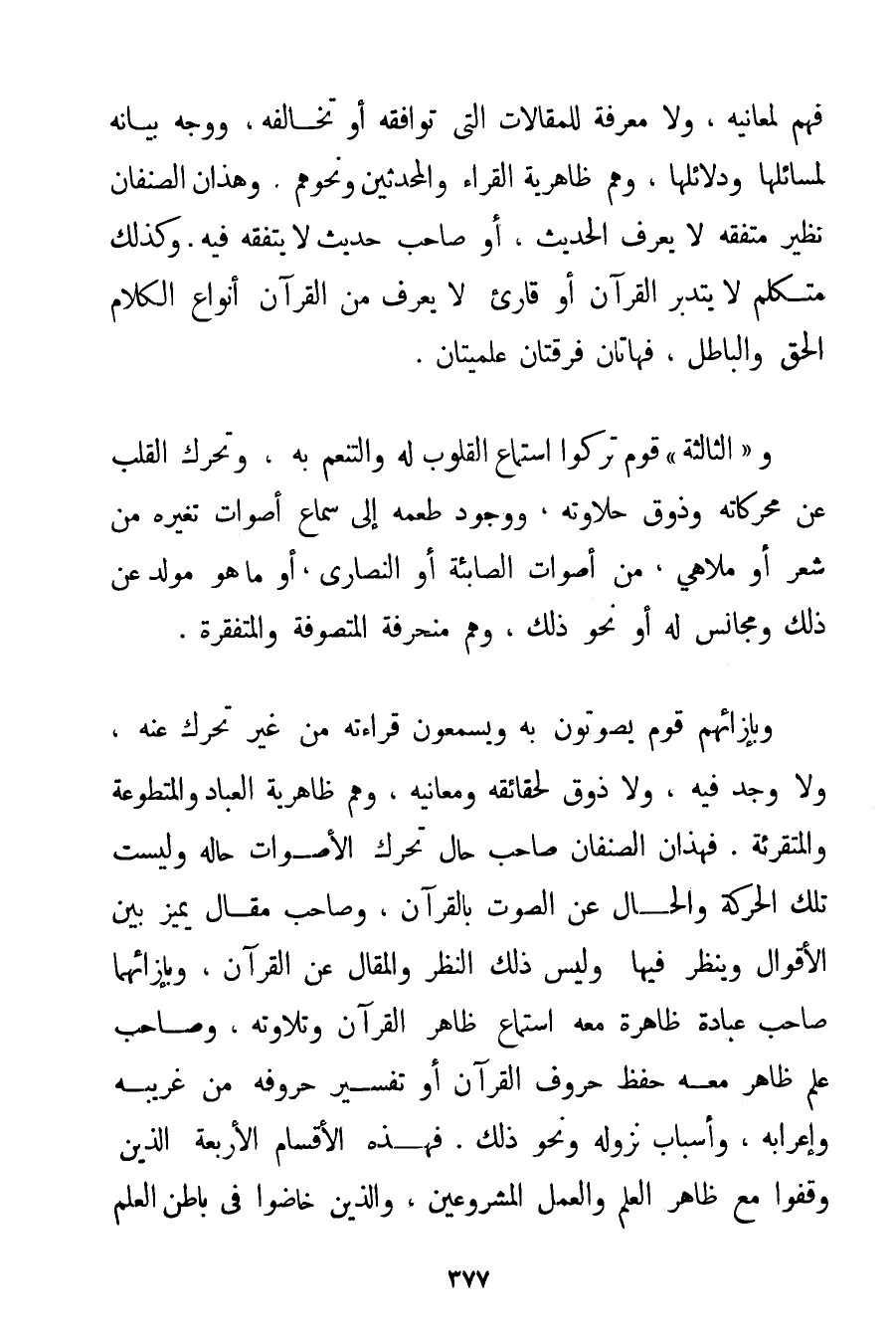 فَهْمٍ لِمَعَانِيهِ وَلَا مَعْرِفَةٍ لِلْمَقَالَاتِ الَّتِي تُوَافِقُهُ أَوْ تُخَالِفُهُ وَوَجْهِ بَيَانِهِ لِمَسَائِلِهَا وَدَلَائِلِهَا وَهُمْ ظَاهِرِيَّةُ الْقُرَّاءِ وَالْمُحَدِّثِينَ وَنَحْوِهِمْ وَهَذَانِ الصِّنْفَانِ نَظِيرُ مُتَفَقِّهٍ لَا يَعْرِفُ الْحَدِيثَ أَوْ صَاحِبِ حَدِيثٍ لَا يَتَفَقَّهُ فِيهِ. وَكَذَلِكَ مُتَكَلِّمٌ لَا يَتَدَبَّرُ الْقُرْآنَ أَوْ قَارِئٌ لَا يَعْرِفُ مِنْ الْقُرْآنِ أَنْوَاعَ الْكَلَامِ الْحَقِّ وَالْبَاطِلِ فَهَاتَانِ فِرْقَتَانِ عِلْمِيَّتَانِ. و " الثَّالِثَةُ " قَوْمٌ تَرَكُوا اسْتِمَاعَ الْقُلُوبِ لَهُ وَالتَّنَعُّمَ بِهِ وَتَحَرُّكَ الْقَلْبِ عَنْ مُحَرِّكَاتِهِ وَذَوْقَ حَلَاوَتِهِ وَوُجُودَ طَعْمِهِ إلَى سَمَاعِ أَصْوَاتٍ غَيْرِهِ مِنْ شِعْرٍ أَوْ مَلَاهِي مِنْ أَصْوَاتِ الصَّابِئَةِ أَوْ النَّصَارَى أَوْ مَا هُوَ مُوَلَّدٌ عَنْ ذَلِكَ وَمُجَانِسٌ لَهُ أَوْ نَحْوُ ذَلِكَ وَهُمْ مُنْحَرِفَةُ الْمُتَصَوِّفَةِ وَالْمُتَفَقِّرَةِ. وَبِإِزَائِهِمْ قَوْمٌ يُصَوِّتُونَ بِهِ وَيَسْمَعُونَ قِرَاءَتَهُ مِنْ غَيْرِ تَحَرُّكٍ عَنْهُ وَلَا وَجْدٍ فِيهِ وَلَا ذَوْقٍ لِحَقَائِقِهِ وَمَعَانِيهِ وَهُمْ ظَاهِرِيَّةُ الْعُبَّادِ وَالْمُتَطَوِّعَةُ وَالْمُتَقَرِّئَةُ. فَهَذَانِ الصِّنْفَانِ صَاحِبُ حَالٍ تُحَرِّكُ الْأَصْوَاتُ حَالَهُ وَلَيْسَتْ تِلْكَ الْحَرَكَةُ وَالْحَالُ عَنْ الصَّوْتِ بِالْقُرْآنِ وَصَاحِبُ مَقَالٍ يُمَيِّزُ بَيْنَ الْأَقْوَالِ وَيَنْظُرُ فِيهَا وَلَيْسَ ذَلِكَ النَّظَرُ وَالْمَقَالُ عَنْ الْقُرْآنِ وَبِإِزَائِهِمَا صَاحِبُ عِبَادَةٍ ظَاهِرَةٍ مَعَهُ اسْتِمَاعُ ظَاهِرِ الْقُرْآنِ وَتِلَاوَتُهُ وَصَاحِبُ عِلْمٍ ظَاهِرٍ مَعَهُ حِفْظُ حُرُوفِ الْقُرْآنِ أَوْ تَفْسِيرُ حُرُوفِهِ مِنْ غَرِيبِهِ وَإِعْرَابِهِ وَأَسْبَابِ نُزُولِهِ وَنَحْوِ ذَلِكَ. فَهَذِهِ الْأَقْسَامُ الْأَرْبَعَةُ الَّذِينَ وَقَفُوا مَعَ ظَاهِرِ الْعِلْمِ وَالْعَمَلِ الْمَشْرُوعَيْنِ وَاَلَّذِينَ خَاضُوا فِي بَاطِنِ الْعِلْمِ