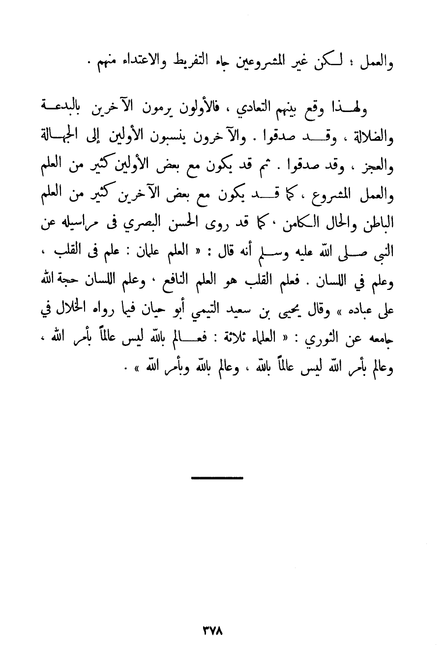 وَالْعَمَلِ؛ لَكِنَّ غَيْرَ الْمَشْرُوعَيْنِ جَاءَ التَّفْرِيطُ وَالِاعْتِدَاءُ مِنْهُمْ. وَلِهَذَا وَقَعَ بَيْنَهُمْ التَّعَادِي فَالْأَوَّلُونَ يَرْمُونَ الْآخَرِينَ بِالْبِدْعَةِ وَالضَّلَالَةِ وَقَدْ صَدَقُوا. وَالْآخَرُونَ يَنْسُبُونَ الْأَوَّلِينَ إلَى الْجَهَالَةِ وَالْعَجْزِ وَقَدْ صَدَقُوا. ثُمَّ قَدْ يَكُونُ مَعَ بَعْضِ الْأَوَّلِينَ كَثِيرٌ مِنْ الْعِلْمِ وَالْعَمَلِ الْمَشْرُوعِ كَمَا قَدْ يَكُونُ مَعَ بَعْضِ الْآخَرِينَ كَثِيرٌ مِنْ الْعِلْمِ الْبَاطِنِ وَالْحَالِ الْكَامِنِ كَمَا قَدْ رَوَى الْحَسَنُ الْبَصْرِيُّ فِي مَرَاسِيلِهِ عَنْ النَّبِيِّ صَلَّى اللَّهُ عَلَيْهِ وَسَلَّمَ أَنَّهُ قَالَ: " {الْعِلْمُ عِلْمَانِ: عِلْمٌ فِي الْقَلْبِ وَعِلْمٌ فِي اللِّسَانِ. فَعِلْمُ الْقَلْبِ هُوَ الْعِلْمُ النَّافِعُ وَعِلْمُ اللِّسَانِ حُجَّةُ اللَّهِ عَلَى عِبَادِهِ} " وَقَالَ يَحْيَى بْنُ سَعِيدٍ التيمي أَبُو حَيَّانَ فِيمَا رَوَاهُ الْخَلَّالُ فِي جَامِعِهِ عَنْ الثَّوْرِيِّ: " الْعُلَمَاءُ ثَلَاثَةٌ: فَعَالِمٌ بِاَللَّهِ لَيْسَ عَالِمًا بِأَمْرِ اللَّهِ وَعَالِمٌ بِأَمْرِ اللَّهِ لَيْسَ عَالِمًا بِاَللَّهِ وَعَالِمٌ بِاَللَّهِ وَبِأَمْرِ اللَّهِ ".