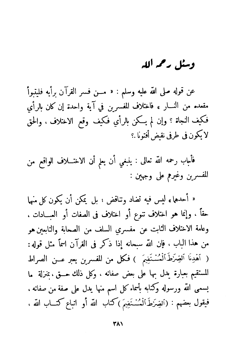 يَنْبَغِي أَنْ يُعْلَمَ أَنَّ الِاخْتِلَافَ الْوَاقِعَ مِنْ الْمُفَسِّرِينَ وَغَيْرِهِمْ عَلَى وَجْهَيْنِ: " أَحَدُهُمَا " لَيْسَ فِيهِ تَضَادٌّ وَتَنَاقُضٌ؛ بَلْ يُمْكِنُ أَنْ يَكُونَ كُلٌّ مِنْهُمَا حَقًّا وَإِنَّمَا هُوَ اخْتِلَافُ تَنَوُّعٍ أَوْ اخْتِلَافٌ فِي الصِّفَاتِ أَوْ الْعِبَارَاتِ وَعَامَّةُ الِاخْتِلَافِ الثَّابِتِ عَنْ مُفَسِّرِي السَّلَفِ مِنْ الصَّحَابَةِ وَالتَّابِعِينَ هُوَ مِنْ هَذَا الْبَابِ فَإِنَّ اللَّهَ سُبْحَانَهُ إذَا ذَكَرَ فِي الْقُرْآنِ اسْمًا مِثْلَ قَوْلِهِ: {اهْدِنَا الصِّرَاطَ الْمُسْتَقِيمَ} فَكُلٌّ مِنْ الْمُفَسِّرِينَ يُعَبِّرُ عَنْ الصِّرَاطِ الْمُسْتَقِيمِ بِعِبَارَةِ يَدُلُّ بِهَا عَلَى بَعْضِ صِفَاتِهِ وَكُلُّ ذَلِكَ حَقٌّ بِمَنْزِلَةِ مَا يُسَمَّى اللَّهُ وَرَسُولُهُ وَكِتَابُهُ بِأَسْمَاءِ كُلُّ اسْمٍ مِنْهَا يَدُلُّ عَلَى صِفَةٍ مِنْ صِفَاتِهِ فَيَقُولُ بَعْضُهُمْ: {الصِّرَاطَ الْمُسْتَقِيمَ} كِتَابُ اللَّهِ أَوْ اتِّبَاعُ كِتَابِ اللَّهِ