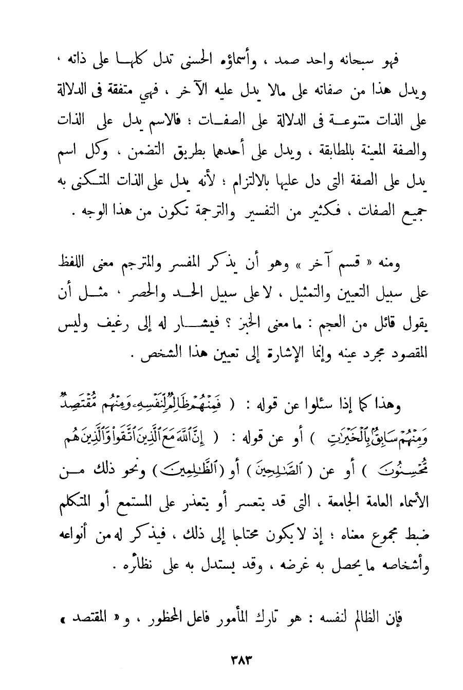 وَأَمْثَالُ ذَلِكَ. فَهُوَ سُبْحَانَهُ وَاحِدٌ صَمَدٌ وَأَسْمَاؤُهُ الْحُسْنَى تَدُلُّ كُلُّهَا عَلَى ذَاتِهِ وَيَدُلُّ هَذَا مِنْ صِفَاتِهِ عَلَى مَا لَا يَدُلُّ عَلَيْهِ الْآخَرُ فَهِيَ مُتَّفِقَةٌ فِي الدَّلَالَةِ عَلَى الذَّاتِ مُتَنَوِّعَةٌ فِي الدَّلَالَةِ عَلَى الصِّفَاتِ؛ فَالِاسْمُ يَدُلُّ عَلَى الذَّاتِ وَالصِّفَةِ الْمُعَيَّنَةِ بِالْمُطَابَقَةِ وَيَدُلُّ عَلَى أَحَدِهِمَا بِطَرِيقِ التَّضَمُّنِ وَكُلُّ اسْمٍ يَدُلُّ عَلَى الصِّفَةِ الَّتِي دَلَّ عَلَيْهَا بِالِالْتِزَامِ؛ لِأَنَّهُ يَدُلُّ عَلَى الذَّاتِ الْمُتَكَنَّى بِهِ جَمِيعُ الصِّفَاتِ فَكَثِيرٌ مِنْ التَّفْسِيرِ وَالتَّرْجَمَةِ تَكُونُ مِنْ هَذَا الْوَجْهِ. وَمِنْهُ " قِسْمٌ آخَرُ " وَهُوَ أَنْ يَذْكُرَ الْمُفَسِّرُ وَالْمُتَرْجِمُ مَعْنَى اللَّفْظِ عَلَى سَبِيلِ التَّعْيِينِ وَالتَّمْثِيلِ لَا عَلَى سَبِيلِ الْحَدِّ وَالْحَصْرِ مِثْلَ أَنْ يَقُولَ قَائِلٌ مِنْ الْعَجَمِ: مَا مَعْنَى الْخُبْزِ؟ فَيُشَارُ لَهُ إلَى رَغِيفٍ وَلَيْسَ الْمَقْصُودُ مُجَرَّدَ عَيْنِهِ وَإِنَّمَا الْإِشَارَةُ إلَى تَعْيِينِ هَذَا الشَّخْصِ. وَهَذَا كَمَا إذَا سُئِلُوا عَنْ قَوْلِهِ: {فَمِنْهُمْ ظَالِمٌ لِنَفْسِهِ وَمِنْهُمْ مُقْتَصِدٌ وَمِنْهُمْ سَابِقٌ بِالْخَيْرَاتِ} أَوْ عَنْ قَوْلِهِ: {إنَّ اللَّهَ مَعَ الَّذِينَ اتَّقَوْا وَالَّذِينَ هُمْ مُحْسِنُونَ} أَوْ عَنْ الصَّالِحِينَ أَوْ الظَّالِمِينَ وَنَحْوِ ذَلِكَ مِنْ الْأَسْمَاءِ الْعَامَّةِ الْجَامِعَةِ الَّتِي قَدْ يَتَعَسَّرُ أَوْ يَتَعَذَّرُ عَلَى الْمُسْتَمِعِ أَوْ الْمُتَكَلِّمِ ضَبْطُ مَجْمُوعِ مَعْنَاهُ؛ إذْ لَا يَكُونُ مُحْتَاجًا إلَى ذَلِكَ فَيَذْكُرُ لَهُ مِنْ أَنْوَاعِهِ وَأَشْخَاصِهِ مَا يَحْصُلُ بِهِ غَرَضُهُ وَقَدْ يَسْتَدِلُّ بِهِ عَلَى نَظَائِرِهِ. فَإِنَّ الظَّالِمَ لِنَفْسِهِ: هُوَ تَارِكُ الْمَأْمُورِ فَاعِلُ الْمَحْظُورِ و " الْمُقْتَصِدُ "