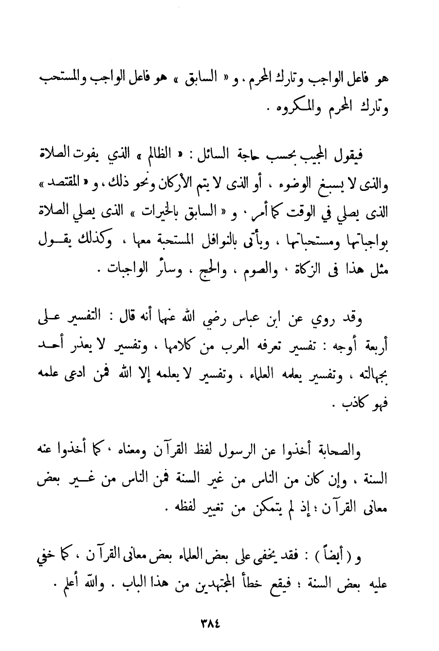 هُوَ فَاعِلُ الْوَاجِبِ وَتَارِكُ الْمُحَرَّمِ و " السَّابِقُ " هُوَ فَاعِلُ الْوَاجِبِ وَالْمُسْتَحَبِّ وَتَارِكُ الْمُحَرَّمِ وَالْمَكْرُوهِ. فَيَقُولُ الْمُجِيبُ بِحَسَبِ حَاجَةِ السَّائِلِ: " الظَّالِمُ " الَّذِي يُفَوِّتُ الصَّلَاةَ وَاَلَّذِي لَا يُسْبِغُ الْوُضُوءَ أَوْ الَّذِي لَا يُتِمُّ الْأَرْكَانَ وَنَحْوُ ذَلِكَ و " الْمُقْتَصِدُ " الَّذِي يُصَلِّي فِي الْوَقْتِ كَمَا أُمِرَ و " السَّابِقُ بِالْخَيْرَاتِ " الَّذِي يُصَلِّي الصَّلَاةَ بِوَاجِبَاتِهَا ومستحباتها وَيَأْتِي بِالنَّوَافِلِ الْمُسْتَحَبَّةِ مَعَهَا وَكَذَلِكَ يَقُولُ مِثْلَ هَذَا فِي الزَّكَاةِ وَالصَّوْمِ وَالْحَجِّ وَسَائِرِ الْوَاجِبَاتِ. وَقَدْ رُوِيَ عَنْ ابْنِ عَبَّاسٍ رَضِيَ اللَّهُ عَنْهُمَا أَنَّهُ قَالَ: التَّفْسِيرُ عَلَى أَرْبَعَةِ أَوْجُهٍ: تَفْسِيرٌ تَعْرِفُهُ الْعَرَبُ مِنْ كَلَامِهَا وَتَفْسِيرٌ لَا يُعْذَرُ أَحَدٌ بِجَهَالَتِهِ وَتَفْسِيرٌ يَعْلَمُهُ الْعُلَمَاءُ وَتَفْسِيرٌ لَا يَعْلَمُهُ إلَّا اللَّهُ فَمَنْ ادَّعَى عِلْمَهُ فَهُوَ كَاذِبٌ. وَالصَّحَابَةُ أَخَذُوا عَنْ الرَّسُولِ لَفْظَ الْقُرْآنِ وَمَعْنَاهُ كَمَا أَخَذُوا عَنْهُ السُّنَّةَ وَإِنْ كَانَ مِنْ النَّاسِ مَنْ غَيَّرَ السُّنَّةَ فَمِنْ النَّاسِ مَنْ غَيَّرَ بَعْضَ مَعَانِي الْقُرْآنِ؛ إذْ لَمْ يَتَمَكَّنْ مِنْ تَغْيِيرِ لَفْظِهِ. و " أَيْضًا ": فَقَدْ يَخْفَى عَلَى بَعْضِ الْعُلَمَاءِ بَعْضُ مَعَانِي الْقُرْآنِ كَمَا خَفِيَ عَلَيْهِ بَعْضُ السُّنَّةِ؛ فَيَقَعُ خَطَأُ الْمُجْتَهِدِينَ مِنْ هَذَا الْبَابِ. وَاَللَّهُ أَعْلَمُ.