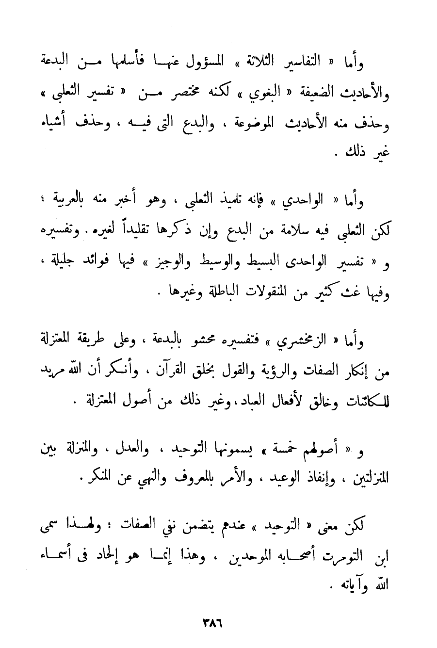وَأَمَّا " التَّفَاسِيرُ الثَّلَاثَةُ " الْمَسْئُولُ عَنْهَا فَأَسْلَمُهَا مِنْ الْبِدْعَةِ وَالْأَحَادِيثِ الضَّعِيفَةِ " البغوي " لَكِنَّهُ مُخْتَصَرٌ مِنْ " تَفْسِيرِ الثَّعْلَبِيِّ " وَحَذَفَ مِنْهُ الْأَحَادِيثَ الْمَوْضُوعَةَ وَالْبِدَعَ الَّتِي فِيهِ وَحَذَفَ أَشْيَاءَ غَيْرَ ذَلِكَ. وَأَمَّا " الْوَاحِدِيُّ " فَإِنَّهُ تِلْمِيذُ الثَّعْلَبِيِّ وَهُوَ أَخْبَرُ مِنْهُ بِالْعَرَبِيَّةِ؛ لَكِنَّ الثَّعْلَبِيَّ فِيهِ سَلَامَةٌ مِنْ الْبِدَعِ وَإِنْ ذِكْرَهَا تَقْلِيدًا لِغَيْرِهِ. وَتَفْسِيرُهُ و " تَفْسِيرُ الْوَاحِدِيِّ الْبَسِيطُ وَالْوَسِيطُ وَالْوَجِيزُ " فِيهَا فَوَائِدُ جَلِيلَةٌ وَفِيهَا غَثٌّ كَثِيرٌ مِنْ الْمَنْقُولَاتِ الْبَاطِلَةِ وَغَيْرِهَا. وَأَمَّا " الزمخشري " فَتَفْسِيرُهُ مَحْشُوٌّ بِالْبِدْعَةِ وَعَلَى طَرِيقَةِ الْمُعْتَزِلَةِ مِنْ إنْكَارِ الصِّفَاتِ وَالرُّؤْيَةِ وَالْقَوْلِ بِخَلْقِ الْقُرْآنِ وَأَنْكَرَ أَنَّ اللَّهَ مُرِيدٌ لِلْكَائِنَاتِ وَخَالِقٌ لِأَفْعَالِ الْعِبَادِ وَغَيْرِ ذَلِكَ مِنْ أُصُولِ الْمُعْتَزِلَةِ. و " أُصُولُهُمْ خَمْسَةٌ " يُسَمُّونَهَا التَّوْحِيدَ وَالْعَدْلَ وَالْمَنْزِلَةَ بَيْنَ الْمَنْزِلَتَيْنِ وَإِنْفَاذَ الْوَعِيدِ وَالْأَمْرَ بِالْمَعْرُوفِ وَالنَّهْيَ عَنْ الْمُنْكَرِ. لَكِنَّ مَعْنَى " التَّوْحِيدِ " عِنْدَهُمْ يَتَضَمَّنُ نَفْيَ الصِّفَاتِ؛ وَلِهَذَا سَمَّى ابْنُ التومرت أَصْحَابَهُ الْمُوَحِّدِينَ وَهَذَا إنَّمَا هُوَ إلْحَادٌ فِي أَسْمَاءِ اللَّهِ وَآيَاتِهِ.