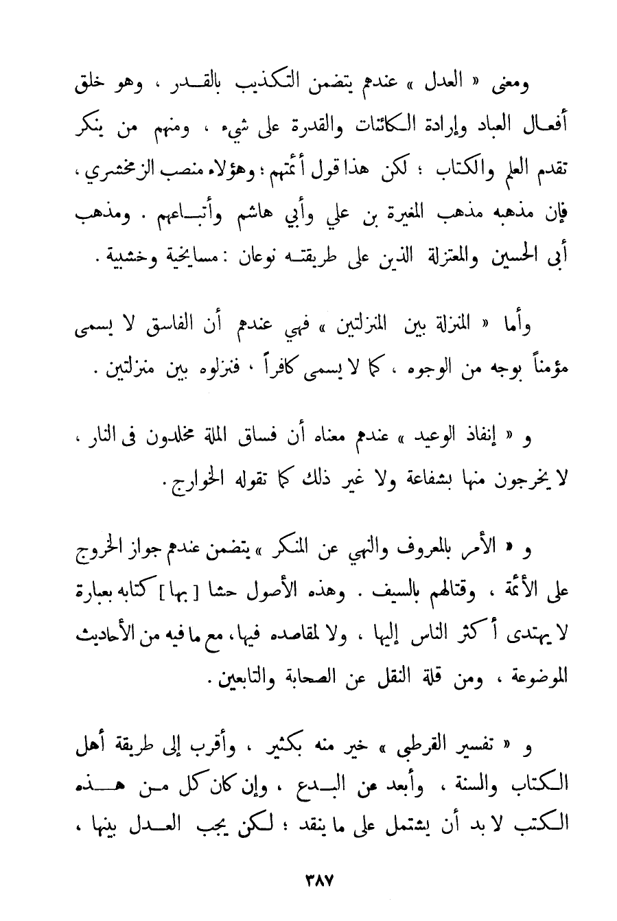 وَمَعْنَى " الْعَدْلِ " عِنْدَهُمْ يَتَضَمَّنُ التَّكْذِيبَ بِالْقَدَرِ وَهُوَ خَلْقُ أَفْعَالِ الْعِبَادِ وَإِرَادَةُ الْكَائِنَاتِ وَالْقُدْرَةُ عَلَى شَيْءٍ وَمِنْهُمْ مَنْ يُنْكِرُ تَقَدُّمَ الْعِلْمِ وَالْكِتَابِ؛ لَكِنَّ هَذَا قَوْلُ أَئِمَّتِهِمْ؛ وَهَؤُلَاءِ مُنْصَبُّ الزمخشري فَإِنَّ مَذْهَبَهُ مَذْهَبُ الْمُغِيرَةِ بْنِ عَلِيٍّ وَأَبِي هَاشِمٍ وَأَتْبَاعِهِمْ. وَمَذْهَبُ أَبِي الْحُسَيْنِ وَالْمُعْتَزِلَةِ الَّذِينَ عَلَى طَرِيقَتِهِ نَوْعَانِ: مسايخية وَخَشَبِيَّةٌ. وَأَمَّا " الْمَنْزِلَةُ بَيْنَ الْمَنْزِلَتَيْنِ " فَهِيَ عِنْدَهُمْ أَنَّ الْفَاسِقَ لَا يُسَمَّى مُؤْمِنًا بِوَجْهِ مِنْ الْوُجُوهِ كَمَا لَا يُسَمَّى كَافِرًا فَنَزَّلُوهُ بَيْنَ مَنْزِلَتَيْنِ. و " إنْفَاذُ الْوَعِيدِ " عِنْدَهُمْ مَعْنَاهُ أَنَّ فُسَّاقَ الْمِلَّةِ مُخَلَّدُونَ فِي النَّارِ لَا يَخْرُجُونَ مِنْهَا بِشَفَاعَةِ وَلَا غَيْرِ ذَلِكَ كَمَا تَقُولُهُ الْخَوَارِجُ. و " الْأَمْرُ بِالْمَعْرُوفِ وَالنَّهْيُ عَنْ الْمُنْكَرِ " يَتَضَمَّنُ عِنْدَهُمْ جَوَازَ الْخُرُوجِ عَلَى الْأَئِمَّةِ وَقِتَالِهِمْ بِالسَّيْفِ. وَهَذِهِ الْأُصُولُ حَشَا بِهَا كِتَابَهُ بِعِبَارَةِ لَا يَهْتَدِي أَكْثَرُ النَّاسِ إلَيْهَا وَلَا لِمَقَاصِدِهِ فِيهَا مَعَ مَا فِيهِ مِنْ الْأَحَادِيثِ الْمَوْضُوعَةِ وَمِنْ قِلَّةِ النَّقْلِ عَنْ الصَّحَابَةِ وَالتَّابِعِينَ. و " تَفْسِيرُ الْقُرْطُبِيِّ " خَيْرٌ مِنْهُ بِكَثِيرِ وَأَقْرَبُ إلَى طَرِيقَةِ أَهْلِ الْكِتَابِ وَالسُّنَّةِ وَأَبْعَدُ مِنْ الْبِدَعِ وَإِنْ كَانَ كُلٌّ مِنْ هَذِهِ الْكُتُبِ لَا بُدَّ أَنْ يَشْتَمِلَ عَلَى مَا يُنْقَدُ؛ لَكِنْ يَجِبُ الْعَدْلُ بَيْنَهَا