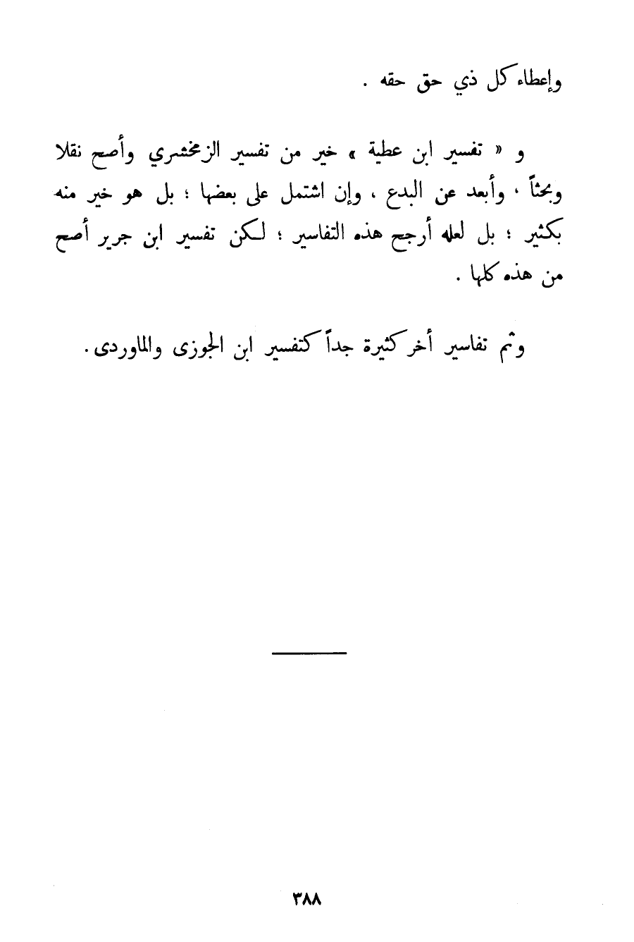 وَإِعْطَاءُ كُلِّ ذِي حَقٍّ حَقَّهُ. و " تَفْسِيرُ ابْنِ عَطِيَّةَ " خَيْرٌ مِنْ تَفْسِيرِ الزمخشري وَأَصَحُّ نَقْلًا وَبَحْثًا وَأَبْعَدُ عَنْ الْبِدَعِ وَإِنْ اشْتَمَلَ عَلَى بَعْضِهَا؛ بَلْ هُوَ خَيْرٌ مِنْهُ بِكَثِيرِ؛ بَلْ لَعَلَّهُ أَرْجَحُ هَذِهِ التَّفَاسِيرِ؛ لَكِنَّ تَفْسِيرَ ابْنِ جَرِيرٍ أَصَحُّ مِنْ هَذِهِ كُلِّهَا. وَثَمَّ تَفَاسِيرُ أُخَرُ كَثِيرَةٌ جِدًّا كَتَفْسِيرِ ابْنِ الْجَوْزِيِّ والماوردي.