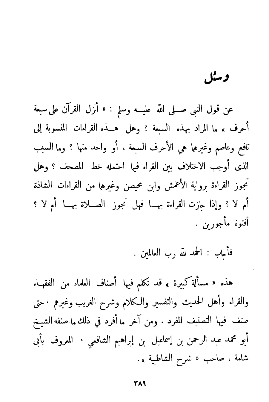 الْحَمْدُ لِلَّهِ رَبِّ الْعَالَمِينَ، هَذِهِ " مَسْأَلَةٌ كَبِيرَةٌ " قَدْ تَكَلَّمَ فِيهَا أَصْنَافُ الْعُلَمَاءِ مِنْ الْفُقَهَاءِ وَالْقُرَّاءِ وَأَهْلِ الْحَدِيثِ وَالتَّفْسِيرِ وَالْكَلَامِ وَشَرْحِ الْغَرِيبِ وَغَيْرِهِمْ حَتَّى صُنِّفَ فِيهَا التَّصْنِيفُ الْمُفْرَدُ وَمِنْ آخِرِ مَا أُفْرِدَ فِي ذَلِكَ مَا صَنَّفَهُ الشَّيْخُ أَبُو مُحَمَّدٍ عَبْدُ الرَّحْمَنِ بْنُ إسْمَاعِيلَ بْنِ إبْرَاهِيمَ الشَّافِعِيُّ الْمَعْرُوفُ بِأَبِي شَامَةَ صَاحِبُ " شَرْحِ الشاطبية ".