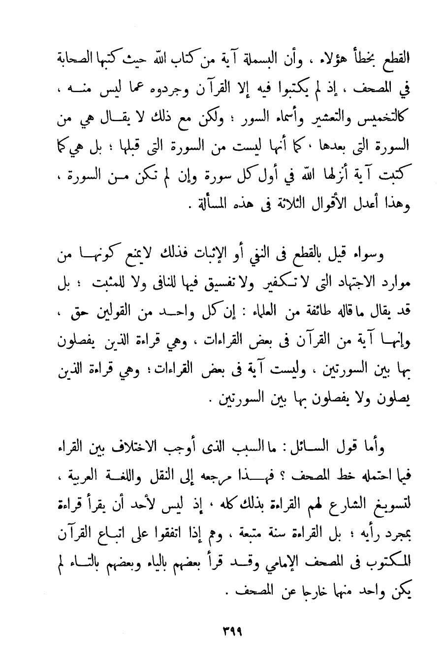 الْقَطْعُ بِخَطَأِ هَؤُلَاءِ وَأَنَّ الْبَسْمَلَةَ آيَةٌ مِنْ كِتَابِ اللَّهِ حَيْثُ كَتَبَهَا الصَّحَابَةُ فِي الْمُصْحَفِ إذْ لَمْ يَكْتُبُوا فِيهِ إلَّا الْقُرْآنَ وَجَرَّدُوهُ عَمَّا لَيْسَ مِنْهُ كَالتَّخْمِيسِ وَالتَّعْشِيرِ وَأَسْمَاءِ السُّوَرِ؛ وَلَكِنْ مَعَ ذَلِكَ لَا يُقَالُ هِيَ مِنْ السُّورَةِ الَّتِي بَعْدَهَا كَمَا أَنَّهَا لَيْسَتْ مِنْ السُّورَةِ الَّتِي قَبْلَهَا؛ بَلْ هِيَ كَمَا كُتِبَتْ آيَةٌ أَنْزَلَهَا اللَّهُ فِي أَوَّلِ كُلِّ سُورَةٍ وَإِنْ لَمْ تَكُنْ مِنْ السُّورَةِ وَهَذَا أَعْدَلُ الْأَقْوَالِ الثَّلَاثَةِ فِي هَذِهِ الْمَسْأَلَةِ. وَسَوَاءٌ قِيلَ بِالْقَطْعِ فِي النَّفْيِ أَوْ الْإِثْبَاتِ فَذَلِكَ لَا يَمْنَعُ كَوْنَهَا مِنْ مَوَارِدِ الِاجْتِهَادِ الَّتِي لَا تَكْفِيرَ وَلَا تَفْسِيقَ فِيهَا لِلنَّافِي وَلَا لِلْمُثْبِتِ؛ بَلْ قَدْ يُقَالُ مَا قَالَهُ طَائِفَةٌ مِنْ الْعُلَمَاءِ: إنَّ كُلَّ وَاحِدٍ مِنْ الْقَوْلَيْنِ حَقٌّ وَإِنَّهَا آيَةٌ مِنْ الْقُرْآنِ فِي بَعْضِ الْقِرَاءَاتِ وَهِيَ قِرَاءَةُ الَّذِينَ يَفْصِلُونَ بِهَا بَيْنَ السُّورَتَيْنِ وَلَيْسَتْ آيَةً فِي بَعْضِ الْقِرَاءَاتِ؛ وَهِيَ قِرَاءَةُ الَّذِينَ يَصِلُونَ وَلَا يَفْصِلُونَ بِهَا بَيْنَ السُّورَتَيْنِ.