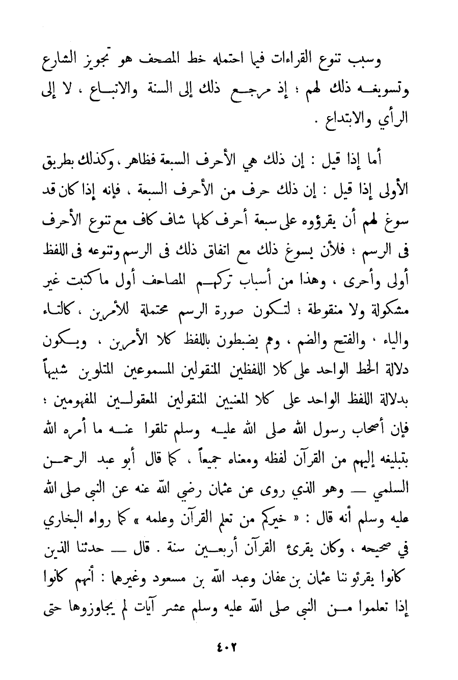 وَسَبَبُ تَنَوُّعِ الْقِرَاءَاتِ فِيمَا احْتَمَلَهُ خَطُّ الْمُصْحَفِ هُوَ تَجْوِيزُ الشَّارِعِ وَتَسْوِيغُهُ ذَلِكَ لَهُمْ؛ إذْ مَرْجِعُ ذَلِكَ إلَى السُّنَّةِ وَالِاتِّبَاعِ لَا إلَى الرَّأْيِ وَالِابْتِدَاعِ. أَمَّا إذَا قِيلَ: إنَّ ذَلِكَ هِيَ الْأَحْرُفُ السَّبْعَةُ فَظَاهِرٌ وَكَذَلِكَ بِطَرِيقِ الْأَوْلَى إذَا قِيلَ: إنَّ ذَلِكَ حَرْفٌ مِنْ الْأَحْرُفِ السَّبْعَةِ فَإِنَّهُ إذَا كَانَ قَدْ سُوِّغَ لَهُمْ أَنْ يَقْرَءُوهُ عَلَى سَبْعَةِ أَحْرُفٍ كُلُّهَا شَافٍ كَافٍ مَعَ تَنَوُّعِ الْأَحْرُفِ فِي الرَّسْمِ؛ فَلَأَنْ يُسَوَّغَ ذَلِكَ مَعَ اتِّفَاقِ ذَلِكَ فِي الرَّسْمِ وَتَنَوُّعِهِ فِي اللَّفْظِ أَوْلَى وَأَحْرَى وَهَذَا مِنْ أَسْبَابِ تَرْكِهِمْ الْمَصَاحِفَ أَوَّلَ مَا كُتِبَتْ غَيْرَ مَشْكُولَةٍ وَلَا مَنْقُوطَةٍ؛ لِتَكُونَ صُورَةُ الرَّسْمِ مُحْتَمِلَةً لِلْأَمْرَيْنِ كَالتَّاءِ وَالْيَاءِ وَالْفَتْحِ وَالضَّمِّ وَهُمْ يَضْبِطُونَ بِاللَّفْظِ كِلَا الْأَمْرَيْنِ وَيَكُونُ دَلَالَةُ الْخَطِّ الْوَاحِدِ عَلَى كِلَا اللَّفْظَيْنِ الْمَنْقُولَيْنِ الْمَسْمُوعَيْنِ الْمَتْلُوَّيْنِ شَبِيهًا بِدَلَالَةِ اللَّفْظِ الْوَاحِدِ عَلَى كِلَا الْمَعْنَيَيْنِ الْمَنْقُولَيْنِ الْمَعْقُولَيْنِ الْمَفْهُومَيْنِ؛ فَإِنَّ أَصْحَابَ رَسُولِ اللَّهِ صَلَّى اللَّهُ عَلَيْهِ وَسَلَّمَ تَلَقَّوْا عَنْهُ مَا أَمَرَهُ اللَّهُ بِتَبْلِيغِهِ إلَيْهِمْ مِنْ الْقُرْآنِ لَفْظِهِ وَمَعْنَاهُ جَمِيعًا كَمَا قَالَ أَبُو عَبْدِ الرَّحْمَنِ السُّلَمِي - وَهُوَ الَّذِي رَوَى عَنْ عُثْمَانَ رَضِيَ اللَّهُ عَنْهُ عَنْ النَّبِيِّ صَلَّى اللَّهُ عَلَيْهِ وَسَلَّمَ أَنَّهُ قَالَ: " {خَيْرُكُمْ مَنْ تَعَلَّمَ الْقُرْآنَ وَعَلَّمَهُ} " كَمَا رَوَاهُ الْبُخَارِيُّ فِي صَحِيحِهِ وَكَانَ يُقْرِئُ الْقُرْآنَ أَرْبَعِينَ سَنَةً. قَالَ - حَدَّثَنَا الَّذِينَ كَانُوا يُقْرِئُونَنَا عُثْمَانُ بْنُ عفان وَعَبْدُ اللَّهِ بْنُ مَسْعُودٍ وَغَيْرُهُمَا: أَنَّهُمْ كَانُوا إذَا تَعَلَّمُوا مِنْ النَّبِيِّ صَلَّى اللَّهُ عَلَيْهِ وَسَلَّمَ عَشْرَ آيَاتٍ لَمْ يُجَاوِزُوهَا حَتَّى
