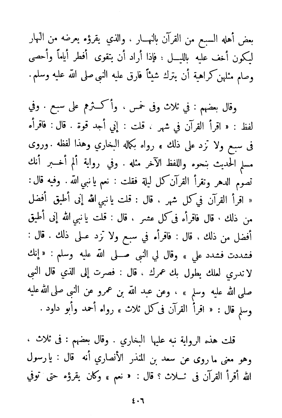بَعْضِ أَهْلِهِ السَّبْعَ مِنْ الْقُرْآنِ بِالنَّهَارِ وَاَلَّذِي يَقْرَؤُهُ يَعْرِضُهُ مِنْ النَّهَارِ لِيَكُونَ أَخَفَّ عَلَيْهِ بِاللَّيْلِ؛ فَإِذَا أَرَادَ أَنْ يَتَقَوَّى أَفْطَرَ أَيَّامًا وَأَحْصَى وَصَامَ مِثْلَهُنَّ كَرَاهِيَةَ أَنْ يَتْرُكَ شَيْئًا فَارَقَ عَلَيْهِ النَّبِيَّ صَلَّى اللَّهُ عَلَيْهِ وَسَلَّمَ. وَقَالَ بَعْضُهُمْ: فِي ثَلَاثٍ وَفِي خَمْسٍ وَأَكْثَرُهُمْ عَلَى سَبْعٍ. وَفِي لَفْظٍ: " {اقْرَأْ الْقُرْآنَ فِي شَهْرٍ قُلْت: إنِّي أَجِدُ قُوَّةً. قَالَ: فَاقْرَأْهُ فِي سَبْعٍ وَلَا تَزِدْ عَلَى ذَلِكَ} " رَوَاهُ بِكَمَالِهِ الْبُخَارِيُّ وَهَذَا لَفْظُهُ. وَرَوَى مُسْلِمٌ الْحَدِيثَ بِنَحْوِهِ وَاللَّفْظُ الْآخَرُ مِثْلُهُ. وَفِي رِوَايَةٍ {أَلَمْ أُخْبَرْ أَنَّك تَصُومُ الدَّهْرَ وَتَقْرَأُ الْقُرْآنَ كُلَّ لَيْلَةٍ فَقُلْت: نَعَمْ يَا نَبِيَّ اللَّهِ. وَفِيهِ قَالَ: اقْرَأْ الْقُرْآنَ فِي كُلِّ شَهْرٍ قَالَ: قُلْت يَا نَبِيَّ اللَّهِ إنِّي أُطِيقُ أَفْضَلَ مِنْ ذَلِكَ قَالَ فَاقْرَأْهُ فِي كُلِّ عَشْرٍ قَالَ: قُلْت يَا نَبِيَّ اللَّهِ إنِّي أُطِيقُ أَفْضَلَ مِنْ ذَلِكَ قَالَ: فَاقْرَأْهُ فِي سَبْعٍ وَلَا تَزِدْ عَلَى ذَلِكَ. قَالَ: فَشَدَّدْت فَشُدِّدَ عَلَيَّ وَقَالَ لِي النَّبِيُّ صَلَّى اللَّهُ عَلَيْهِ وَسَلَّمَ إنَّك لَا تَدْرِي لَعَلَّك يَطُولُ بِك عُمْرُك قَالَ: فَصِرْت إلَى الَّذِي قَالَ النَّبِيُّ صَلَّى اللَّهُ عَلَيْهِ وَسَلَّمَ} " وَعَنْ عَبْدِ اللَّهِ بْنِ عَمْرٍو عَنْ النَّبِيِّ صَلَّى اللَّهُ عَلَيْهِ وَسَلَّمَ قَالَ: " {اقْرَأْ الْقُرْآنَ فِي كُلِّ ثَلَاثٍ} " رَوَاهُ أَحْمَد وَأَبُو دَاوُد. قُلْت هَذِهِ الرِّوَايَةُ نَبَّهَ عَلَيْهَا الْبُخَارِيُّ. وَقَالَ بَعْضُهُمْ: فِي ثَلَاثٍ وَهُوَ مَعْنَى مَا رُوِيَ عَنْ {سَعْدِ بْنِ الْمُنْذِرِ الْأَنْصَارِيِّ أَنَّهُ قَالَ: يَا رَسُولَ اللَّهِ أَقْرَأْ الْقُرْآنَ فِي ثَلَاثٍ؟ قَالَ: نَعَمْ وَكَانَ يَقْرَؤُهُ حَتَّى تُوُفِّيَ}