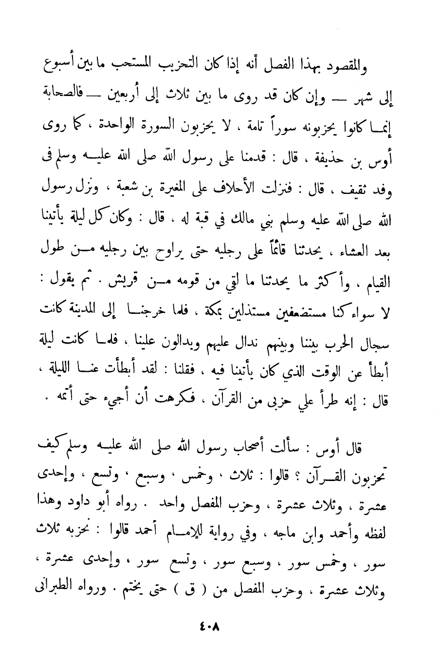 وَالْمَقْصُودُ بِهَذَا الْفَصْلِ أَنَّهُ إذَا كَانَ التَّحْزِيبُ الْمُسْتَحَبُّ مَا بَيْنَ أُسْبُوعٍ إلَى شَهْرٍ - وَإِنْ كَانَ قَدْ رُوِيَ مَا بَيْنَ ثَلَاثٍ إلَى أَرْبَعِينَ - فَالصَّحَابَةُ إنَّمَا كَانُوا يحزبونه سُوَرًا تَامَّةً لَا يحزبون السُّورَةَ الْوَاحِدَةَ كَمَا رَوَى {أَوْسُ بْنُ حُذَيْفَةَ قَالَ: قَدِمْنَا عَلَى رَسُولِ اللَّهِ صَلَّى اللَّهُ عَلَيْهِ وَسَلَّمَ فِي وَفْدِ ثَقِيفٍ قَالَ: فَنَزَلَتْ الْأَحْلَافُ عَلَى الْمُغِيرَةِ بْنِ شُعْبَةَ وَنَزَلَ رَسُولُ اللَّهِ صَلَّى اللَّهُ عَلَيْهِ وَسَلَّمَ بَنِي مَالِكٍ فِي قُبَّةٍ لَهُ قَالَ: وَكَانَ كُلَّ لَيْلَةٍ يَأْتِينَا بَعْدَ الْعِشَاءِ يُحَدِّثُنَا قَائِمًا عَلَى رِجْلَيْهِ حَتَّى يُرَاوِحَ بَيْنَ رِجْلَيْهِ مِنْ طُولِ الْقِيَامِ وَأَكْثَرُ مَا يُحَدِّثُنَا مَا لَقِيَ مِنْ قَوْمِهِ مِنْ قُرَيْشٍ. ثُمَّ يَقُولُ: لَا سَوَاءَ كُنَّا مُسْتَضْعَفِينَ مُسْتَذَلِّينَ بِمَكَّةَ فَلَمَّا خَرَجْنَا إلَى الْمَدِينَةِ كَانَتْ سِجَالُ الْحَرْبِ بَيْنَنَا وَبَيْنَهُمْ نُدَالَ عَلَيْهِمْ وَيُدَالَوْنَ عَلَيْنَا فَلَمَّا كَانَتْ لَيْلَةً أَبْطَأَ عَنْ الْوَقْتِ الَّذِي كَانَ يَأْتِينَا فِيهِ فَقُلْنَا: لَقَدْ أَبْطَأْت عَنَّا اللَّيْلَةَ قَالَ: إنَّهُ طَرَأَ عَلَيَّ حِزْبِي مِنْ الْقُرْآنِ فَكَرِهْت أَنْ أَجِيءَ حَتَّى أُتِمَّهُ.} {قَالَ أَوْسٌ: سَأَلْت أَصْحَابَ رَسُولِ اللَّهِ صَلَّى اللَّهُ عَلَيْهِ وَسَلَّمَ كَيْفَ تحزبون الْقُرْآنَ؟ قَالُوا: ثَلَاثٌ وَخَمْسٌ وَسَبْعٌ وَتِسْعٌ وَإِحْدَى عَشْرَةَ وَثَلَاثَ عَشْرَةَ وَحِزْبُ الْمُفَصَّلِ وَاحِدٌ} . رَوَاهُ أَبُو دَاوُد وَهَذَا لَفْظُهُ وَأَحْمَد وَابْنُ مَاجَه وَفِي رِوَايَةٍ لِلْإِمَامِ أَحْمَد قَالُوا: نحزبه ثَلَاثَ سُوَرٍ وَخَمْسَ سُوَرٍ وَسَبْعَ سُوَرٍ وَتِسْعَ سُوَرٍ وَإِحْدَى عَشْرَةَ وَثَلَاثَ عَشْرَةَ وَحِزْبُ الْمُفَصَّلِ مِنْ (ق) حَتَّى يَخْتِمَ. وَرَوَاهُ الطَّبَرَانِي