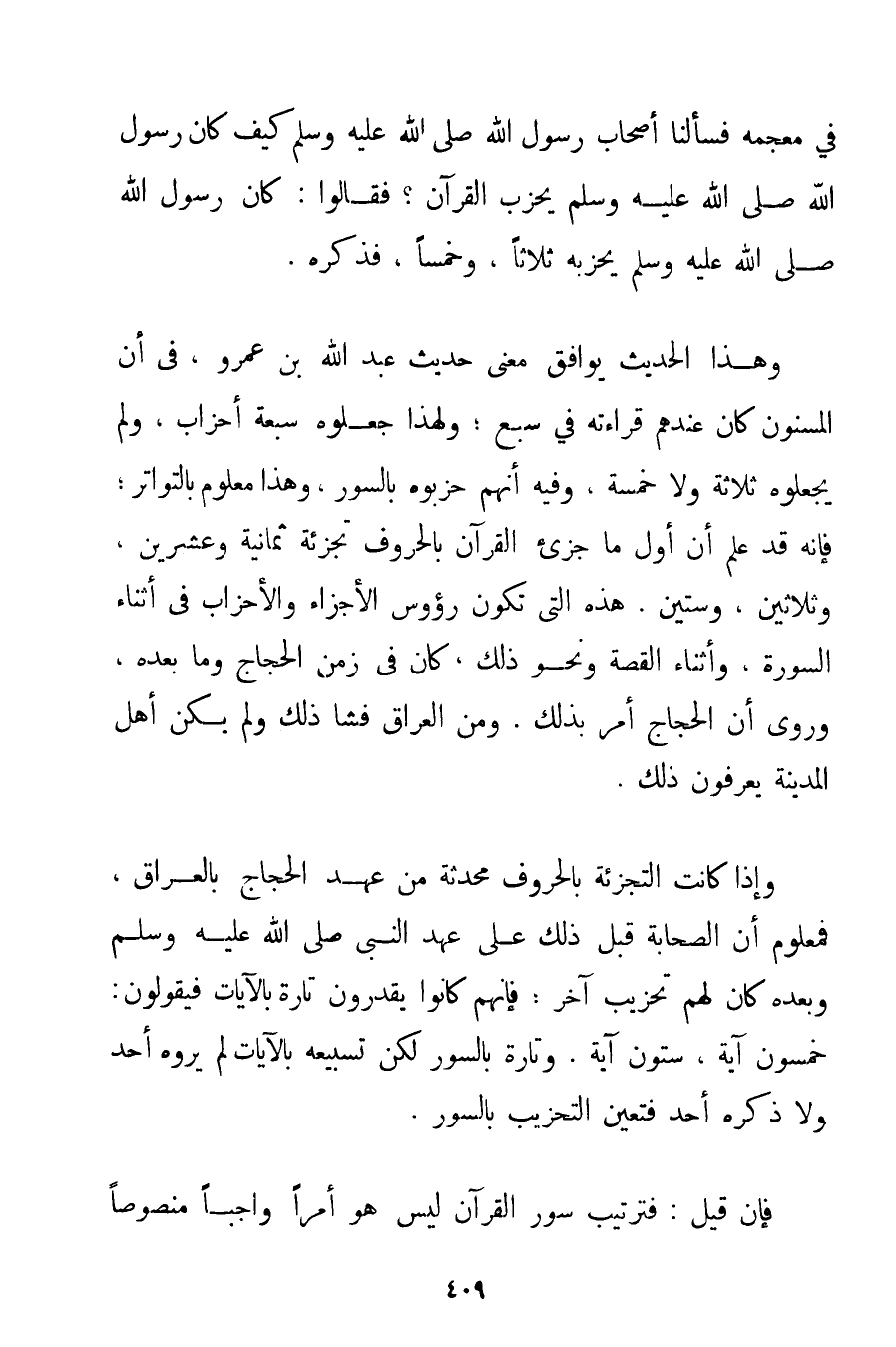فِي مُعْجَمِهِ فَسَأَلْنَا أَصْحَابَ رَسُولِ اللَّهِ صَلَّى اللَّهُ عَلَيْهِ وَسَلَّمَ كَيْفَ كَانَ رَسُولُ اللَّهِ صَلَّى اللَّهُ عَلَيْهِ وَسَلَّمَ يُحَزِّبُ الْقُرْآنَ؟ فَقَالُوا: كَانَ رَسُولُ اللَّهِ صَلَّى اللَّهُ عَلَيْهِ وَسَلَّمَ يُحَزِّبُهُ ثَلَاثًا وَخَمْسًا فَذَكَرَهُ. وَهَذَا الْحَدِيثُ يُوَافِقُ مَعْنَى حَدِيثِ عَبْدِ اللَّهِ بْنِ عَمْرٍو فِي أَنَّ الْمَسْنُونَ كَانَ عِنْدَهُمْ قِرَاءَتَهُ فِي سَبْعٍ؛ وَلِهَذَا جَعَلُوهُ سَبْعَةَ أَحْزَابٍ وَلَمْ يَجْعَلُوهُ ثَلَاثَةً وَلَا خَمْسَةً وَفِيهِ أَنَّهُمْ حزبوه بِالسُّورِ وَهَذَا مَعْلُومٌ بِالتَّوَاتُرِ؛ فَإِنَّهُ قَدْ عُلِمَ أَنَّ أَوَّلَ مَا جُزِّئَ الْقُرْآنُ بِالْحُرُوفِ تَجْزِئَةُ ثَمَانِيَةٍ وَعِشْرِينَ وَثَلَاثِينَ وَسِتِّينَ. هَذِهِ الَّتِي تَكُونُ رُءُوسُ الْأَجْزَاءِ وَالْأَحْزَابِ فِي أَثْنَاءِ السُّورَةِ وَأَثْنَاءِ الْقِصَّةِ وَنَحْوِ ذَلِكَ كَانَ فِي زَمَنِ الْحَجَّاجِ وَمَا بَعْدَهُ وَرُوِيَ أَنَّ الْحَجَّاجَ أَمَرَ بِذَلِكَ. وَمِنْ الْعِرَاقِ فَشَا ذَلِكَ وَلَمْ يَكُنْ أَهْلُ الْمَدِينَةِ يَعْرِفُونَ ذَلِكَ. وَإِذَا كَانَتْ التَّجْزِئَةُ بِالْحُرُوفِ مُحْدَثَةً مِنْ عَهْدِ الْحَجَّاجِ بِالْعِرَاقِ فَمَعْلُومٌ أَنَّ الصَّحَابَةَ قَبْلَ ذَلِكَ عَلَى عَهْدِ النَّبِيِّ صَلَّى اللَّهُ عَلَيْهِ وَسَلَّمَ وَبَعْدَهُ كَانَ لَهُمْ تَحْزِيبٌ آخَرُ؛ فَإِنَّهُمْ كَانُوا يُقَدِّرُونَ تَارَةً بِالْآيَاتِ فَيَقُولُونَ: خَمْسُونَ آيَةً سِتُّونَ آيَةً. وَتَارَةً بِالسُّوَرِ لَكِنَّ تَسْبِيعَهُ بِالْآيَاتِ لَمْ يَرْوِهِ أَحَدٌ وَلَا ذَكَرَهُ أَحَدٌ فَتَعَيَّنَ التَّحْزِيبُ بِالسُّوَرِ. فَإِنْ قِيلَ: فَتَرْتِيبُ سُوَرِ الْقُرْآنِ لَيْسَ هُوَ أَمْرًا وَاجِبًا مَنْصُوصًا