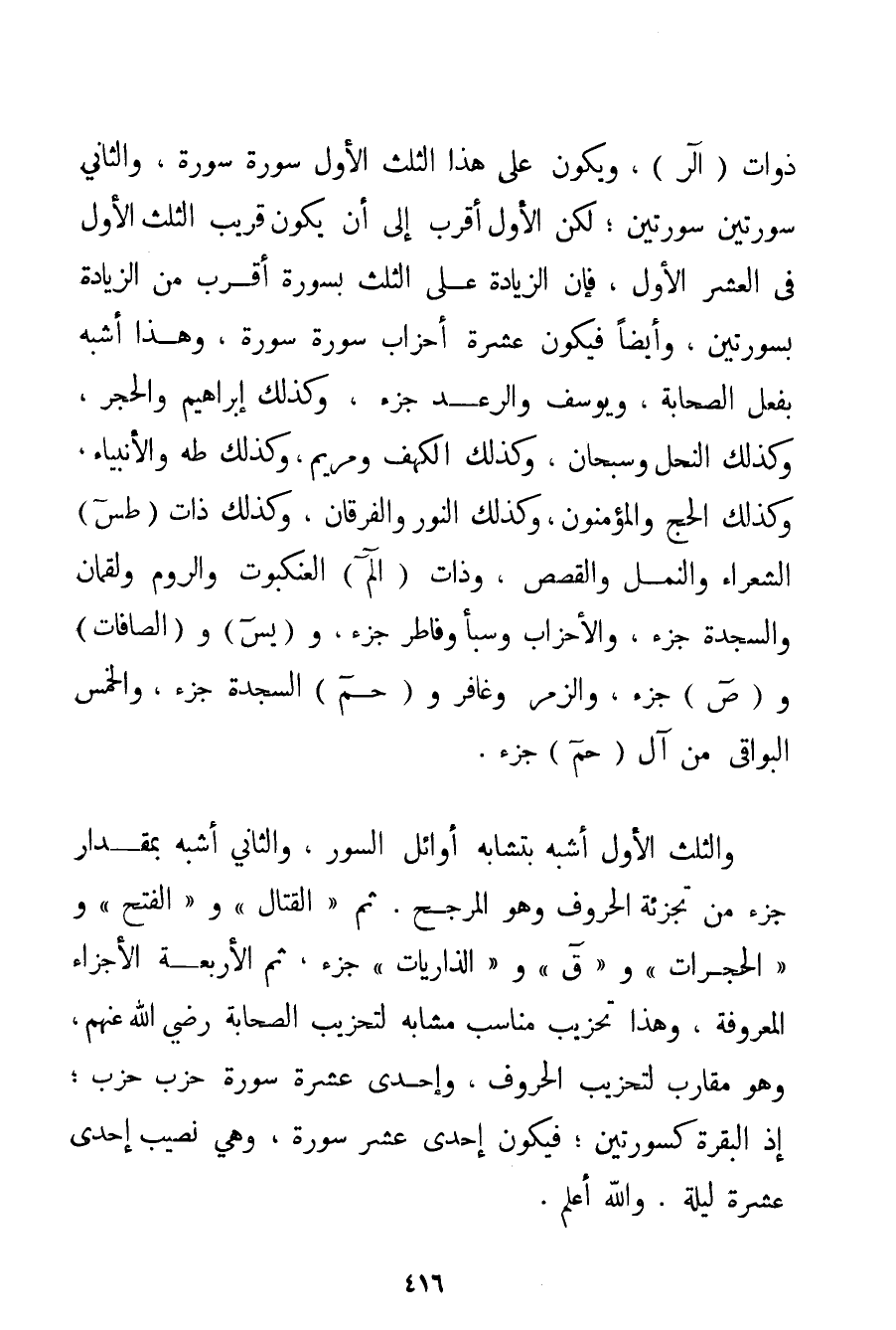 ذَوَاتِ {الر} وَيَكُونُ عَلَى هَذَا الثُّلُثُ الْأَوَّلُ سُورَةً سُورَةً وَالثَّانِي سُورَتَيْنِ سُورَتَيْنِ؛ لَكِنَّ الْأَوَّلَ أَقْرَبُ إلَى أَنْ يَكُونَ قَرِيبَ الثُّلُثِ الْأَوَّلِ فِي الْعُشْرِ الْأَوَّلِ فَإِنَّ الزِّيَادَةَ عَلَى الثُّلُثِ بِسُورَةِ أَقْرَبُ مِنْ الزِّيَادَةِ بِسُورَتَيْنِ وَأَيْضًا فَيَكُونُ عَشَرَةُ أَحْزَابٍ سُورَةً سُورَةً وَهَذَا أَشْبَهُ بِفِعْلِ الصَّحَابَةِ وَيُوسُفُ وَالرَّعْدُ جُزْءٌ وَكَذَلِكَ إبْرَاهِيمُ وَالْحِجْرُ وَكَذَلِكَ النَّحْلُ وَسُبْحَانَ وَكَذَلِكَ الْكَهْفُ وَمَرْيَمُ وَكَذَلِكَ طَه وَالْأَنْبِيَاءُ وَكَذَلِكَ الْحَجُّ وَالْمُؤْمِنُونَ وَكَذَلِكَ النُّورُ وَالْفُرْقَانُ وَكَذَلِكَ ذَاتُ {طس} الشُّعَرَاءُ وَالنَّمْلُ وَالْقَصَصُ وَذَاتُ {الم} الْعَنْكَبُوتُ وَالرُّومُ وَلُقْمَانُ وَالسَّجْدَةُ جُزْءٌ وَالْأَحْزَابُ وَسَبَأٌ وَفَاطِرٌ جُزْءٌ ويس وَالصَّافَّاتُ وَصِّ جُزْءٌ وَالزُّمَرُ وَغَافِرٌ وحم السَّجْدَةُ جُزْءٌ وَالْخَمْسُ الْبَوَاقِي مِنْ آلِ حم جُزْءٌ. وَالثُّلُثُ الْأَوَّلُ أَشْبَهُ بِتَشَابُهِ أَوَائِلِ السُّوَرِ وَالثَّانِي أَشْبَهُ بِمِقْدَارِ جُزْءٍ مِنْ تَجْزِئَةِ الْحُرُوفِ وَهُوَ الْمُرَجَّحُ. ثُمَّ " الْقِتَالُ " و " الْفَتْحُ " و " الْحُجُرَاتُ " و " ق " و " الذَّارِيَاتُ " جُزْءٌ ثُمَّ الْأَرْبَعَةُ الْأَجْزَاءُ الْمَعْرُوفَةُ وَهَذَا تَحْزِيبٌ مُنَاسِبٌ مُشَابِهٌ لِتَحْزِيبِ الصَّحَابَةِ رَضِيَ اللَّهُ عَنْهُمْ وَهُوَ مُقَارِبٌ لِتَحْزِيبِ الْحُرُوفِ وَإِحْدَى عَشْرَةَ سُورَةً حِزْبٌ حِزْبٌ؛ إذْ الْبَقَرَةُ كَسُورَتَيْنِ؛ فَيَكُونُ إحْدَى عَشْرَةَ سُورَةً وَهِيَ نَصِيبُ إحْدَى عَشْرَةَ لَيْلَةً. وَاَللَّهُ أَعْلَمُ.