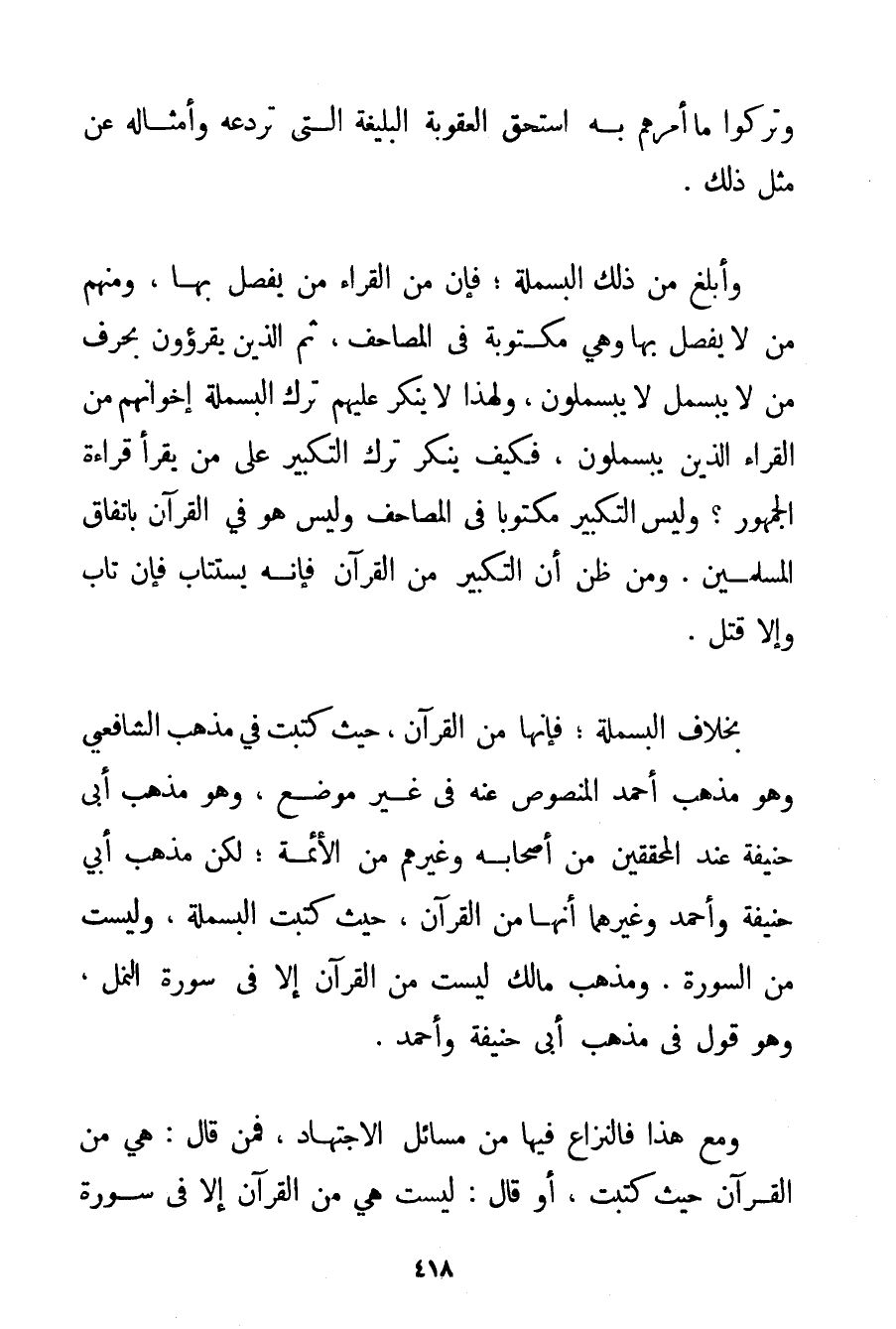 وَتَرَكُوا مَا أَمَرَهُمْ بِهِ اسْتَحَقَّ الْعُقُوبَةَ الْبَلِيغَةَ الَّتِي تَرْدَعُهُ وَأَمْثَالَهُ عَنْ مِثْلِ ذَلِكَ. وَأَبْلَغُ مِنْ ذَلِكَ الْبَسْمَلَةُ؛ فَإِنَّ مِنْ الْقُرَّاءِ مَنْ يَفْصِلُ بِهَا وَمِنْهُمْ مَنْ لَا يَفْصِلُ بِهَا وَهِيَ مَكْتُوبَةٌ فِي الْمَصَاحِفِ ثُمَّ الَّذِينَ يَقْرَءُونَ بِحَرْفِ مَنْ لَا يُبَسْمِلُ لَا يُبَسْمِلُونَ وَلِهَذَا لَا يُنْكِرُ عَلَيْهِمْ تَرْكَ الْبَسْمَلَةِ إخْوَانُهُمْ مِنْ الْقُرَّاءِ الَّذِينَ يُبَسْمِلُونَ فَكَيْفَ يُنْكَرُ تَرْكُ التَّكْبِيرِ عَلَى مَنْ يَقْرَأُ قِرَاءَةَ الْجُمْهُورِ؟ وَلَيْسَ التَّكْبِيرُ مَكْتُوبًا فِي الْمَصَاحِفِ وَلَيْسَ هُوَ فِي الْقُرْآنِ بِاتِّفَاقِ الْمُسْلِمِينَ. وَمَنْ ظَنَّ أَنَّ التَّكْبِيرَ مِنْ الْقُرْآنِ فَإِنَّهُ يُسْتَتَابُ فَإِنْ تَابَ وَإِلَّا قُتِلَ. بِخِلَافِ الْبَسْمَلَةِ؛ فَإِنَّهَا مِنْ الْقُرْآنِ حَيْثُ كُتِبَتْ فِي مَذْهَبِ الشَّافِعِيِّ وَهُوَ مَذْهَبُ أَحْمَد الْمَنْصُوصِ عَنْهُ فِي غَيْرِ مَوْضِعٍ وَهُوَ مَذْهَبُ أَبِي حَنِيفَةَ عِنْدَ الْمُحَقِّقِينَ مِنْ أَصْحَابِهِ وَغَيْرِهِمْ مِنْ الْأَئِمَّةِ؛ لَكِنَّ مَذْهَبَ أَبِي حَنِيفَةَ وَأَحْمَد وَغَيْرِهِمَا أَنَّهَا مِنْ الْقُرْآنِ حَيْثُ كُتِبَتْ الْبَسْمَلَةُ وَلَيْسَتْ مِنْ السُّورَةِ. وَمَذْهَبُ مَالِكٍ لَيْسَتْ مِنْ الْقُرْآنِ إلَّا فِي سُورَةِ النَّمْلِ وَهُوَ قَوْلٌ فِي مَذْهَبِ أَبِي حَنِيفَةَ وَأَحْمَد. وَمَعَ هَذَا فَالنِّزَاعُ فِيهَا مِنْ مَسَائِلِ الِاجْتِهَادِ فَمَنْ قَالَ: هِيَ مِنْ الْقُرْآنِ حَيْثُ كُتِبَتْ أَوْ قَالَ: لَيْسَتْ هِيَ مِنْ الْقُرْآنِ إلَّا فِي سُورَةِ