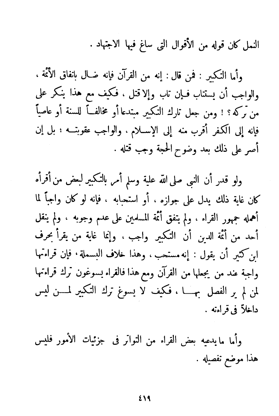 النَّمْلِ كَانَ قَوْلُهُ مِنْ الْأَقْوَالِ الَّتِي سَاغَ فِيهَا الِاجْتِهَادُ. وَأَمَّا التَّكْبِيرُ: فَمَنْ قَالَ: إنَّهُ مِنْ الْقُرْآنِ فَإِنَّهُ ضَالٌّ بِاتِّفَاقِ الْأَئِمَّةِ وَالْوَاجِبُ أَنْ يُسْتَتَابَ فَإِنْ تَابَ وَإِلَّا قُتِلَ فَكَيْفَ مَعَ هَذَا يُنْكَرُ عَلَى مَنْ تَرَكَهُ وَمَنْ جَعَلَ تَارِكَ التَّكْبِيرِ مُبْتَدِعًا أَوْ مُخَالِفًا لِلسُّنَّةِ أَوْ عَاصِيًا فَإِنَّهُ إلَى الْكُفْرِ أَقْرَبُ مِنْهُ إلَى الْإِسْلَامِ وَالْوَاجِبُ عُقُوبَتُهُ؛ بَلْ إنْ أَصَرَّ عَلَى ذَلِكَ بَعْدَ وُضُوحِ الْحُجَّةِ وَجَبَ قَتْلُهُ. وَلَوْ قُدِّرَ أَنَّ النَّبِيَّ صَلَّى اللَّهُ عَلَيْهِ وَسَلَّمَ أَمَرَ بِالتَّكْبِيرِ لِبَعْضِ مَنْ أَقْرَأَهُ كَانَ غَايَةُ ذَلِكَ يَدُلُّ عَلَى جَوَازِهِ أَوْ اسْتِحْبَابِهِ فَإِنَّهُ لَوْ كَانَ وَاجِبًا لَمَا أَهْمَلَهُ جُمْهُورُ الْقُرَّاءِ وَلَمْ يَتَّفِقْ أَئِمَّةُ الْمُسْلِمِينَ عَلَى عَدَمِ وُجُوبِهِ وَلَمْ يَنْقُلْ أَحَدٌ مِنْ أَئِمَّةِ الدِّينِ أَنَّ التَّكْبِيرَ وَاجِبٌ وَإِنَّمَا غَايَةُ مَنْ يَقْرَأُ بِحَرْفِ ابْنِ كَثِيرٍ أَنْ يَقُولَ: إنَّهُ مُسْتَحَبٌّ وَهَذَا خِلَافُ الْبَسْمَلَةِ فَإِنَّ قِرَاءَتَهَا وَاجِبَةٌ عِنْدَ مَنْ يَجْعَلُهَا مِنْ الْقُرْآنِ وَمَعَ هَذَا فَالْقُرَّاءُ يُسَوِّغُونَ تَرْكَ قِرَاءَتِهَا لِمَنْ لَمْ يَرَ الْفَصْلَ بِهَا فَكَيْفَ لَا يَسُوغُ تَرْكُ التَّكْبِيرِ لِمَنْ لَيْسَ دَاخِلًا فِي قِرَاءَتِهِ. وَأَمَّا مَا يَدَّعِيهِ بَعْضُ الْقُرَّاءِ مِنْ التَّوَاتُرِ فِي جُزْئِيَّاتِ الْأُمُورِ فَلَيْسَ هَذَا مَوْضِعَ تَفْصِيلِهِ.