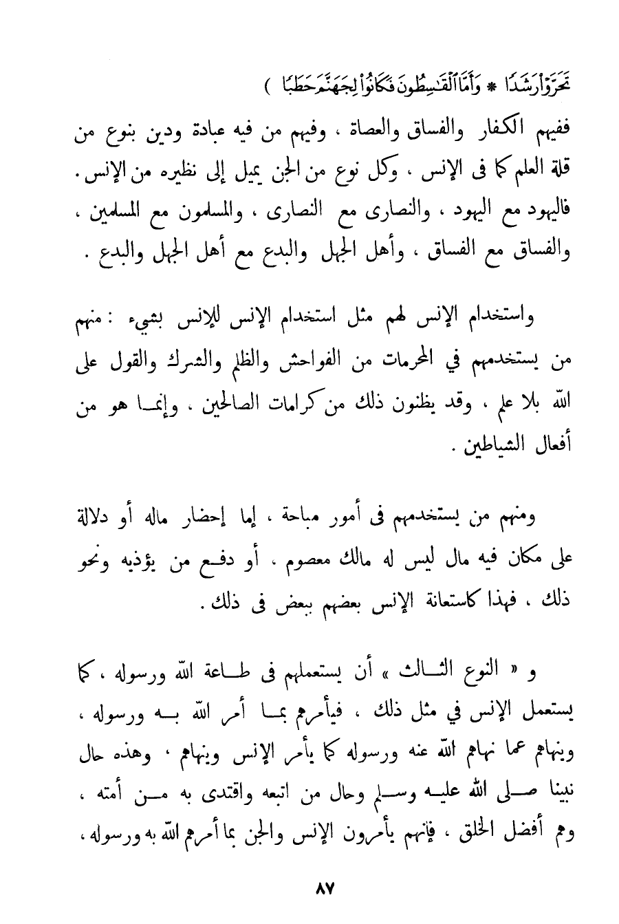 وَاسْتِخْدَامُ الْإِنْسِ لَهُمْ مِثْلُ اسْتِخْدَامِ الْإِنْسِ لِلْإِنْسِ بِشَيْءِ: مِنْهُمْ مَنْ يَسْتَخْدِمُهُمْ فِي الْمُحَرَّمَاتِ مِنْ الْفَوَاحِشِ وَالظُّلْمِ وَالشِّرْكِ وَالْقَوْلِ عَلَى اللَّهِ بِلَا عِلْمٍ وَقَدْ يَظُنُّونَ ذَلِكَ مِنْ كَرَامَاتِ الصَّالِحِينَ وَإِنَّمَا هُوَ مِنْ أَفْعَالِ الشَّيَاطِينِ. وَمِنْهُمْ مَنْ يَسْتَخْدِمُهُمْ فِي أُمُورٍ مُبَاحَةٍ إمَّا إحْضَارِ مَالِهِ أَوْ دَلَالَةٍ عَلَى مَكَانٍ فِيهِ مَالٌ لَيْسَ لَهُ مَالِكٌ مَعْصُومٌ أَوْ دَفْعِ مَنْ يُؤْذِيهِ وَنَحْوِ ذَلِكَ فَهَذَا كَاسْتِعَانَةِ الْإِنْسِ بَعْضِهِمْ بِبَعْضِ فِي ذَلِكَ. و " النَّوْعُ الثَّالِثُ " أَنْ يَسْتَعْمِلَهُمْ فِي طَاعَةِ اللَّهِ وَرَسُولِهِ كَمَا يُسْتَعْمَلُ الْإِنْسُ فِي مِثْلِ ذَلِكَ فَيَأْمُرَهُمْ بِمَا أَمَرَ اللَّهُ بِهِ وَرَسُولُهُ وَيَنْهَاهُمْ عَمَّا نَهَاهُمْ اللَّهُ عَنْهُ وَرَسُولُهُ كَمَا يَأْمُرُ الْإِنْسَ وَيَنْهَاهُمْ وَهَذِهِ حَالُ نَبِيِّنَا صَلَّى اللَّهُ عَلَيْهِ وَسَلَّمَ وَحَالٌ مَنْ اتَّبَعَهُ وَاقْتَدَى بِهِ مِنْ أُمَّتِهِ وَهُمْ أَفْضَلُ الْخَلْقِ فَإِنَّهُمْ يَأْمُرُونَ الْإِنْسَ وَالْجِنَّ بِمَا أَمَرَهُمْ اللَّهُ بِهِ وَرَسُولُهُ