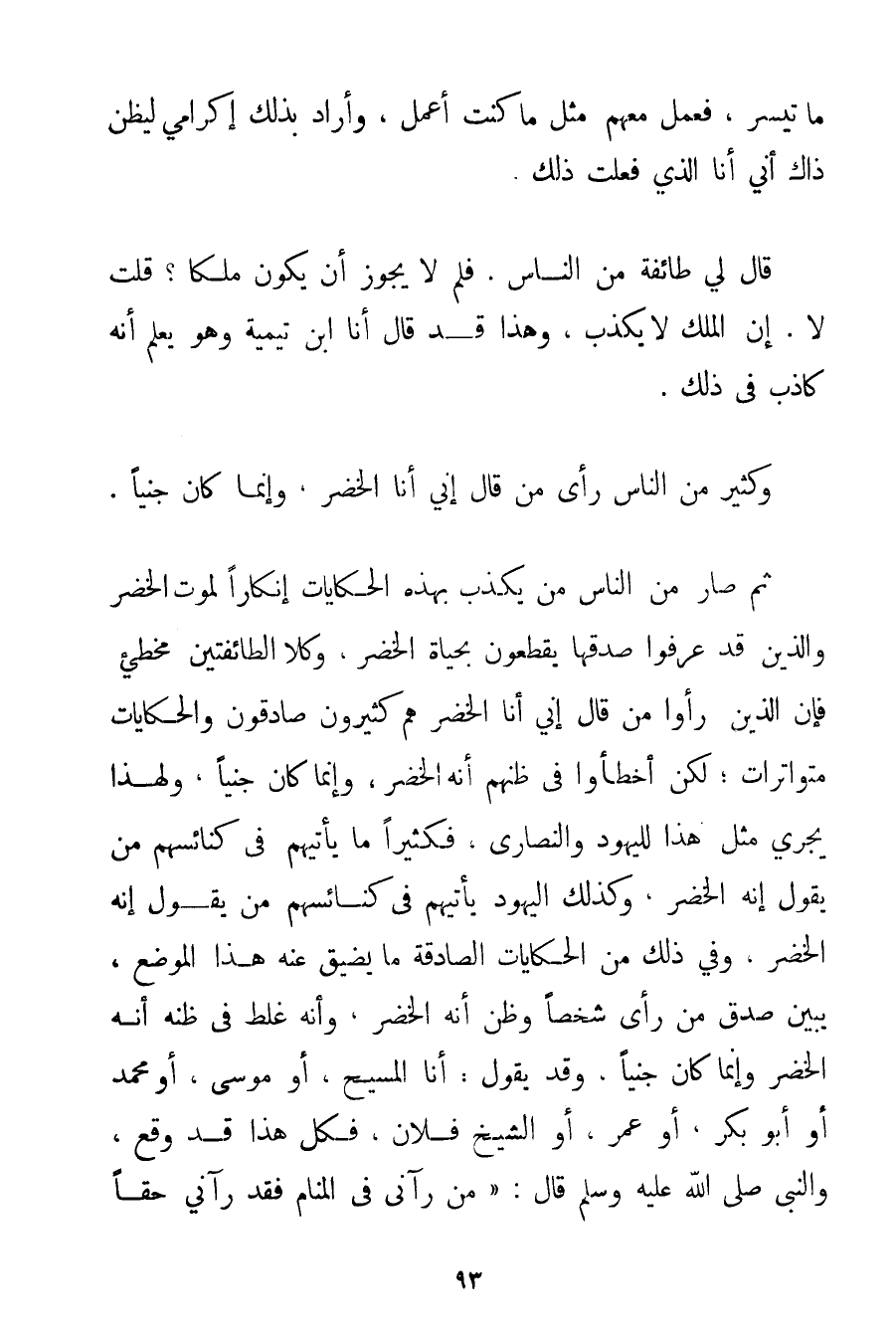 مَا تَيَسَّرَ فَعَمِلَ مَعَهُمْ مِثْلَ مَا كُنْت أَعْمَلُ وَأَرَادَ بِذَلِكَ إكْرَامِي لِيَظُنَّ ذَاكَ أَنِّي أَنَا الَّذِي فَعَلْت ذَلِكَ. قَالَ لِي طَائِفَةٌ مِنْ النَّاسِ. فَلِمَ لَا يَجُوزُ أَنْ يَكُونَ مَلَكًا؟ قُلْت لَا. إنَّ الْمَلَكَ لَا يَكْذِبُ وَهَذَا قَدْ قَالَ أَنَا ابْنُ تَيْمِيَّة وَهُوَ يَعْلَمُ أَنَّهُ كَاذِبٌ فِي ذَلِكَ. وَكَثِيرٌ مِنْ النَّاسِ رَأَى مَنْ قَالَ إنِّي أَنَا الْخَضِرُ وَإِنَّمَا كَانَ جِنِّيًّا. ثُمَّ صَارَ مِنْ النَّاسِ مَنْ يُكَذِّبُ بِهَذِهِ الْحِكَايَاتِ إنْكَارًا لِمَوْتِ الْخَضِرِ وَاَلَّذِينَ قَدْ عَرَفُوا صِدْقَهَا يَقْطَعُونَ بِحَيَاةِ الْخَضِرِ وَكِلَا الطَّائِفَتَيْنِ مُخْطِئٌ فَإِنَّ الَّذِينَ رَأَوْا مَنْ قَالَ إنِّي أَنَا الْخَضِرُ هُمْ كَثِيرُونَ صَادِقُونَ وَالْحِكَايَاتُ مُتَوَاتِرَاتٌ؛ لَكِنْ أَخْطَئُوا فِي ظَنِّهِمْ أَنَّهُ الْخَضِرُ وَإِنَّمَا كَانَ جِنِّيًّا وَلِهَذَا يَجْرِي مِثْلُ هَذَا لِلْيَهُودِ وَالنَّصَارَى فَكَثِيرًا مَا يَأْتِيهِمْ فِي كَنَائِسِهِمْ مَنْ يَقُولُ إنَّهُ الْخَضِرُ وَكَذَلِكَ الْيَهُودُ يَأْتِيهِمْ فِي كَنَائِسِهِمْ مَنْ يَقُولُ إنَّهُ الْخَضِرُ وَفِي ذَلِكَ مِنْ الْحِكَايَاتِ الصَّادِقَةِ مَا يَضِيقُ عَنْهُ هَذَا الْمَوْضِعُ يُبَيِّنُ صِدْقَ مَنْ رَأَى شَخْصًا وَظَنَّ أَنَّهُ الْخَضِرُ وَأَنَّهُ غَلِطَ فِي ظَنِّهِ أَنَّهُ الْخَضِرُ وَإِنَّمَا كَانَ جِنِّيًّا وَقَدْ يَقُولُ: أَنَا الْمَسِيحُ أَوْ مُوسَى أَوْ مُحَمَّدٌ أَوْ أَبُو بَكْرٍ أَوْ عُمَرُ أَوْ الشَّيْخُ فُلَانٌ فَكُلُّ هَذَا قَدْ وَقَعَ وَالنَّبِيُّ صَلَّى اللَّهُ عَلَيْهِ وَسَلَّمَ قَالَ: {مَنْ رَآنِي فِي الْمَنَامِ فَقَدْ رَآنِي حَقًّا