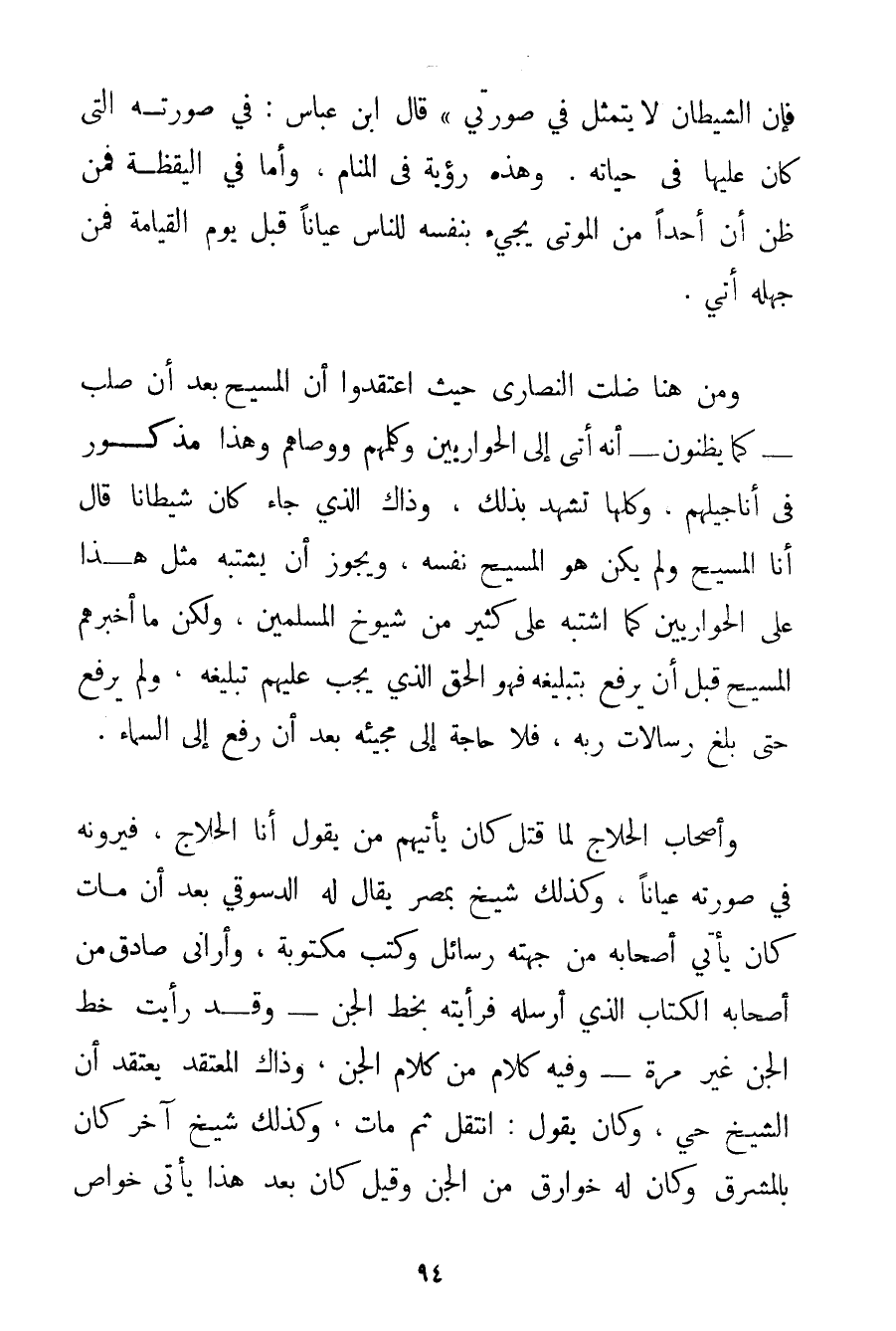 فَإِنَّ الشَّيْطَانَ لَا يَتَمَثَّلُ فِي صُورَتِي} قَالَ ابْنُ عَبَّاسٍ: فِي صُورَتِهِ الَّتِي كَانَ عَلَيْهَا فِي حَيَاتِهِ. وَهَذِهِ رُؤْيَةٌ فِي الْمَنَامِ وَأَمَّا فِي الْيَقَظَةِ فَمَنْ ظَنَّ أَنَّ أَحَدًا مِنْ الْمَوْتَى يَجِيءُ بِنَفْسِهِ لِلنَّاسِ عِيَانًا قَبْلَ يَوْمِ الْقِيَامَةِ فَمِنْ جَهْلِهِ أُتِيَ وَمِنْ هُنَا ضَلَّتْ النَّصَارَى حَيْثُ اعْتَقَدُوا أَنَّ الْمَسِيحَ بَعْدَ أَنْ صُلِبَ - كَمَا يَظُنُّونَ - أَنَّهُ أَتَى إلَى الْحَوَارِيِّينَ وَكَلَّمَهُمْ وَوَصَّاهُمْ وَهَذَا مَذْكُورٌ فِي أَنَاجِيلِهِمْ وَكُلُّهَا تَشْهَدُ بِذَلِكَ وَذَاكَ الَّذِي جَاءَ كَانَ شَيْطَانًا قَالَ أَنَا الْمَسِيحُ وَلَمْ يَكُنْ هُوَ الْمَسِيحَ نَفْسَهُ وَيَجُوزُ أَنْ يَشْتَبِهَ مِثْلُ هَذَا عَلَى الْحَوَارِيِّينَ كَمَا اشْتَبَهَ عَلَى كَثِيرٍ مِنْ شُيُوخِ الْمُسْلِمِينَ وَلَكِنْ مَا أَخْبَرَهُمْ الْمَسِيحُ قَبْلَ أَنْ يُرْفَعَ بِتَبْلِيغِهِ فَهُوَ الْحَقُّ الَّذِي يَجِبُ عَلَيْهِمْ تَبْلِيغُهُ وَلَمْ يُرْفَعْ حَتَّى بَلَّغَ رِسَالَاتِ رَبِّهِ فَلَا حَاجَةَ إلَى مَجِيئِهِ بَعْدَ أَنْ رُفِعَ إلَى السَّمَاءِ. وَأَصْحَابُ الْحَلَّاجِ لَمَّا قُتِلَ كَانَ يَأْتِيهِمْ مَنْ يَقُولُ أَنَا الْحَلَّاجُ فَيَرَوْنَهُ فِي صُورَتِهِ عِيَانًا وَكَذَلِكَ شَيْخٌ بِمِصْرِ يُقَالُ لَهُ الدسوقي بَعْدَ أَنْ مَاتَ كَانَ يَأْتِي أَصْحَابَهُ مِنْ جِهَتِهِ رَسَائِلُ وَكُتُبٌ مَكْتُوبَةٌ وَأَرَانِي صَادِقٌ مِنْ أَصْحَابِهِ الْكِتَابَ الَّذِي أَرْسَلَهُ فَرَأَيْته بِخَطِّ الْجِنِّ - وَقَدْ رَأَيْت خَطَّ الْجِنِّ غَيْرَ مَرَّةٍ - وَفِيهِ كَلَامٌ مِنْ كَلَامِ الْجِنِّ وَذَاكَ الْمُعْتَقِدُ يَعْتَقِدُ أَنَّ الشَّيْخَ حَيٌّ وَكَانَ يَقُولُ: انْتَقَلَ ثُمَّ مَاتَ وَكَذَلِكَ شَيْخٌ آخَرُ كَانَ بِالْمَشْرِقِ وَكَانَ لَهُ خَوَارِقُ مِنْ الْجِنِّ وَقِيلَ كَانَ بَعْدَ هَذَا يَأْتِي خَوَاصَّ