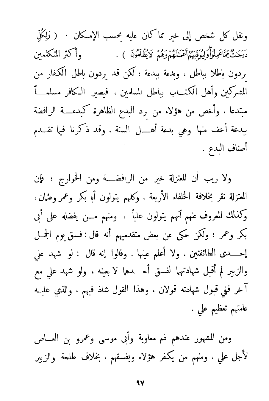 وَنَقَلَ كُلَّ شَخْصٍ إلَى خَيْرٍ مِمَّا كَانَ عَلَيْهِ بِحَسَبِ الْإِمْكَانِ {وَلِكُلٍّ دَرَجَاتٌ مِمَّا عَمِلُوا وَلِيُوَفِّيَهُمْ أَعْمَالَهُمْ وَهُمْ لَا يُظْلَمُونَ} . وَأَكْثَرُ الْمُتَكَلِّمِينَ يَرُدُّونَ بَاطِلًا بِبَاطِلِ وَبِدْعَةً بِبِدْعَةِ؛ لَكِنْ قَدْ يَرُدُّونَ بَاطِلَ الْكُفَّارِ مِنْ الْمُشْرِكِينَ وَأَهْلِ الْكِتَابِ بِبَاطِلِ الْمُسْلِمِينَ فَيَصِيرُ الْكَافِرُ مُسْلِمًا مُبْتَدِعًا وَأَخَصُّ مِنْ هَؤُلَاءِ مَنْ يَرُدُّ الْبِدَعَ الظَّاهِرَةَ كَبِدْعَةِ الرَّافِضَةِ بِبِدْعَةِ أَخَفَّ مِنْهَا وَهِيَ بِدْعَةُ أَهْلِ السُّنَّةِ وَقَدْ ذَكَرْنَا فِيمَا تَقَدَّمَ أَصْنَافَ الْبِدَعِ. وَلَا رَيْبَ أَنَّ الْمُعْتَزِلَةَ خَيْرٌ مِنْ الرَّافِضَةِ وَمِنْ الْخَوَارِجِ؛ فَإِنَّ الْمُعْتَزِلَةَ تُقِرُّ بِخِلَافَةِ الْخُلَفَاءِ الْأَرْبَعَةِ وَكُلُّهُمْ يَتَوَلَّوْنَ أَبَا بَكْرٍ وَعُمَرَ وَعُثْمَانَ وَكَذَلِكَ الْمَعْرُوفُ عَنْهُمْ أَنَّهُمْ يَتَوَلَّوْنَ عَلِيًّا وَمِنْهُمْ مَنْ يُفَضِّلُهُ عَلَى أَبِي بَكْرٍ وَعُمَرَ؛ وَلَكِنْ حُكِيَ عَنْ بَعْضِ مُتَقَدِّمِيهِمْ أَنَّهُ قَالَ: فَسَقَ يَوْمَ الْجَمَلِ إحْدَى الطَّائِفَتَيْنِ وَلَا أَعْلَمُ عَيْنَهَا. وَقَالُوا إنَّهُ قَالَ: لَوْ شَهِدَ عَلِيٌّ وَالزُّبَيْرُ لَمْ أَقْبَلْ شَهَادَتَهُمَا لِفِسْقِ أَحَدِهِمَا لَا بِعَيْنِهِ وَلَوْ شَهِدَ عَلِيٌّ مَعَ آخَرَ فَفِي قَبُولِ شَهَادَتِهِ قَوْلَانِ وَهَذَا الْقَوْلُ شَاذٌّ فِيهِمْ وَاَلَّذِي عَلَيْهِ عَامَّتُهُمْ تَعْظِيمُ عَلِيٍّ. وَمِنْ الْمَشْهُورِ عِنْدَهُمْ ذَمُّ مُعَاوِيَةَ وَأَبِي مُوسَى وَعَمْرِو بْنِ العاص لِأَجْلِ عَلِيٍّ وَمِنْهُمْ مَنْ يُكَفِّرُ هَؤُلَاءِ وَيُفَسِّقُهُمْ؛ بِخِلَافِ طَلْحَةَ وَالزُّبَيْرِ
