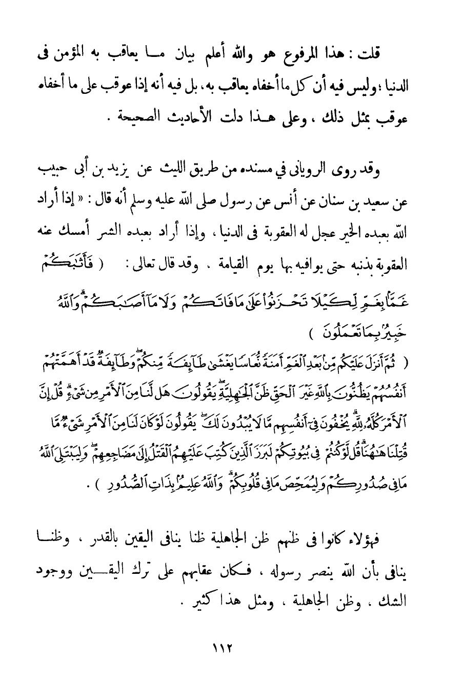 قُلْت: هَذَا الْمَرْفُوعُ هُوَ وَاَللَّهُ أَعْلَمُ بَيَانُ مَا يُعَاقَبُ بِهِ الْمُؤْمِنُ فِي الدُّنْيَا؛ وَلَيْسَ فِيهِ أَنَّ كُلَّ مَا أَخْفَاهُ يُعَاقَبُ بِهِ بَلْ فِيهِ أَنَّهُ إذَا عُوقِبَ عَلَى مَا أَخْفَاهُ عُوقِبَ بِمِثْلِ ذَلِكَ وَعَلَى هَذَا دَلَّتْ الْأَحَادِيثُ الصَّحِيحَةُ. وَقَدْ رَوَى الروياني فِي مَسْنَدِهِ مِنْ طَرِيقِ اللَّيْثِ عَنْ يَزِيدَ بْنِ أَبِي حَبِيبٍ عَنْ سَعِيدِ بْنِ سِنَانٍ عَنْ أَنَسٍ عَنْ رَسُولِ اللَّهِ صَلَّى اللَّهُ عَلَيْهِ وَسَلَّمَ أَنَّهُ قَالَ: {إذَا أَرَادَ اللَّهُ بِعَبْدِهِ الْخَيْرَ عَجَّلَ لَهُ الْعُقُوبَةَ فِي الدُّنْيَا وَإِذَا أَرَادَ بِعَبْدِهِ الشَّرَّ أَمْسَكَ عَنْهُ الْعُقُوبَةَ بِذَنْبِهِ حَتَّى يُوَافِيَهُ بِهَا يَوْمَ الْقِيَامَةِ} وَقَدْ قَالَ تَعَالَى: {فَأَثَابَكُمْ غَمًّا بِغَمٍّ لِكَيْلَا تَحْزَنُوا عَلَى مَا فَاتَكُمْ وَلَا مَا أَصَابَكُمْ وَاللَّهُ خَبِيرٌ بِمَا تَعْمَلُونَ} {ثُمَّ أَنْزَلَ عَلَيْكُمْ مِنْ بَعْدِ الْغَمِّ أَمَنَةً نُعَاسًا يَغْشَى طَائِفَةً مِنْكُمْ وَطَائِفَةٌ قَدْ أَهَمَّتْهُمْ أَنْفُسُهُمْ يَظُنُّونَ بِاللَّهِ غَيْرَ الْحَقِّ ظَنَّ الْجَاهِلِيَّةِ يَقُولُونَ هَلْ لَنَا مِنَ الْأَمْرِ مِنْ شَيْءٍ قُلْ إنَّ الْأَمْرَ كُلَّهُ لِلَّهِ يُخْفُونَ فِي أَنْفُسِهِمْ مَا لَا يُبْدُونَ لَكَ يَقُولُونَ لَوْ كَانَ لَنَا مِنَ الْأَمْرِ شَيْءٌ مَا قُتِلْنَا هَاهُنَا قُلْ لَوْ كُنْتُمْ فِي بُيُوتِكُمْ لَبَرَزَ الَّذِينَ كُتِبَ عَلَيْهِمُ الْقَتْلُ إلَى مَضَاجِعِهِمْ وَلِيَبْتَلِيَ اللَّهُ مَا فِي صُدُورِكُمْ وَلِيُمَحِّصَ مَا فِي قُلُوبِكُمْ وَاللَّهُ عَلِيمٌ بِذَاتِ الصُّدُورِ} . فَهَؤُلَاءِ كَانُوا فِي ظَنِّهِمْ ظَنَّ الْجَاهِلِيَّةِ ظَنًّا يُنَافِي الْيَقِينَ بِالْقَدَرِ وَظَنًّا يُنَافِي بِأَنَّ اللَّهَ يَنْصُرُ رَسُولَهُ فَكَانَ عِقَابُهُمْ عَلَى تَرْكِ الْيَقِينِ وَوُجُودِ الشَّكِّ وَظَنِّ الْجَاهِلِيَّةِ وَمِثْلُ هَذَا كَثِيرٌ.