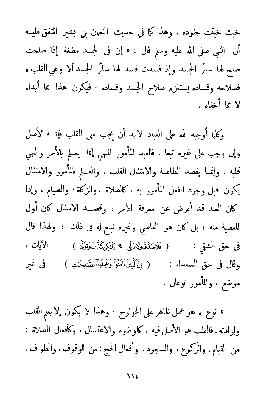 خَبُثَ خَبُثَتْ جُنُودُهُ وَهَذَا كَمَا فِي حَدِيثِ النُّعْمَانِ بْنِ بَشِيرٍ الْمُتَّفَقِ عَلَيْهِ أَنَّ النَّبِيَّ صَلَّى اللَّهُ عَلَيْهِ وَسَلَّمَ قَالَ: {إنَّ فِي الْجَسَدِ مُضْغَةً إذَا صَلَحَتْ صَلُحَ لَهَا سَائِرُ الْجَسَدِ وَإِذَا فَسَدَتْ فَسَدَ لَهَا سَائِرُ الْجَسَدِ أَلَا وَهِيَ الْقَلْبُ} فَصَلَاحُهُ وَفَسَادُهُ يَسْتَلْزِمُ صَلَاحَ الْجَسَدِ وَفَسَادَهُ فَيَكُونُ هَذَا مِمَّا أَبْدَاهُ لَا مِمَّا أَخْفَاهُ. وَكُلُّ مَا أَوْجَبَهُ اللَّهُ عَلَى الْعِبَادِ لَا بُدَّ أَنْ يَجِبَ عَلَى الْقَلْبِ فَإِنَّهُ الْأَصْلُ وَإِنْ وَجَبَ عَلَى غَيْرِهِ تَبَعًا فَالْعَبْدُ الْمَأْمُورُ الْمَنْهِيُّ إنَّمَا يَعْلَمُ بِالْأَمْرِ وَالنَّهْيِ قَلْبُهُ وَإِنَّمَا يُقْصَدُ بِالطَّاعَةِ وَالِامْتِثَالِ الْقَلْبُ وَالْعِلْمُ بِالْمَأْمُورِ وَالِامْتِثَالُ يَكُونُ قَبْلَ وُجُودِ الْفِعْلِ الْمَأْمُورِ بِهِ كَالصَّلَاةِ وَالزَّكَاةِ وَالصِّيَامِ وَإِذَا كَانَ الْعَبْدُ قَدْ أَعْرَضَ عَنْ مَعْرِفَةِ الْأَمْرِ وَقَصَدَ الِامْتِثَالَ كَانَ أَوَّلَ الْمَعْصِيَةِ مِنْهُ؛ بَلْ كَانَ هُوَ الْعَاصِيَ وَغَيْرُهُ تَبَعٌ لَهُ فِي ذَلِكَ؛ وَلِهَذَا قَالَ فِي حَقِّ الشَّقِيِّ: {فَلَا صَدَّقَ وَلَا صَلَّى} {وَلَكِنْ كَذَّبَ وَتَوَلَّى} الْآيَاتِ وَقَالَ فِي حَقِّ السُّعَدَاءِ: {إنَّ الَّذِينَ آمَنُوا وَعَمِلُوا الصَّالِحَاتِ} فِي غَيْرِ مَوْضِعٍ وَالْمَأْمُورُ نَوْعَانِ. " نَوْعٌ " هُوَ عَمَلٌ ظَاهِرٌ عَلَى الْجَوَارِحِ وَهَذَا لَا يَكُونُ إلَّا بِعِلْمِ الْقَلْبِ وَإِرَادَتِهِ. فَالْقَلْبُ هُوَ الْأَصْلُ فِيهِ كَالْوُضُوءِ وَالِاغْتِسَالِ وَكَأَفْعَالِ الصَّلَاةِ: مِنْ الْقِيَامِ وَالرُّكُوعِ وَالسُّجُودِ. وَأَفْعَالُ الْحَجِّ: مِنْ الْوُقُوفِ وَالطَّوَافِ
