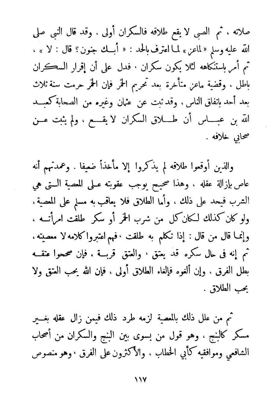 صِلَاتُهُ ثُمَّ الصَّبِيُّ لَا يَقَعُ طَلَاقُهُ فَالسَّكْرَانُ أَوْلَى وَقَدْ {قَالَ النَّبِيُّ صَلَّى اللَّهُ عَلَيْهِ وَسَلَّمَ لِمَاعِزِ لَمَّا اعْتَرَفَ بِالْحَدِّ: أَبِك جُنُونٌ؟ قَالَ: لَا ثُمَّ أَمَرَ بِاسْتِنْكَاهِهِ لِئَلَّا يَكُونَ سَكْرَانَ} فَدَلَّ عَلَى أَنَّ إقْرَارَ السَّكْرَانِ بَاطِلٌ وَقَضِيَّةُ مَاعِزٍ مُتَأَخِّرَةٌ بَعْدَ تَحْرِيمِ الْخَمْرِ فَإِنَّ الْخَمْرَ حُرِّمَتْ سَنَةَ ثَلَاثٍ بَعْدَ أُحُدٍ بِاتِّفَاقِ النَّاسِ وَقَدْ ثَبَتَ عَنْ عُثْمَانَ وَغَيْرِهِ مِنْ الصَّحَابَةِ كَعَبْدِ اللَّهِ بْنِ عَبَّاسٍ أَنَّ طَلَاقَ السَّكْرَانِ لَا يَقَعُ وَلَمْ يَثْبُتْ عَنْ صَحَابِيٍّ خِلَافُهُ. وَاَلَّذِينَ أَوْقَعُوا طَلَاقَهُ لَمْ يَذْكُرُوا إلَّا مَأْخَذًا ضَعِيفًا وَعُمْدَتُهُمْ أَنَّهُ عَاصٍ بِإِزَالَةِ عَقْلِهِ وَهَذَا صَحِيحٌ يُوجِبُ عُقُوبَتَهُ عَلَى الْمَعْصِيَةِ الَّتِي هِيَ الشُّرْبُ فَيُحَدُّ عَلَى ذَلِكَ وَأَمَّا الطَّلَاقُ فَلَا يُعَاقَبُ بِهِ مُسْلِمٌ عَلَى الْمَعْصِيَةِ وَلَوْ كَانَ كَذَلِكَ لَكَانَ كُلُّ مَنْ شَرِبَ الْخَمْرَ أَوْ سَكِرَ طَلَقَتْ امْرَأَتُهُ وَإِنَّمَا قَالَ مَنْ قَالَ: إذَا تَكَلَّمَ بِهِ طَلَقَتْ فَهُمْ اعْتَبَرُوا كَلَامَهُ لَا مَعْصِيَتَهُ ثُمَّ إنَّهُ فِي حَالِ سُكْرِهِ قَدْ يَعْتِقُ وَالْعِتْقُ قُرْبَةٌ فَإِنْ صَحَّحُوا عِتْقَهُ بَطَلَ الْفَرْقُ وَإِنْ أَلْغَوْهُ فَإِلْغَاءُ الطَّلَاقِ أَوْلَى فَإِنَّ اللَّهَ يُحِبُّ الْعِتْقَ وَلَا يُحِبُّ الطَّلَاقَ. ثُمَّ مَنْ عَلَّلَ ذَلِكَ بِالْمَعْصِيَةِ لَزِمَهُ طَرْدُ ذَلِكَ فِيمَنْ زَالَ عَقْلُهُ بِغَيْرِ مُسْكِرٍ كَالْبَنْجِ وَهُوَ قَوْلُ مَنْ يُسَوِّي بَيْنَ الْبَنْجِ وَالسَّكْرَانِ مِنْ أَصْحَابِ الشَّافِعِيِّ وَمُوَافَقِيهِ كَأَبِي الْخَطَّابِ وَالْأَكْثَرُونَ عَلَى الْفَرْقِ وَهُوَ مَنْصُوصُ