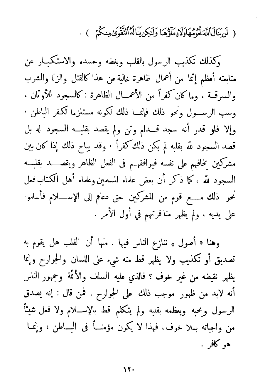 {لَنْ يَنَالَ اللَّهَ لُحُومُهَا وَلَا دِمَاؤُهَا وَلَكِنْ يَنَالُهُ التَّقْوَى مِنْكُمْ} . وَكَذَلِكَ تَكْذِيبُ الرَّسُولِ بِالْقَلْبِ وَبُغْضُهُ وَحَسَدُهُ وَالِاسْتِكْبَارُ عَنْ مُتَابَعَتِهِ أَعْظَمُ إثْمًا مِنْ أَعْمَالٍ ظَاهِرَةٍ خَالِيَةٍ عَنْ هَذَا كَالْقَتْلِ وَالزِّنَا وَالشُّرْبِ وَالسَّرِقَةِ وَمَا كَانَ كُفْرًا مِنْ الْأَعْمَالِ الظَّاهِرَةِ: كَالسُّجُودِ لِلْأَوْثَانِ وَسَبِّ الرَّسُولِ وَنَحْوِ ذَلِكَ فَإِنَّمَا ذَلِكَ لِكَوْنِهِ مُسْتَلْزِمًا لِكُفْرِ الْبَاطِنِ وَإِلَّا فَلَوْ قُدِّرَ أَنَّهُ سَجَدَ قُدَّامَ وَثَنٍ وَلَمْ يَقْصِدْ بِقَلْبِهِ السُّجُودَ لَهُ بَلْ قَصَدَ السُّجُودَ لِلَّهِ بِقَلْبِهِ لَمْ يَكُنْ ذَلِكَ كُفْرًا وَقَدْ يُبَاحُ ذَلِكَ إذَا كَانَ بَيْنَ مُشْرِكِينَ يَخَافُهُمْ عَلَى نَفْسِهِ فَيُوَافِقُهُمْ فِي الْفِعْلِ الظَّاهِرِ وَيَقْصِدُ بِقَلْبِهِ السُّجُودَ لِلَّهِ كَمَا ذُكِرَ أَنَّ بَعْضَ عُلَمَاءِ الْمُسْلِمِينَ وَعُلَمَاءِ أَهْلِ الْكِتَابِ فَعَلَ نَحْوَ ذَلِكَ مَعَ قَوْمٍ مِنْ الْمُشْرِكِينَ حَتَّى دَعَاهُمْ إلَى الْإِسْلَامِ فَأَسْلَمُوا عَلَى يَدَيْهِ وَلَمْ يُظْهِرْ مُنَافِرَتَهُمْ فِي أَوَّلِ الْأَمْرِ. وَهُنَا " أُصُولٌ " تَنَازَعَ النَّاسُ فِيهَا. مِنْهَا أَنَّ الْقَلْبَ هَلْ يَقُومُ بِهِ تَصْدِيقٌ أَوْ تَكْذِيبٌ وَلَا يَظْهَرُ قَطُّ مِنْهُ شَيْءٌ عَلَى اللِّسَانِ وَالْجَوَارِحِ وَإِنَّمَا يَظْهَرُ نَقِيضُهُ مِنْ غَيْرِ خَوْفٍ؟ فَاَلَّذِي عَلَيْهِ السَّلَفُ وَالْأَئِمَّةُ وَجُمْهُورُ النَّاسِ أَنَّهُ لَا بُدَّ مِنْ ظُهُورِ مُوجَبِ ذَلِكَ عَلَى الْجَوَارِحِ فَمَنْ قَالَ: إنَّهُ يُصَدِّقُ الرَّسُولَ وَيُحِبُّهُ وَيُعَظِّمُهُ بِقَلْبِهِ وَلَمْ يَتَكَلَّمْ قَطُّ بِالْإِسْلَامِ وَلَا فَعَلَ شَيْئًا مِنْ وَاجِبَاتِهِ بِلَا خَوْفٍ فَهَذَا لَا يَكُونُ مُؤْمِنًا فِي الْبَاطِنِ؛ وَإِنَّمَا هُوَ كَافِرٌ.
