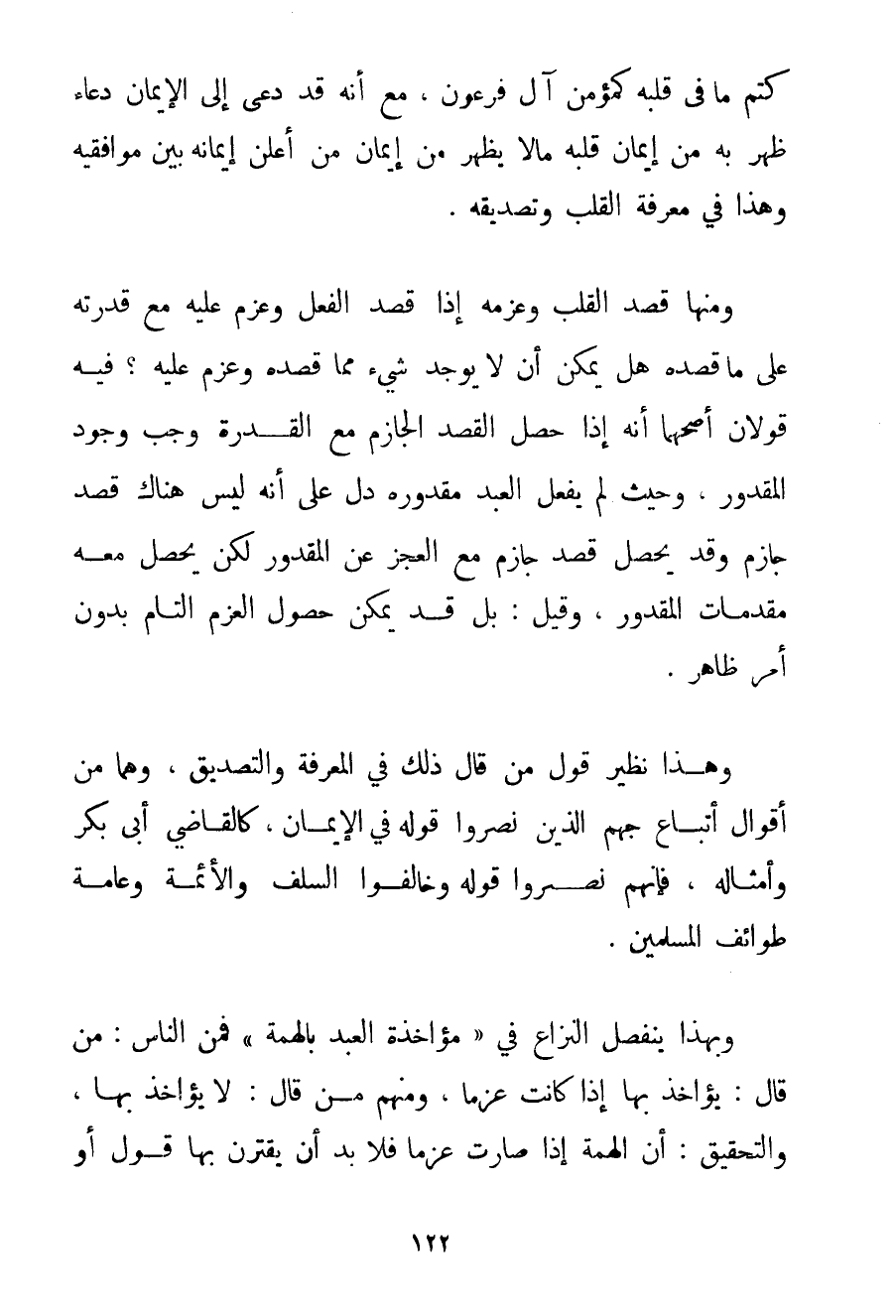 كَتَمَ مَا فِي قَلْبِهِ كَمُؤْمِنِ آلِ فِرْعَوْنَ مَعَ أَنَّهُ قَدْ دَعَا إلَى الْإِيمَانِ دُعَاءً ظَهَرَ بِهِ مِنْ إيمَانِ قَلْبِهِ مَا لَا يَظْهَرُ مِنْ إيمَانِ مَنْ أَعْلَنَ إيمَانَهُ بَيْنَ مُوَافَقِيهِ وَهَذَا فِي مَعْرِفَةِ الْقَلْبِ وَتَصْدِيقِهِ. وَمِنْهَا قَصْدُ الْقَلْبِ وَعَزْمُهُ إذَا قَصَدَ الْفِعْلَ وَعَزَمَ عَلَيْهِ مَعَ قُدْرَتِهِ عَلَى مَا قَصَدَهُ هَلْ يُمْكِنُ أَنْ لَا يُوجَدَ شَيْءٌ مِمَّا قَصَدَهُ وَعَزَمَ عَلَيْهِ؟ فِيهِ قَوْلَانِ أَصَحُّهُمَا أَنَّهُ إذَا حَصَلَ الْقَصْدُ الْجَازِمُ مَعَ الْقُدْرَةِ وَجَبَ وُجُودُ الْمَقْدُورِ وَحَيْثُ لَمْ يَفْعَلْ الْعَبْدُ مَقْدُورَهُ دَلَّ عَلَى أَنَّهُ لَيْسَ هُنَاكَ قَصْدٌ جَازِمٌ وَقَدْ يَحْصُلُ قَصْدٌ جَازِمٌ مَعَ الْعَجْزِ عَنْ الْمَقْدُورِ لَكِنْ يَحْصُلُ مَعَهُ مُقَدِّمَاتُ الْمَقْدُورِ وَقِيلَ: بَلْ قَدْ يُمْكِنُ حُصُولُ الْعَزْمِ التَّامِّ بِدُونِ أَمْرٍ ظَاهِرٍ. وَهَذَا نَظِيرُ قَوْلِ مَنْ قَالَ ذَلِكَ فِي الْمَعْرِفَةِ وَالتَّصْدِيقِ وَهُمَا مِنْ أَقْوَالِ أَتْبَاعِ جَهْمٍ الَّذِينَ نَصَرُوا قَوْلَهُ فِي الْإِيمَانِ كَالْقَاضِي أَبِي بَكْرٍ وَأَمْثَالِهِ فَإِنَّهُمْ نَصَرُوا قَوْلَهُ وَخَالَفُوا السَّلَفَ وَالْأَئِمَّةَ وَعَامَّةَ طَوَائِفِ الْمُسْلِمِينَ. وَبِهَذَا يَنْفَصِلُ النِّزَاعُ فِي " مُؤَاخَذَةِ الْعَبْدِ بالهمة " فَمِنْ النَّاسِ: مَنْ قَالَ: يُؤَاخَذُ بِهَا إذَا كَانَتْ عَزْمًا وَمِنْهُمْ مَنْ قَالَ: لَا يُؤَاخَذُ بِهَا وَالتَّحْقِيقُ: أَنَّ الْهِمَّةَ إذَا صَارَتْ عَزْمًا فَلَا بُدَّ أَنْ يَقْتَرِنَ بِهَا قَوْلٌ أَوْ