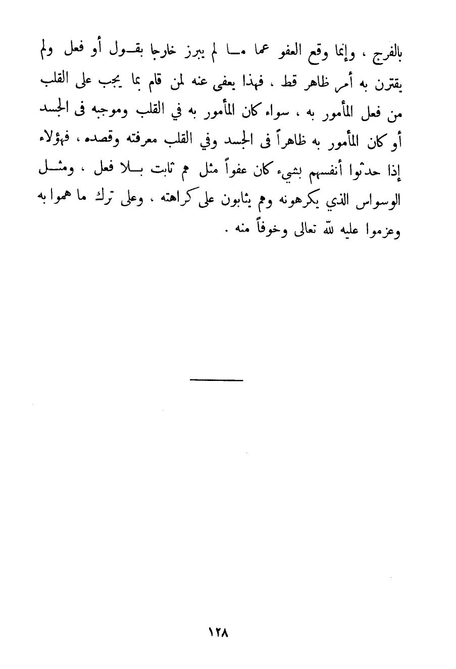 بِالْفَرْجِ وَإِنَّمَا وَقَعَ الْعَفْوُ عَمَّا مَا لَمْ يَبْرُزْ خَارِجًا بِقَوْلِ أَوْ فِعْلٍ وَلَمْ يَقْتَرِنْ بِهِ أَمْرٌ ظَاهِرٌ قَطُّ فَهَذَا يُعْفَى عَنْهُ لِمَنْ قَامَ بِمَا يَجِبُ عَلَى الْقَلْبِ مِنْ فِعْلِ الْمَأْمُورِ بِهِ سَوَاءٌ كَانَ الْمَأْمُورُ بِهِ فِي الْقَلْبِ وَمُوجَبُهُ فِي الْجَسَدِ أَوْ كَانَ الْمَأْمُورُ بِهِ ظَاهِرًا فِي الْجَسَدِ وَفِي الْقَلْبِ مَعْرِفَتُهُ وَقَصْدُهُ فَهَؤُلَاءِ إذَا حَدَّثُوا أَنْفُسَهُمْ بِشَيْءِ كَانَ عَفْوًا مِثْلُ هَمٍّ ثَابِتٍ بِلَا فِعْلٍ وَمِثْلُ الْوَسْوَاسِ الَّذِي يَكْرَهُونَهُ وَهُمْ يُثَابُونَ عَلَى كَرَاهَتِهِ وَعَلَى تَرْكِ مَا هَمُّوا بِهِ وَعَزَمُوا عَلَيْهِ لِلَّهِ تَعَالَى وَخَوْفًا مِنْهُ.
