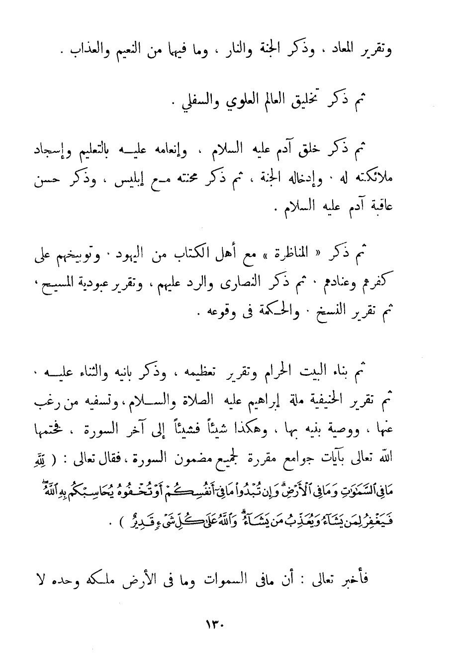 وَتَقْرِيرِ الْمَعَادِ وَذِكْرِ الْجَنَّةِ وَالنَّارِ وَمَا فِيهِمَا مِنْ النَّعِيمِ وَالْعَذَابِ. ثُمَّ ذِكْرِ تَخْلِيقِ الْعَالَمِ الْعُلْوِيِّ وَالسُّفْلِيِّ. ثُمَّ ذِكْرِ خَلْقِ آدَمَ عَلَيْهِ السَّلَامُ وَإِنْعَامِهِ عَلَيْهِ بِالتَّعْلِيمِ وَإِسْجَادِ مَلَائِكَتِهِ لَهُ وَإِدْخَالِهِ الْجَنَّةَ ثُمَّ ذِكْرِ مِحْنَتِهِ مَعَ إبْلِيسَ وَذِكْرِ حُسْنِ عَاقِبَةِ آدَمَ عَلَيْهِ السَّلَامُ. ثُمَّ ذِكْرِ " الْمُنَاظَرَةِ " مَعَ أَهْلِ الْكِتَابِ مِنْ الْيَهُودِ وَتَوْبِيخِهِمْ عَلَى كُفْرِهِمْ وَعِنَادِهِمْ ثُمَّ ذِكْرِ النَّصَارَى وَالرَّدِّ عَلَيْهِمْ وَتَقْرِيرِ عُبُودِيَّةِ الْمَسِيحِ ثُمَّ تَقْرِيرِ النَّسْخِ وَالْحِكْمَةِ فِي وُقُوعِهِ. ثُمَّ بِنَاءِ الْبَيْتِ الْحَرَامِ وَتَقْرِيرِ تَعْظِيمِهِ وَذِكْرِ بَانِيهِ وَالثَّنَاءِ عَلَيْهِ ثُمَّ تَقْرِيرِ الْحَنِيفِيَّةِ مِلَّةِ إبْرَاهِيمَ عَلَيْهِ الصَّلَاةُ وَالسَّلَامُ وَتَسْفِيهِ مَنْ رَغِبَ عَنْهَا وَوَصِيَّةِ بَنِيهِ بِهَا وَهَكَذَا شَيْئًا فَشَيْئًا إلَى آخِرِ السُّورَةِ فَخَتَمَهَا اللَّهُ تَعَالَى بِآيَاتِ جَوَامِعَ مُقَرِّرَةٍ لِجَمِيعِ مَضْمُونِ السُّورَةِ فَقَالَ تَعَالَى: {لِلَّهِ مَا فِي السَّمَاوَاتِ وَمَا فِي الْأَرْضِ وَإِنْ تُبْدُوا مَا فِي أَنْفُسِكُمْ أَوْ تُخْفُوهُ يُحَاسِبْكُمْ بِهِ اللَّهُ فَيَغْفِرُ لِمَنْ يَشَاءُ وَيُعَذِّبُ مَنْ يَشَاءُ وَاللَّهُ عَلَى كُلِّ شَيْءٍ قَدِيرٌ} . فَأَخْبَرَ تَعَالَى: أَنَّ مَا فِي السَّمَوَاتِ وَمَا فِي الْأَرْضِ مُلْكُهُ وَحْدَهُ لَا
