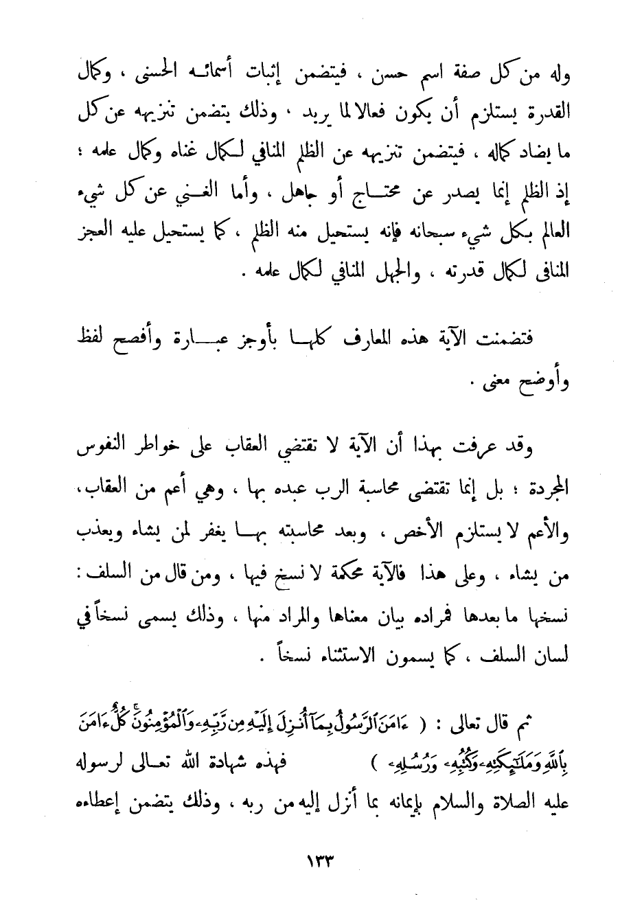 الْعُلَى وَلَهُ مِنْ كُلِّ صِفَةٍ اسْمٌ حَسَنٌ فَيَتَضَمَّنُ إثْبَاتَ أَسْمَائِهِ الْحُسْنَى وَكَمَالُ الْقُدْرَةِ يَسْتَلْزِمُ أَنْ يَكُونَ فَعَّالًا لِمَا يُرِيدُ وَذَلِكَ يَتَضَمَّنُ تَنْزِيهَهُ عَنْ كُلِّ مَا يُضَادُّ كَمَالِهِ فَيَتَضَمَّنُ تَنْزِيهَهُ عَنْ الظُّلْمِ الْمُنَافِي لِكَمَالِ غِنَاهُ وَكَمَالِ عِلْمِهِ؛ إذْ الظُّلْمُ إنَّمَا يَصْدُرُ عَنْ مُحْتَاجٍ أَوْ جَاهِلٍ وَأَمَّا الْغَنِيُّ عَنْ كُلِّ شَيْءٍ الْعَالِمُ بِكُلِّ شَيْءٍ سُبْحَانَهُ فَإِنَّهُ يَسْتَحِيلُ مِنْهُ الظُّلْمُ كَمَا يَسْتَحِيلُ عَلَيْهِ الْعَجْزُ الْمُنَافِي لِكَمَالِ قُدْرَتِهِ وَالْجَهْلُ الْمُنَافِي لِكَمَالِ عِلْمِهِ. فَتَضَمَّنَتْ الْآيَةُ هَذِهِ الْمَعَارِفَ كُلَّهَا بِأَوْجَزِ عِبَارَةٍ وَأَفْصَحِ لَفْظٍ وَأَوْضَحِ مَعْنًى. وَقَدْ عَرَفْت بِهَذَا أَنَّ الْآيَةَ لَا تَقْتَضِي الْعِقَابَ عَلَى خَوَاطِرِ النُّفُوسِ الْمُجَرَّدَةِ؛ بَلْ إنَّمَا تَقْتَضِي مُحَاسَبَةَ الرَّبِّ عَبْدَهُ بِهَا وَهِيَ أَعَمُّ مِنْ الْعِقَابِ وَالْأَعَمُّ لَا يَسْتَلْزِمُ الْأَخَصَّ وَبَعْدَ مُحَاسَبَتِهِ بِهَا يَغْفِرُ لِمَنْ يَشَاءُ وَيُعَذِّبُ مَنْ يَشَاءُ وَعَلَى هَذَا فَالْآيَةُ مُحْكَمَةٌ لَا نَسْخَ فِيهَا وَمَنْ قَالَ مِنْ السَّلَفِ: نَسَخَهَا مَا بَعْدَهَا فَمُرَادُهُ بَيَانُ مَعْنَاهَا وَالْمُرَادِ مِنْهَا وَذَلِكَ يُسَمَّى نَسْخًا فِي لِسَانِ السَّلَفِ كَمَا يُسَمُّونَ الِاسْتِثْنَاءَ نَسْخًا. ثُمَّ قَالَ تَعَالَى: {آمَنَ الرَّسُولُ بِمَا أُنْزِلَ إلَيْهِ مِنْ رَبِّهِ وَالْمُؤْمِنُونَ كُلٌّ آمَنَ بِاللَّهِ وَمَلَائِكَتِهِ وَكُتُبِهِ وَرُسُلِهِ} فَهَذِهِ شَهَادَةُ اللَّهِ تَعَالَى لِرَسُولِهِ عَلَيْهِ الصَّلَاةُ وَالسَّلَامُ بِإِيمَانِهِ بِمَا أُنْزِلَ إلَيْهِ مِنْ رَبِّهِ وَذَلِكَ يَتَضَمَّنُ إعْطَاءَهُ