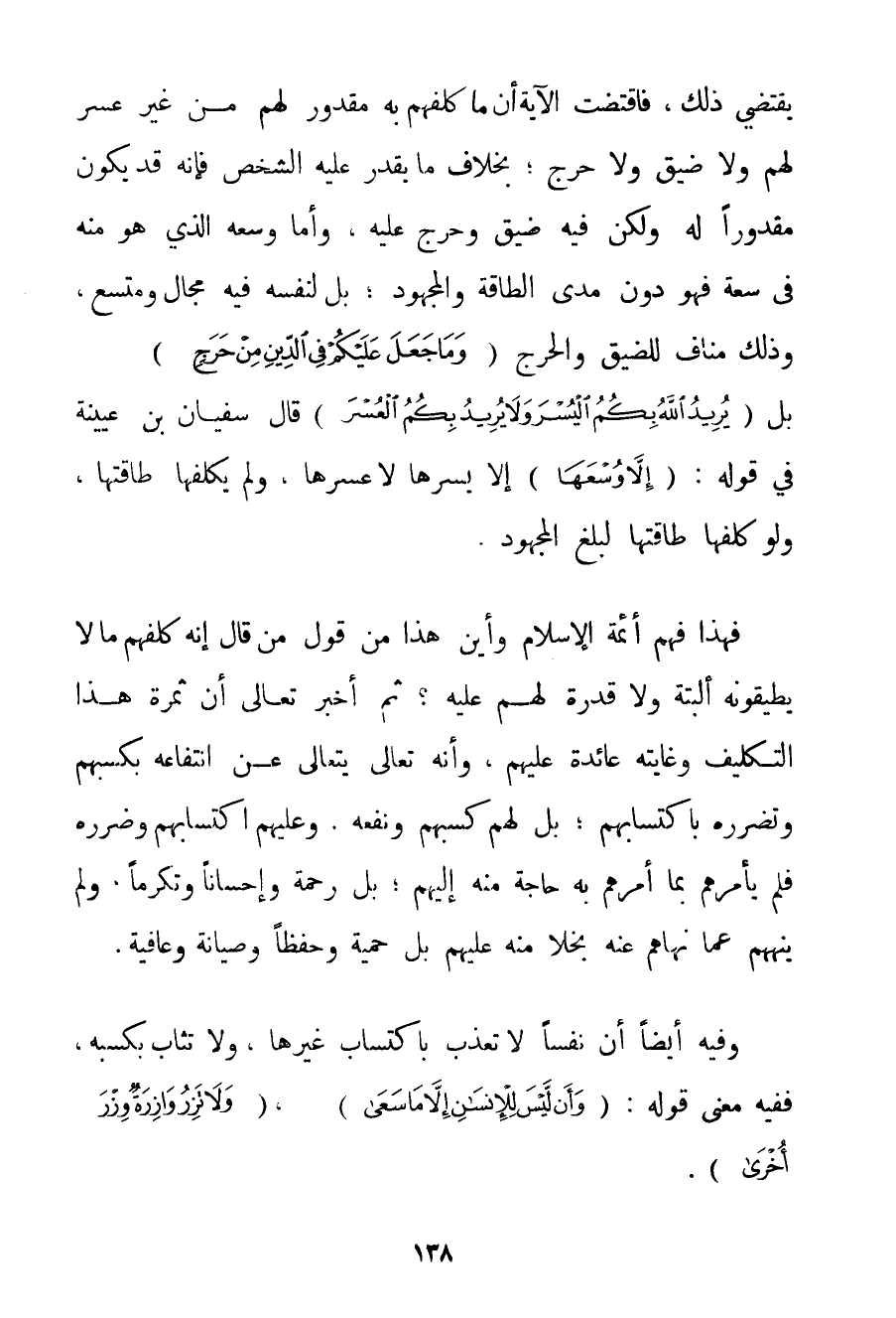 يَقْتَضِي ذَلِكَ فَاقْتَضَتْ الْآيَةُ أَنَّ مَا كَلَّفَهُمْ بِهِ مَقْدُورٌ لَهُمْ مِنْ غَيْرِ عُسْرٍ لَهُمْ وَلَا ضِيقٍ وَلَا حَرِجٍ؛ بِخِلَافِ مَا يَقْدِرُ عَلَيْهِ الشَّخْصُ فَإِنَّهُ قَدْ يَكُونُ مَقْدُورًا لَهُ وَلَكِنْ فِيهِ ضِيقٌ وَحَرَجٌ عَلَيْهِ وَأَمَّا وُسْعُهُ الَّذِي هُوَ مِنْهُ فِي سَعَةٍ فَهُوَ دُونَ مَدَى الطَّاقَةِ وَالْمَجْهُودِ؛ بَلْ لِنَفْسِهِ فِيهِ مَجَالٌ وَمُتَّسَعٌ وَذَلِكَ مُنَافٍ لِلضِّيقِ وَالْحَرَجِ {وَمَا جَعَلَ عَلَيْكُمْ فِي الدِّينِ مِنْ حَرَجٍ} بَلْ {يُرِيدُ اللَّهُ بِكُمُ الْيُسْرَ وَلَا يُرِيدُ بِكُمُ الْعُسْرَ} قَالَ سُفْيَانُ بْنُ عُيَيْنَة فِي قَوْلِهِ: {إلَّا وُسْعَهَا} إلَّا يُسْرَهَا لَا عُسْرَهَا وَلَمْ يُكَلِّفْهَا طَاقَتَهَا وَلَوْ كَلَّفَهَا طَاقَتَهَا لَبَلَغَ الْمَجْهُودُ. فَهَذَا فَهْمُ أَئِمَّةِ الْإِسْلَامِ وَأَيْنَ هَذَا مِنْ قَوْلِ مَنْ قَالَ إنَّهُ كَلَّفَهُمْ مَا لَا يُطِيقُونَهُ أَلْبَتَّةَ وَلَا قُدْرَةَ لَهُمْ عَلَيْهِ؟ ثُمَّ أَخْبَرَ تَعَالَى أَنَّ ثَمَرَةَ هَذَا التَّكْلِيفِ وَغَايَتَهُ عَائِدَةٌ عَلَيْهِمْ وَأَنَّهُ تَعَالَى يَتَعَالَى عَنْ انْتِفَاعِهِ بِكَسْبِهِمْ وَتَضَرُّرِهِ بِاكْتِسَابِهِمْ؛ بَلْ لَهُمْ كَسْبُهُمْ وَنَفْعُهُ. وَعَلَيْهِمْ اكْتِسَابُهُمْ وَضَرَرُهُ فَلَمْ يَأْمُرْهُمْ بِمَا أَمَرَهُمْ بِهِ حَاجَةً مِنْهُ إلَيْهِمْ؛ بَلْ رَحْمَةً وَإِحْسَانًا وَتَكَرُّمًا وَلَمْ يَنْهَهُمْ عَمَّا نَهَاهُمْ عَنْهُ بُخْلًا مِنْهُ عَلَيْهِمْ بَلْ حَمِيَّةً وَحِفْظًا وَصِيَانَةً وَعَافِيَةً. وَفِيهِ أَيْضًا أَنَّ نَفْسًا لَا تُعَذَّبُ بِاكْتِسَابِ غَيْرِهَا وَلَا تُثَابُ بِكَسْبِهِ فَفِيهِ مَعْنَى قَوْلِهِ: {وَأَنْ لَيْسَ لِلْإِنْسَانِ إلَّا مَا سَعَى} {وَلَا تَزِرُ وَازِرَةٌ وِزْرَ أُخْرَى} .