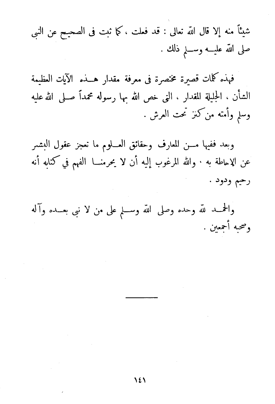 شَيْئًا مِنْهُ إلَّا قَالَ اللَّهُ تَعَالَى: قَدْ فَعَلْت كَمَا ثَبَتَ فِي الصَّحِيحِ عَنْ النَّبِيِّ صَلَّى اللَّهُ عَلَيْهِ وَسَلَّمَ ذَلِكَ. فَهَذِهِ كَلِمَاتٌ قَصِيرَةٌ مُخْتَصَرَةٌ فِي مَعْرِفَةِ مِقْدَارِ هَذِهِ الْآيَاتِ الْعَظِيمَةِ الشَّأْنِ الْجَلِيلَةِ الْمِقْدَارِ الَّتِي خَصَّ اللَّهُ بِهَا رَسُولَهُ مُحَمَّدًا صَلَّى اللَّهُ عَلَيْهِ وَسَلَّمَ وَأُمَّتَهُ مِنْ كَنْزٍ تَحْتَ الْعَرْشِ. وَبَعْدُ فَفِيهَا مِنْ الْمَعَارِفِ وَحَقَائِقِ الْعُلُومِ مَا تَعْجِزُ عُقُولُ الْبَشَرِ عَنْ الْإِحَاطَةِ بِهِ وَاَللَّهُ الْمَرْغُوبُ إلَيْهِ أَنْ لَا يَحْرِمَنَا الْفَهْمَ فِي كِتَابِهِ إنَّهُ رَحِيمٌ وَدُودٌ. وَالْحَمْدُ لِلَّهِ وَحْدَهُ وَصَلَّى اللَّهُ وَسَلَّمَ عَلَى مَنْ لَا نَبِيَّ بَعْدَهُ وَآلِهِ وَصَحْبِهِ أَجْمَعِينَ.