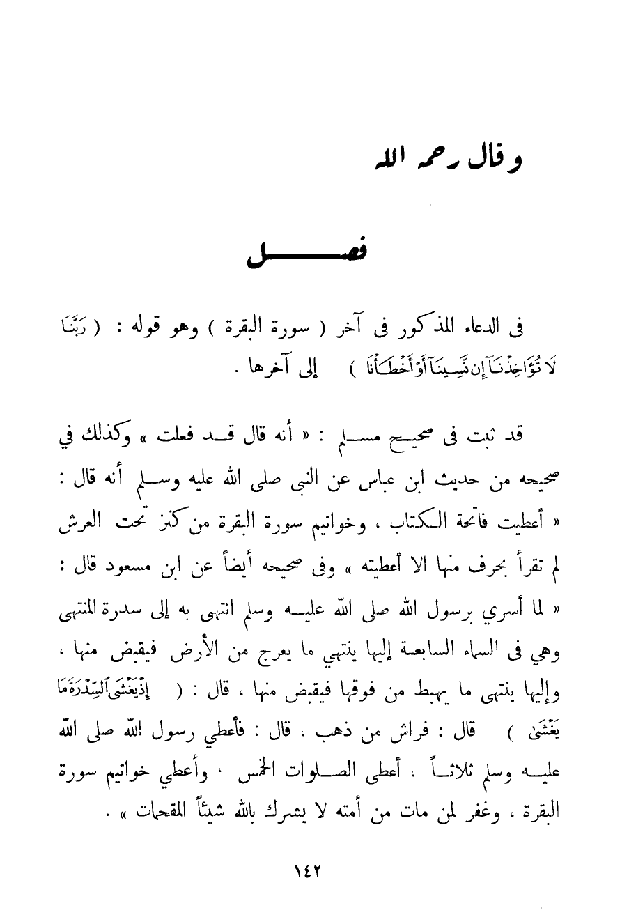 فِي الدُّعَاءِ الْمَذْكُورِ فِي آخِرِ (سُورَةِ الْبَقَرَةِ) وَهُوَ قَوْلُهُ: {رَبَّنَا لَا تُؤَاخِذْنَا إنْ نَسِينَا أَوْ أَخْطَأْنَا} إلَى آخِرِهَا. قَدْ ثَبَتَ فِي صَحِيحِ مُسْلِمٍ: {أَنَّهُ قَالَ قَدْ فَعَلْت} وَكَذَلِكَ فِي صَحِيحِهِ مِنْ حَدِيثِ ابْنِ عَبَّاسٍ عَنْ النَّبِيِّ صَلَّى اللَّهُ عَلَيْهِ وَسَلَّمَ أَنَّهُ قَالَ: {أُعْطِيت فَاتِحَةَ الْكِتَابِ وَخَوَاتِيمَ سُورَةِ الْبَقَرَةِ مِنْ كَنْزٍ تَحْتَ الْعَرْشِ لَمْ تَقْرَأْ بِحَرْفِ مِنْهَا إلَّا أُعْطِيته} وَفِي صَحِيحِهِ أَيْضًا عَنْ ابْنِ مَسْعُودٍ قَالَ: {لَمَّا أُسْرِيَ بِرَسُولِ اللَّهِ صَلَّى اللَّهُ عَلَيْهِ وَسَلَّمَ اُنْتُهِيَ بِهِ إلَى سِدْرَةِ الْمُنْتَهَى وَهِيَ فِي السَّمَاءِ السَّابِعَةِ إلَيْهَا يَنْتَهِي مَا يَعْرُجُ مِنْ الْأَرْضِ فَيُقْبَضُ مِنْهَا وَإِلَيْهَا يَنْتَهِي مَا يَهْبِطُ مِنْ فَوْقِهَا فَيُقْبَضُ مِنْهَا قَالَ: {إذْ يَغْشَى السِّدْرَةَ مَا يَغْشَى} قَالَ: فِرَاشٌ مِنْ ذَهَبٍ قَالَ: فَأُعْطِي رَسُولُ اللَّهِ صَلَّى اللَّهُ عَلَيْهِ وَسَلَّمَ ثَلَاثًا أُعْطِيَ الصَّلَوَاتِ الْخَمْسَ وَأُعْطِيَ خَوَاتِيمَ سُورَةِ الْبَقَرَةِ وَغُفِرَ لِمَنْ مَاتَ مِنْ أُمَّتِهِ لَا يُشْرِكُ بِاَللَّهِ شَيْئًا الْمُقْحِمَاتُ} .