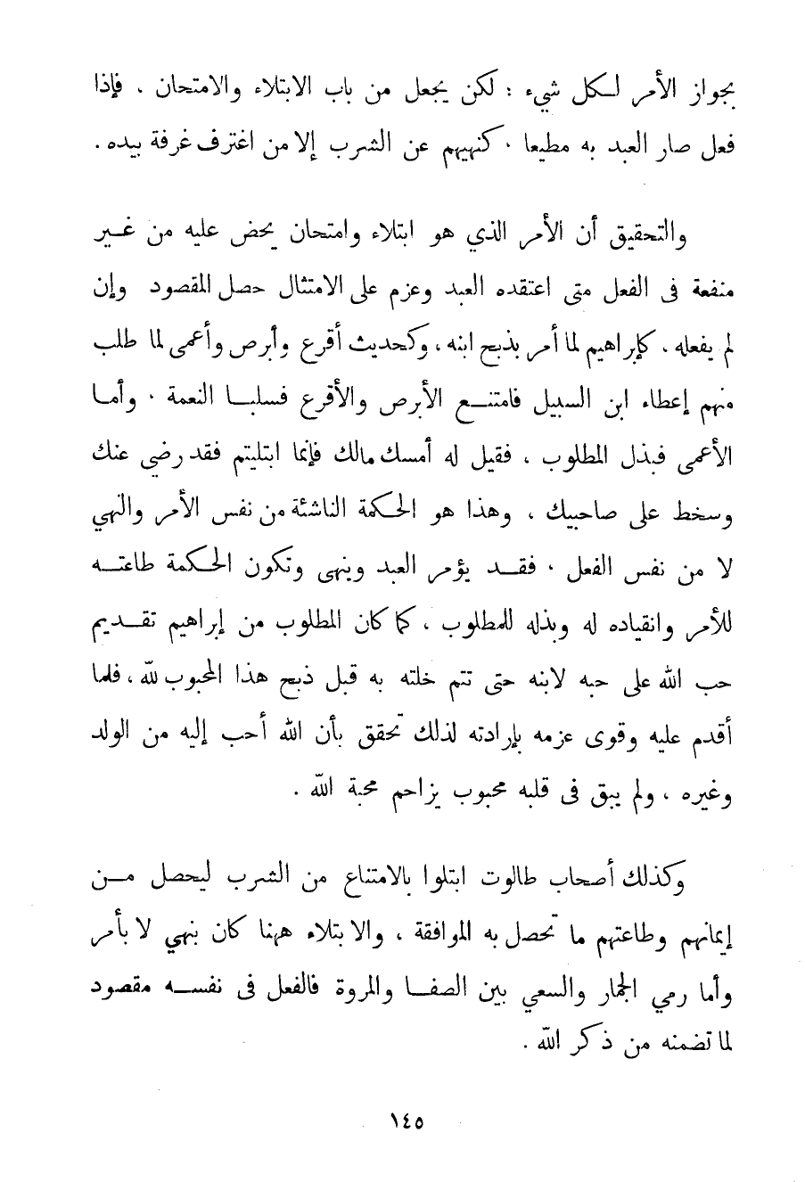 بِجَوَازِ الْأَمْرِ لِكُلِّ شَيْءٍ؛ لَكِنْ يُجْعَلُ مِنْ بَابِ الِابْتِلَاءِ وَالِامْتِحَانِ فَإِذَا فُعِلَ صَارَ الْعَبْدُ بِهِ مُطِيعًا كَنَهْيِهِمْ عَنْ الشُّرْبِ إلَّا مَنْ اغْتَرَفَ غَرْفَةً بِيَدِهِ. وَالتَّحْقِيقُ أَنَّ الْأَمْرَ الَّذِي هُوَ ابْتِلَاءٌ وَامْتِحَانٌ يُحَضُّ عَلَيْهِ مِنْ غَيْرِ مَنْفَعَةٍ فِي الْفِعْلِ مَتَى اعْتَقَدَهُ الْعَبْدُ وَعَزَمَ عَلَى الِامْتِثَالِ حَصَلَ الْمَقْصُودُ وَإِنْ لَمْ يَفْعَلْهُ كَإِبْرَاهِيمَ لَمَّا أُمِرَ بِذَبْحِ ابْنِهِ وَكَحَدِيثِ أَقْرَعَ وَأَبْرَصَ وَأَعْمَى لَمَّا طُلِبَ مِنْهُمْ إعْطَاءُ ابْنِ السَّبِيلِ فَامْتَنَعَ الْأَبْرَصُ وَالْأَقْرَعُ فَسُلِبَا النِّعْمَةَ وَأَمَّا الْأَعْمَى فَبَذَلَ الْمَطْلُوبَ فَقِيلَ لَهُ أَمْسِكْ مَالَك فَإِنَّمَا اُبْتُلِيتُمْ فَقَدْ رَضِيَ عَنْك وَسَخِطَ عَلَى صَاحِبَيْك وَهَذَا هُوَ الْحِكْمَةُ النَّاشِئَةُ مِنْ نَفْسِ الْأَمْرِ وَالنَّهْيِ لَا مِنْ نَفْسِ الْفِعْلِ فَقَدْ يُؤْمَرُ الْعَبْدُ وَيُنْهَى وَتَكُونُ الْحِكْمَةُ طَاعَتَهُ لِلْأَمْرِ وَانْقِيَادَهُ لَهُ وَبَذْلَهُ لِلْمَطْلُوبِ كَمَا كَانَ الْمَطْلُوبُ مِنْ إبْرَاهِيمَ تَقْدِيمَ حُبِّ اللَّهِ عَلَى حُبِّهِ لِابْنِهِ حَتَّى تَتِمَّ خُلَّتُهُ بِهِ قَبْلَ ذَبْحِ هَذَا الْمَحْبُوبِ لِلَّهِ فَلَمَّا أَقْدَمَ عَلَيْهِ وَقَوِيَ عَزْمُهُ بِإِرَادَتِهِ لِذَلِكَ تَحَقَّقَ بِأَنَّ اللَّهَ أَحَبُّ إلَيْهِ مِنْ الْوَلَدِ وَغَيْرِهِ وَلَمْ يَبْقَ فِي قَلْبِهِ مَحْبُوبٌ يُزَاحِمُ مُحِبَّةَ اللَّهِ. وَكَذَلِكَ أَصْحَابُ طَالُوتَ اُبْتُلُوا بِالِامْتِنَاعِ مِنْ الشُّرْبِ لِيَحْصُلَ مِنْ إيمَانِهِمْ وَطَاعَتِهِمْ مَا تَحْصُلُ بِهِ الْمُوَافَقَةُ وَالِابْتِلَاءُ هَاهُنَا كَانَ بِنَهْيٍ لَا بِأَمْرِ وَأَمَّا رَمْيُ الْجِمَارِ وَالسَّعْيُ بَيْنَ الصَّفَا وَالْمَرْوَةِ فَالْفِعْلُ فِي نَفْسِهِ مَقْصُودٌ لِمَا تَضَمَّنَهُ مِنْ ذِكْرِ اللَّهِ.