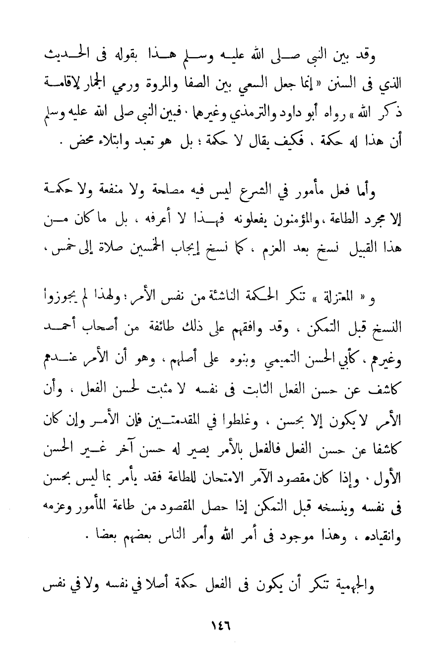وَقَدْ بَيَّنَ النَّبِيُّ صَلَّى اللَّهُ عَلَيْهِ وَسَلَّمَ هَذَا بِقَوْلِهِ فِي الْحَدِيثِ الَّذِي فِي السُّنَنِ {إنَّمَا جُعِلَ السَّعْيُ بَيْن الصَّفَا وَالْمَرْوَةِ وَرَمْيِ الْجِمَارِ لِإِقَامَةِ ذِكْرِ اللَّهِ} رَوَاهُ أَبُو دَاوُد وَالتِّرْمِذِي وَغَيْرُهُمَا فَبَيَّنَ النَّبِيُّ صَلَّى اللَّهُ عَلَيْهِ وَسَلَّمَ أَنَّ هَذَا لَهُ حِكْمَةٌ فَكَيْفَ يُقَالُ لَا حِكْمَةَ؛ بَلْ هُوَ تَعَبُّدٌ وَابْتِلَاءٌ مَحْضٌ. وَأَمَّا فِعْلُ مَأْمُورٍ فِي الشَّرْعِ لَيْسَ فِيهِ مَصْلَحَةٌ وَلَا مَنْفَعَةٌ وَلَا حِكْمَةٌ إلَّا مُجَرَّدَ الطَّاعَةِ وَالْمُؤْمِنُونَ يَفْعَلُونَهُ فَهَذَا لَا أَعْرِفُهُ بَلْ مَا كَانَ مِنْ هَذَا الْقَبِيلِ نُسِخَ بَعْدَ الْعَزْمِ كَمَا نُسِخَ إيجَابُ الْخَمْسِينَ صَلَاةً إلَى خَمْسٍ. و " الْمُعْتَزِلَةُ " تُنْكِرُ الْحِكْمَةَ النَّاشِئَةَ مِنْ نَفْسِ الْأَمْرِ؛ وَلِهَذَا لَمْ يُجَوِّزُوا النَّسْخَ قَبْلَ التَّمَكُّنِ وَقَدْ وَافَقَهُمْ عَلَى ذَلِكَ طَائِفَةٌ مِنْ أَصْحَابِ أَحْمَد وَغَيْرُهُمْ كَأَبِي الْحَسَنِ التَّمِيمِيِّ وَبَنَوْهُ عَلَى أَصْلِهِمْ وَهُوَ أَنَّ الْأَمْرَ عِنْدَهُمْ كَاشِفٌ عَنْ حُسْنِ الْفِعْلِ الثَّابِتِ فِي نَفْسِهِ لَا مُثْبِتٌ لِحُسْنِ الْفِعْلِ وَأَنَّ الْأَمْرَ لَا يَكُونُ إلَّا بِحُسْنِ وَغَلِطُوا فِي الْمُقَدَّمَتَيْنِ فَإِنَّ الْأَمْرَ وَإِنْ كَانَ كَاشِفًا عَنْ حُسْنِ الْفِعْلِ فَالْفِعْلُ بِالْأَمْرِ يَصِيرُ لَهُ حُسْنٌ آخَرُ غَيْرُ الْحُسْنِ الْأَوَّلِ وَإِذَا كَانَ مَقْصُودُ الْآمِرِ الِامْتِحَانَ لِلطَّاعَةِ فَقَدْ يَأْمُرُ بِمَا لَيْسَ بِحُسْنِ فِي نَفْسِهِ وَيَنْسَخُهُ قَبْلَ التَّمَكُّنِ إذَا حَصَلَ الْمَقْصُودُ مِنْ طَاعَةِ الْمَأْمُورِ وَعَزْمِهِ وَانْقِيَادِهِ وَهَذَا مَوْجُودٌ فِي أَمْرِ اللَّهِ وَأَمْرِ النَّاسِ بَعْضَهُمْ بَعْضًا. وَالْجَهْمِيَّة تُنْكِرُ أَنْ يَكُونَ فِي الْفِعْلِ حِكْمَةٌ أَصْلًا فِي نَفْسِهِ وَلَا فِي نَفْسِ